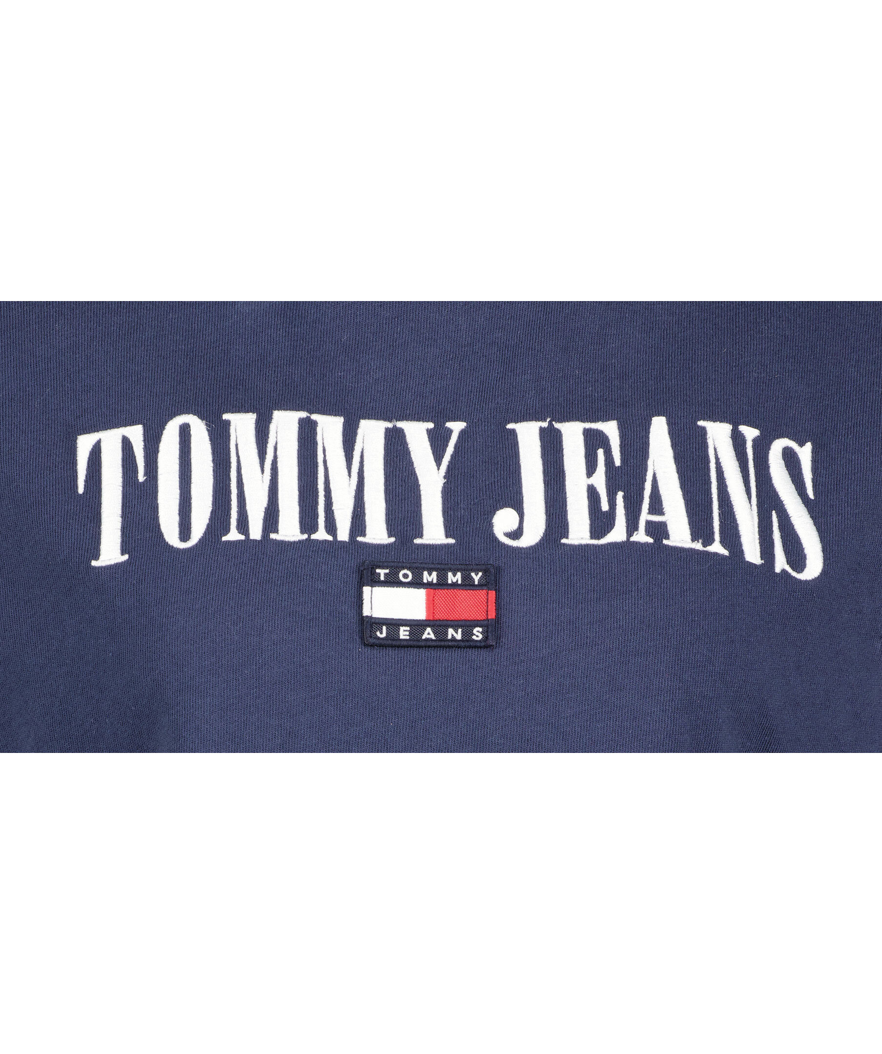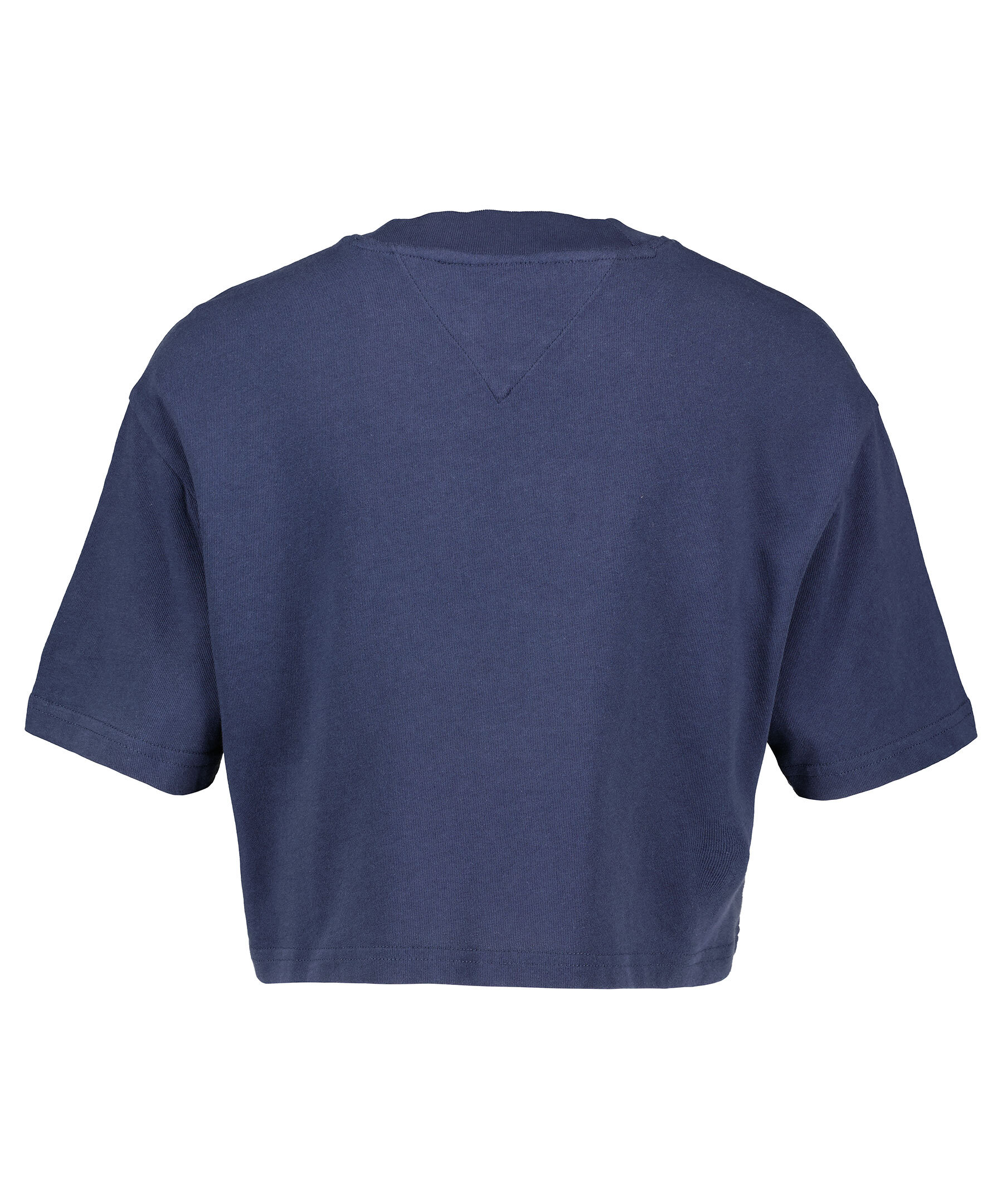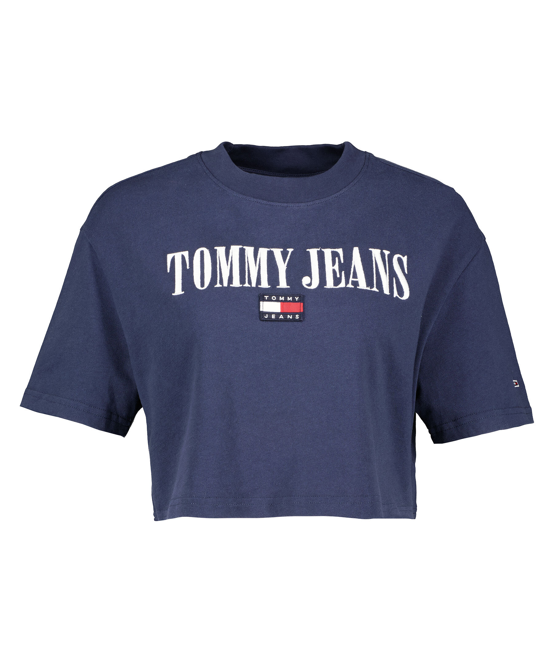 Blå croppad t-shirt från Tommy Jeans. Toppen är gjord i bomull och har en stor broderad logotyp på bröstet. Liten Tommy-flagga på ena armen. Ribbad mudd vid halsringningen.