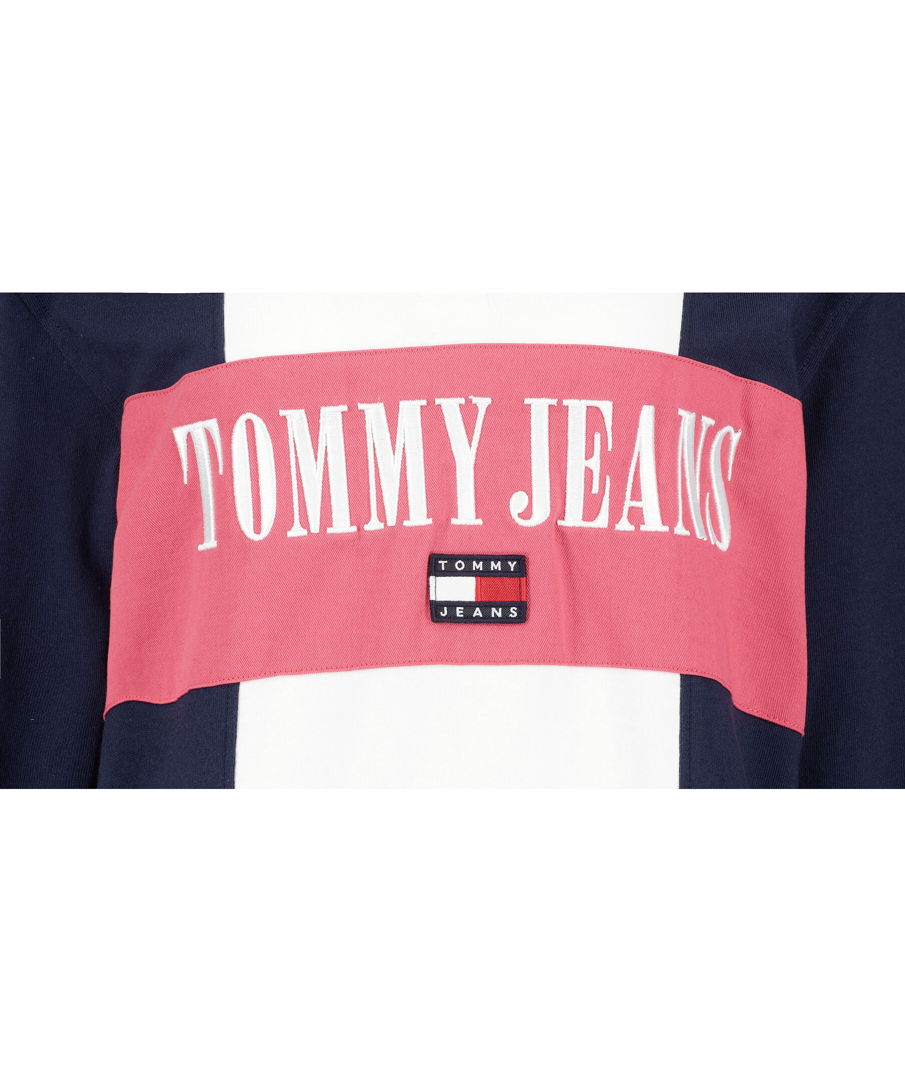 Blockfärgad rugbyinspirerad tröja från Tommy Jeans. Tröjan går i blått, vitt och rosa. Stor broderad logotyp och patch på tröjans framsida. Elastisk ribbstickad mudd vid ärmslutet. Avslappnad och något oversized passform.