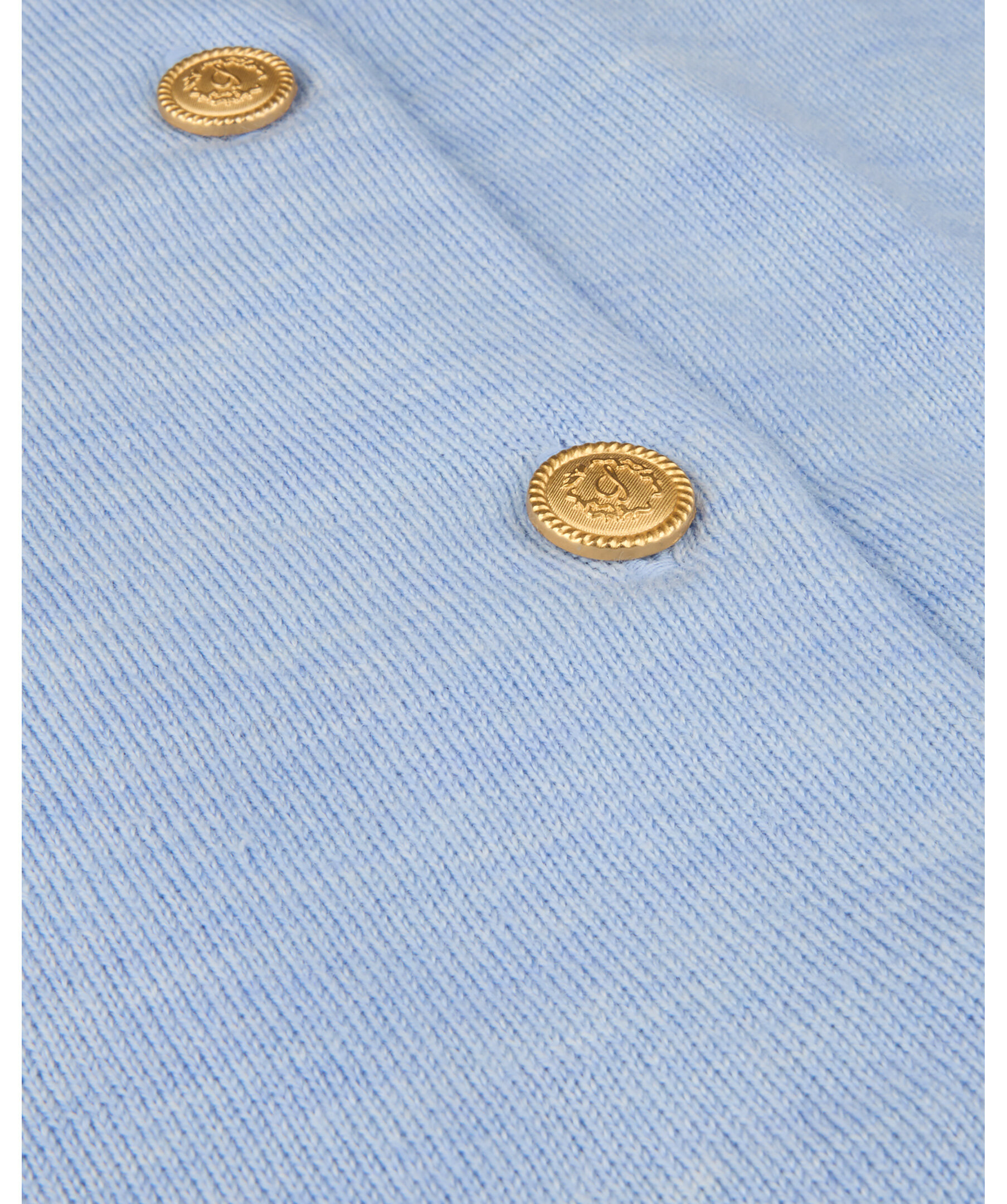 Blå kofta tillverkad av merinoull och har guldiga knappar, korta ärmar samt ribbstickade plaggslut.