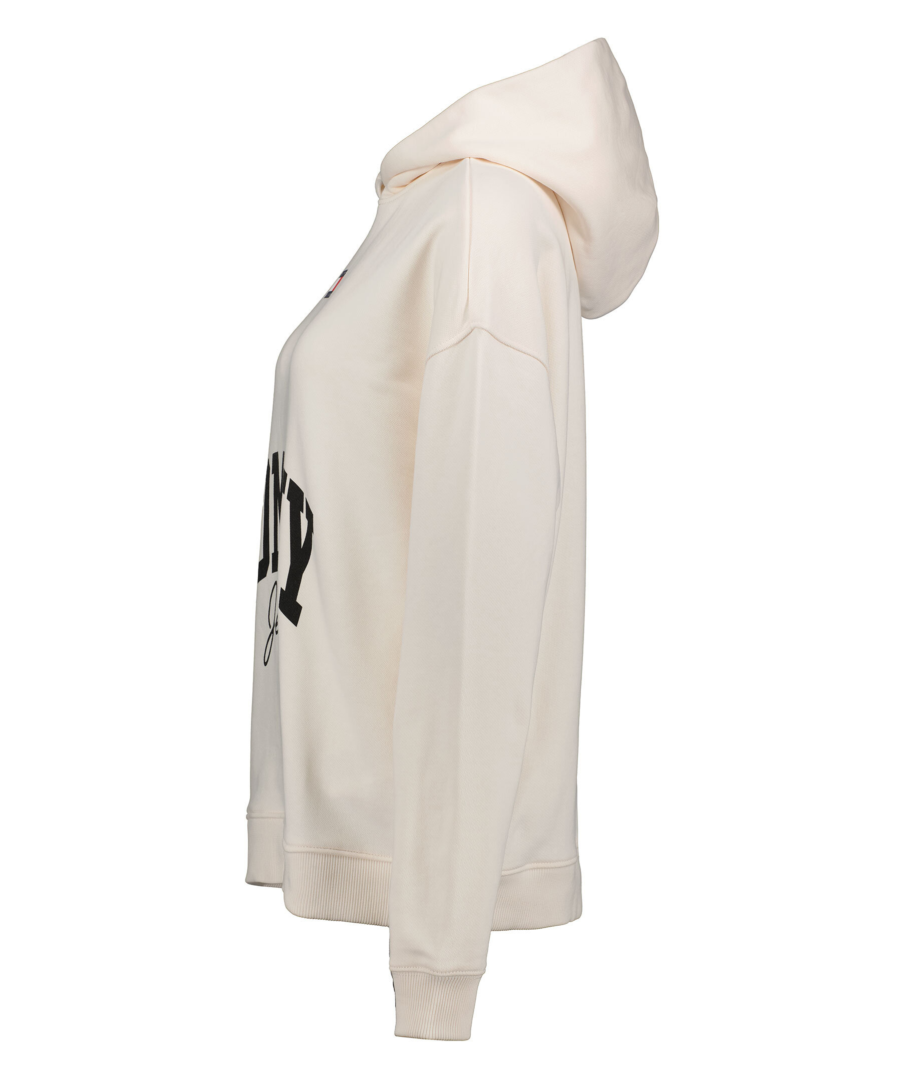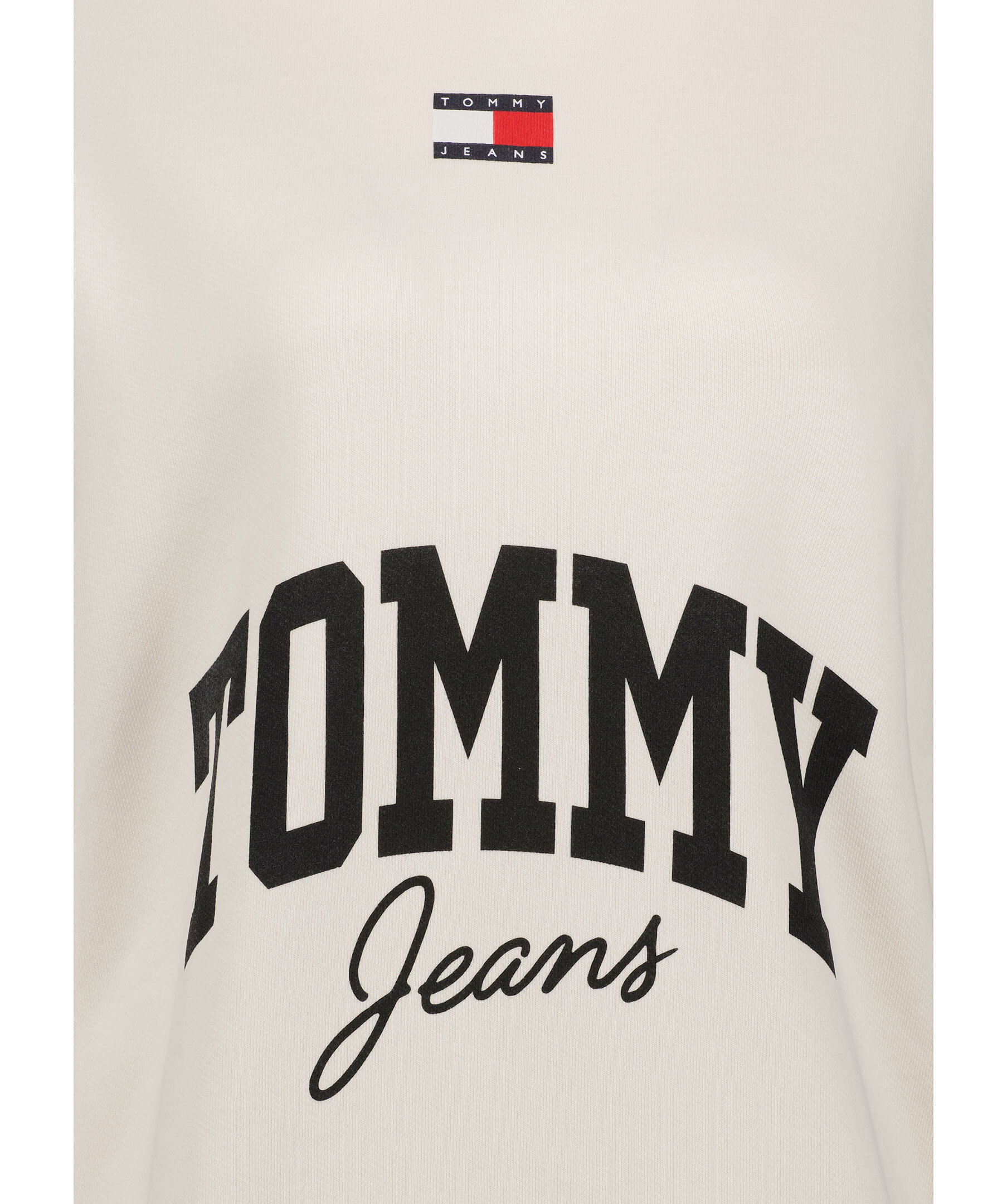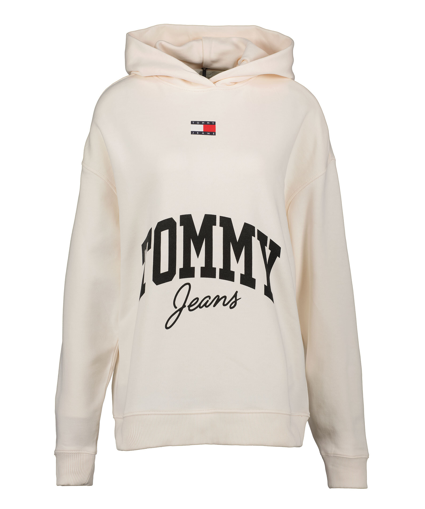 Benvit hoodie från Tommy Jeans. Tillverkad i 100% bomull. Tröjan har ett svart logotyptryck på magen av tröjan. Tryckt logotyp på bröstkorgen. Ribbstickad halsring och muddar vid ärm- och plaggslut. Avslappnad passform.