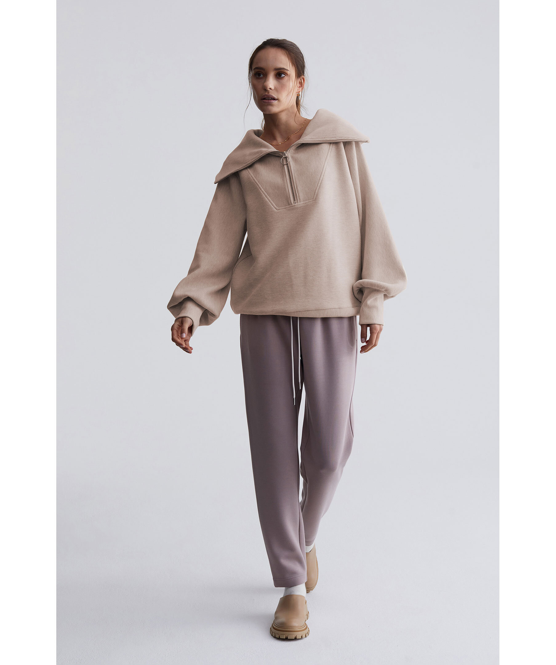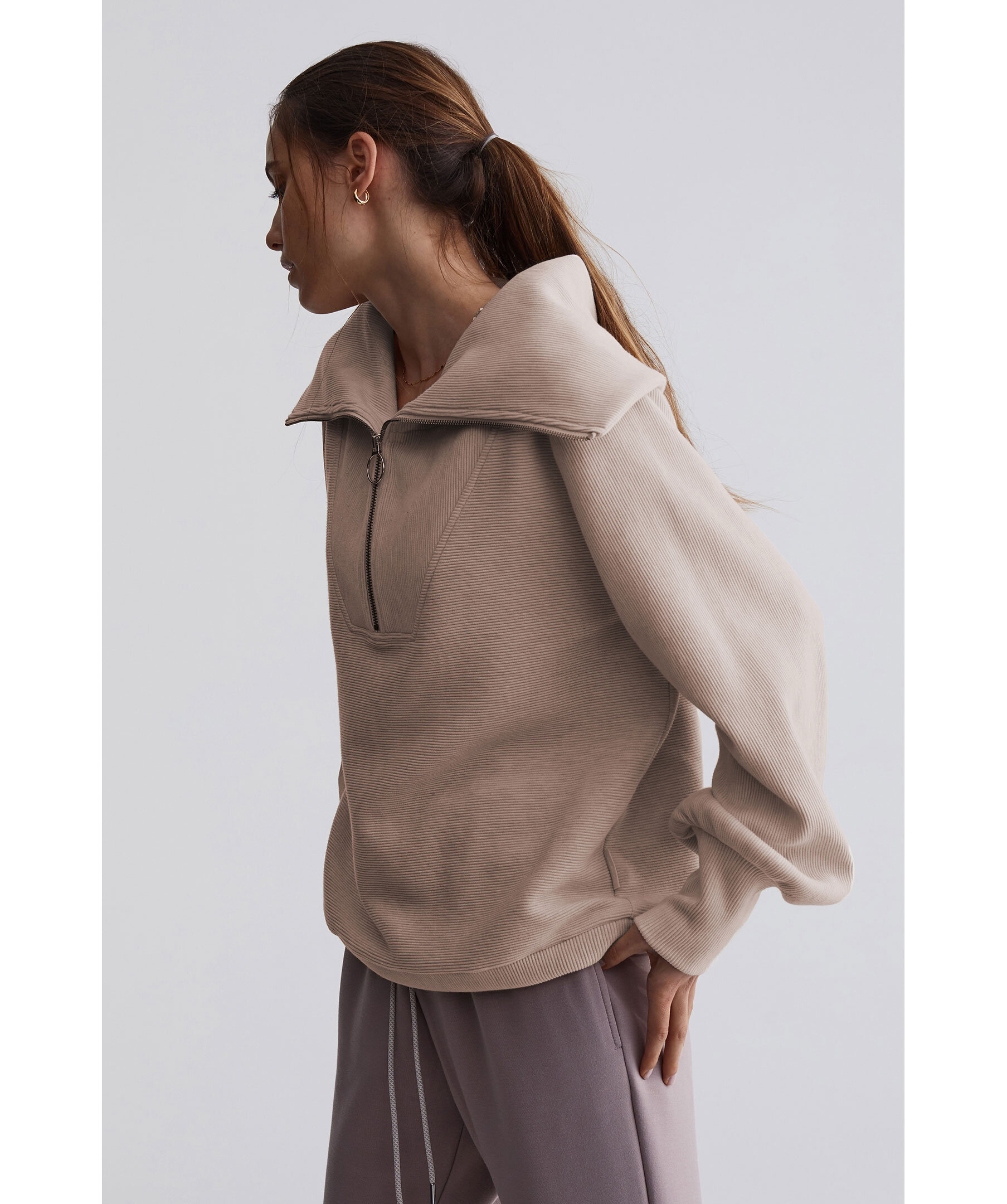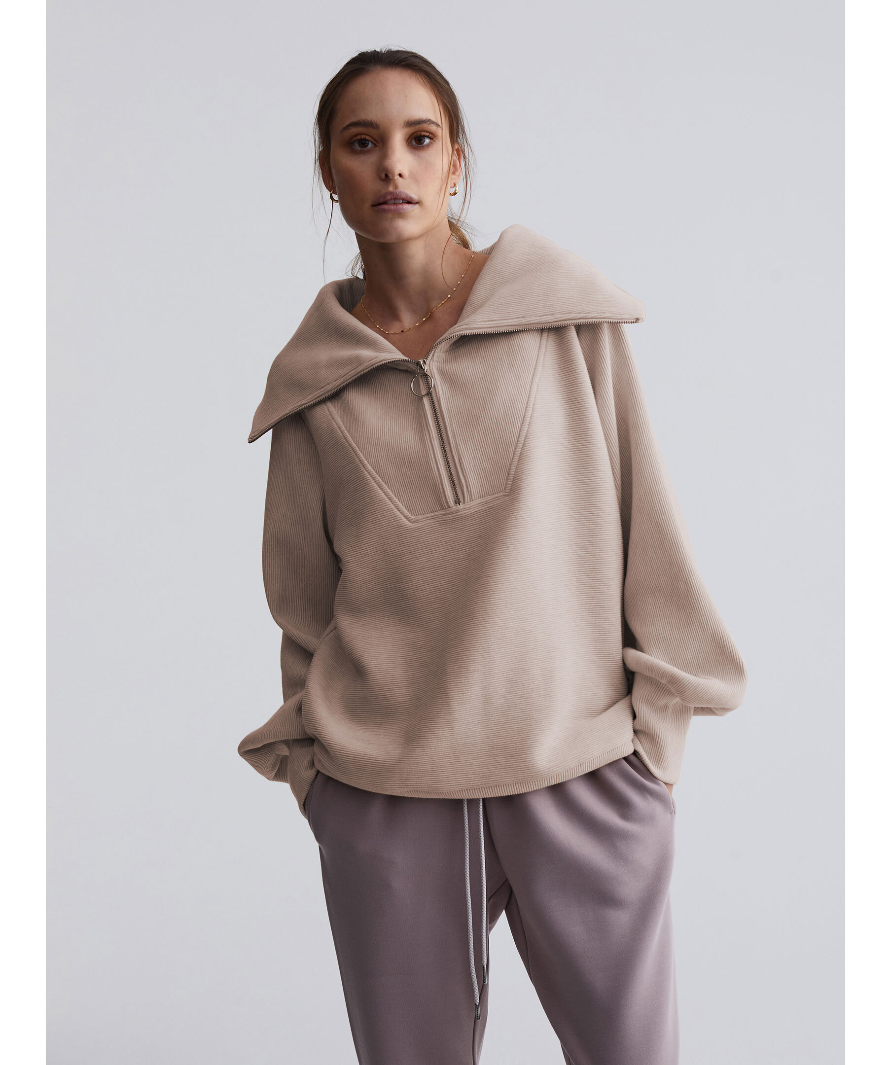 Beige, ribbstickad tröja med halvt blixtlås från Varley. Hög, överdimensionerad krage, vida ärmar och en modern dragkedja på kragen. Breda muddar i ärmslut och plaggslut.