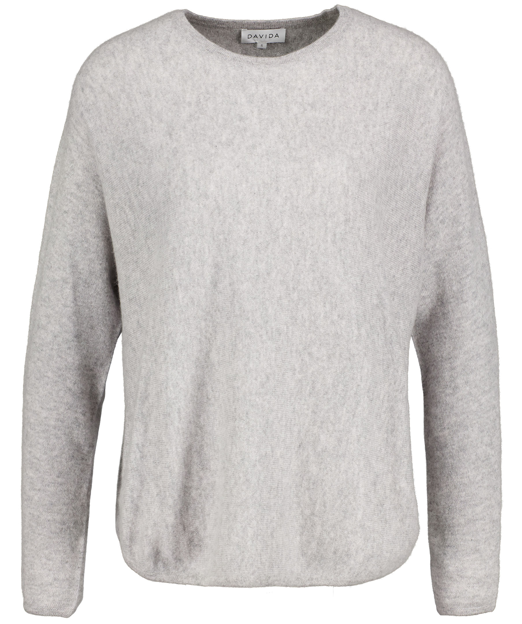 Ljusgrå melerad, finstickad tröja i en avslappnad passform från Davida Cashmere. Tillverkad i 100% mjukt kashmir. Tröjan har slits i sidorna och har rundade kanter nertill. Har rundad halsringning och smala ärmar.