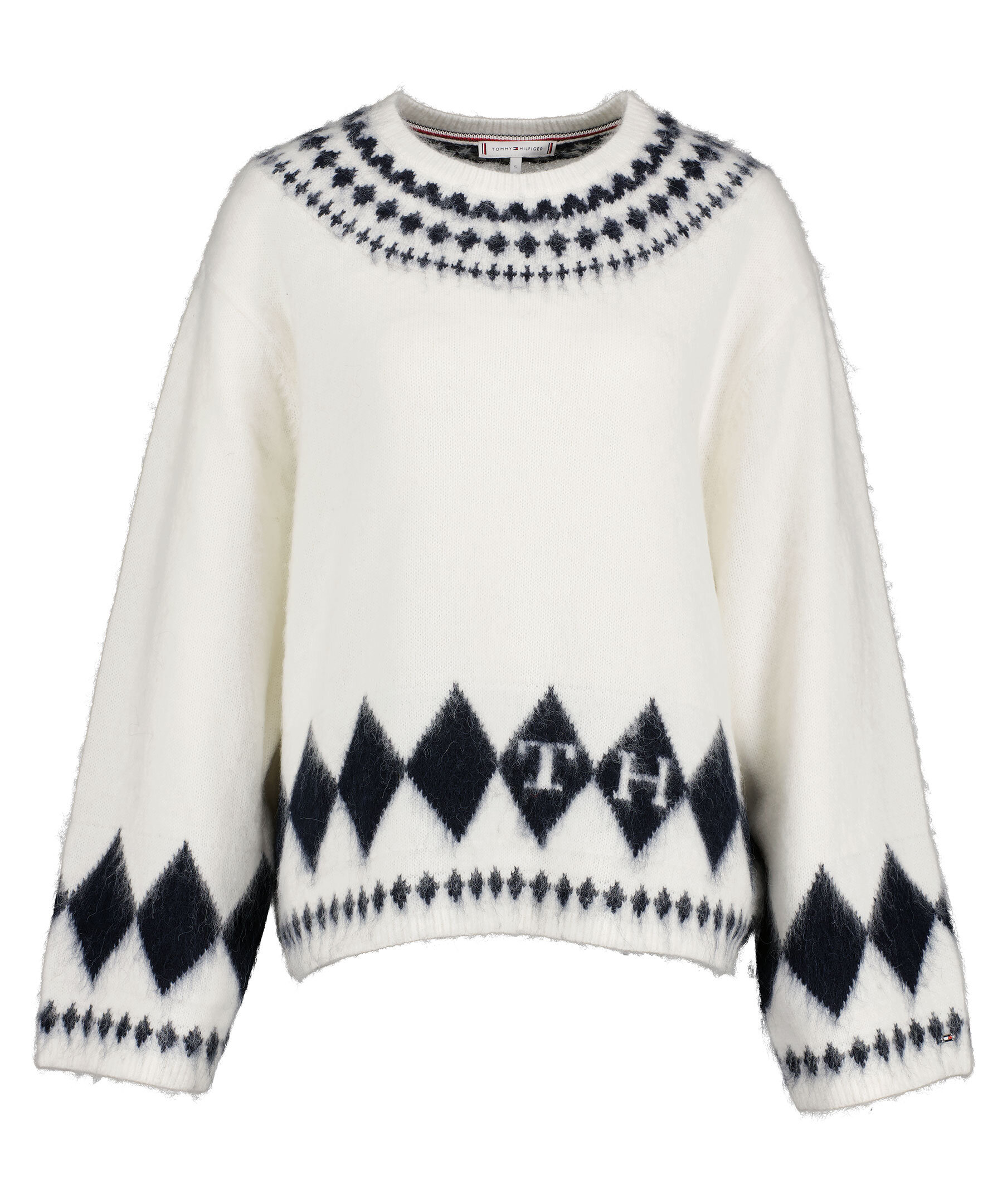 Vit ullstickad tröja från Tommy Hilfiger. Denna mysiga tröja i ullblandning är skuren i en rymlig oversized passform och har ett djärvt Fair Isle-mönster med monogram. Crew neck coh TH monogram på framsidan samt Tommy Hilfiger flagga på manschetten. Något tappade axlar.