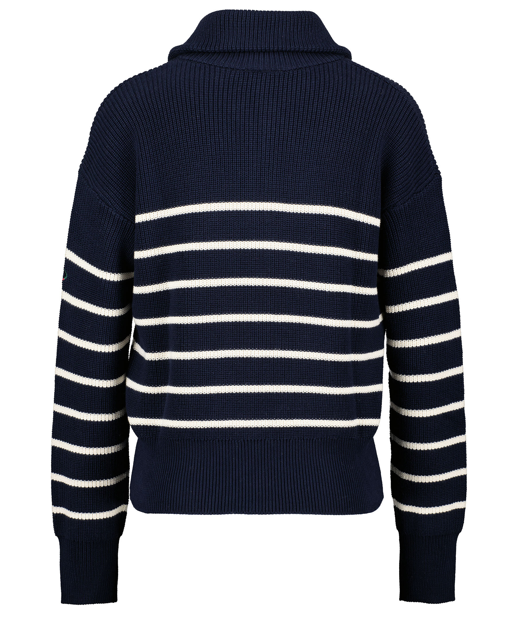 Marinblå och vitrandig ribbstickad tröja från Boomerang. Tröjan har en polokrage med halvzip. Tröjan är patentstickad i mjuk ekologisk bomull som är spunnet hos ett italienskt väveri. Tröjan har en broderad logo på vänster ärm och sköna stickade muddar i ärm- och tröjslut.
