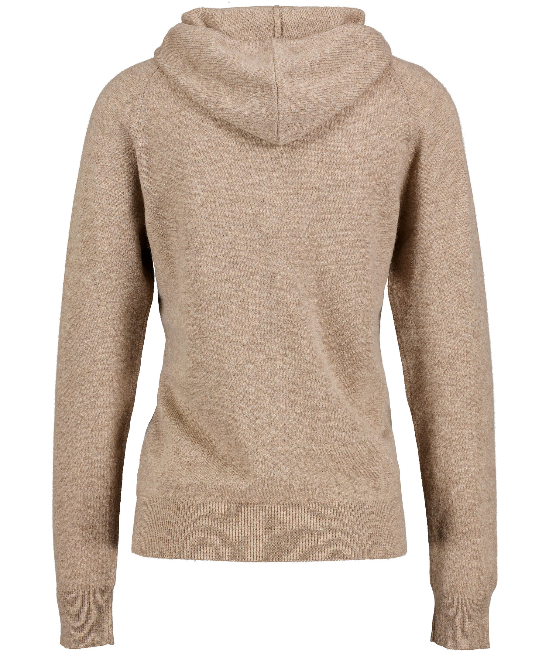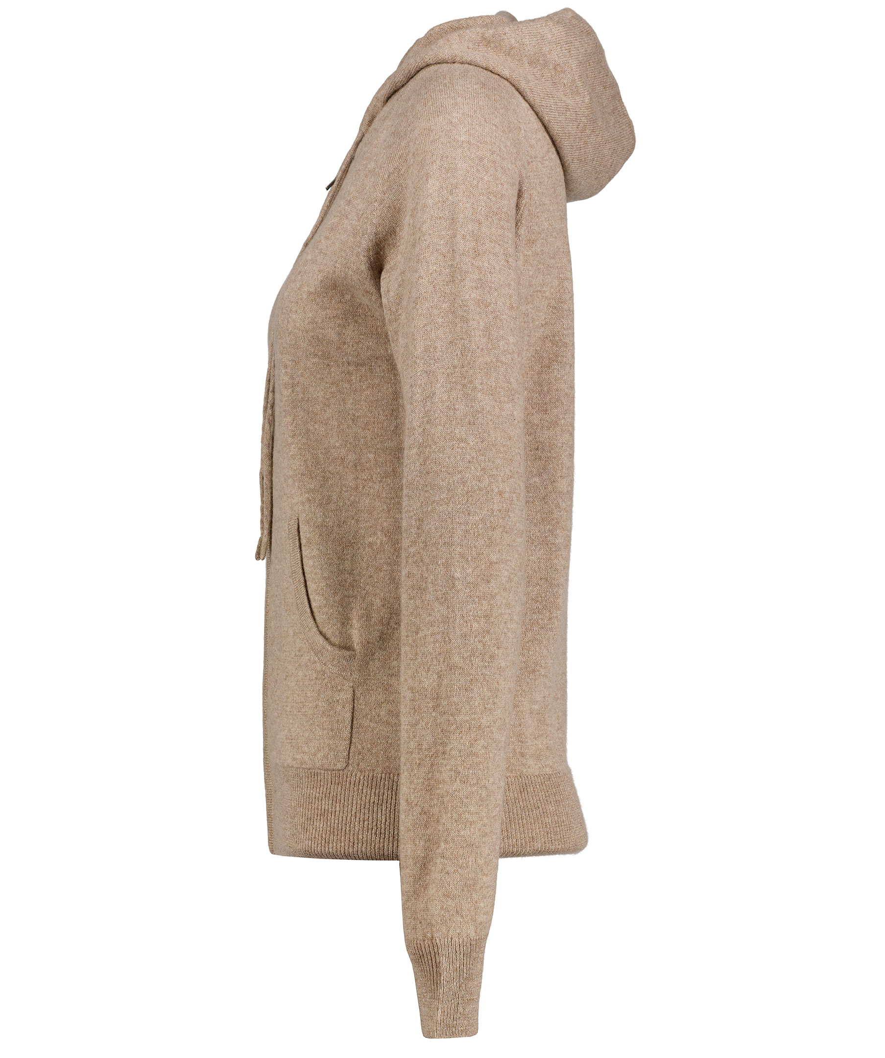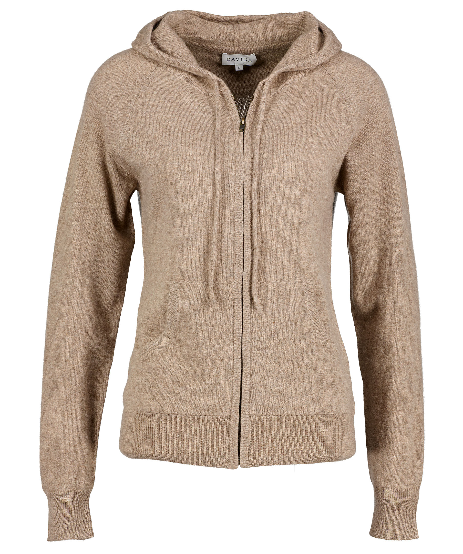 Mörkbeige finstickad hoodie i 100% kashmir från Davida. Normal passform, ribbstickad mudd i plaggslut och vid ärmslut. Stängs med dold dragkedja, har två framfickor och snörning i luvan.