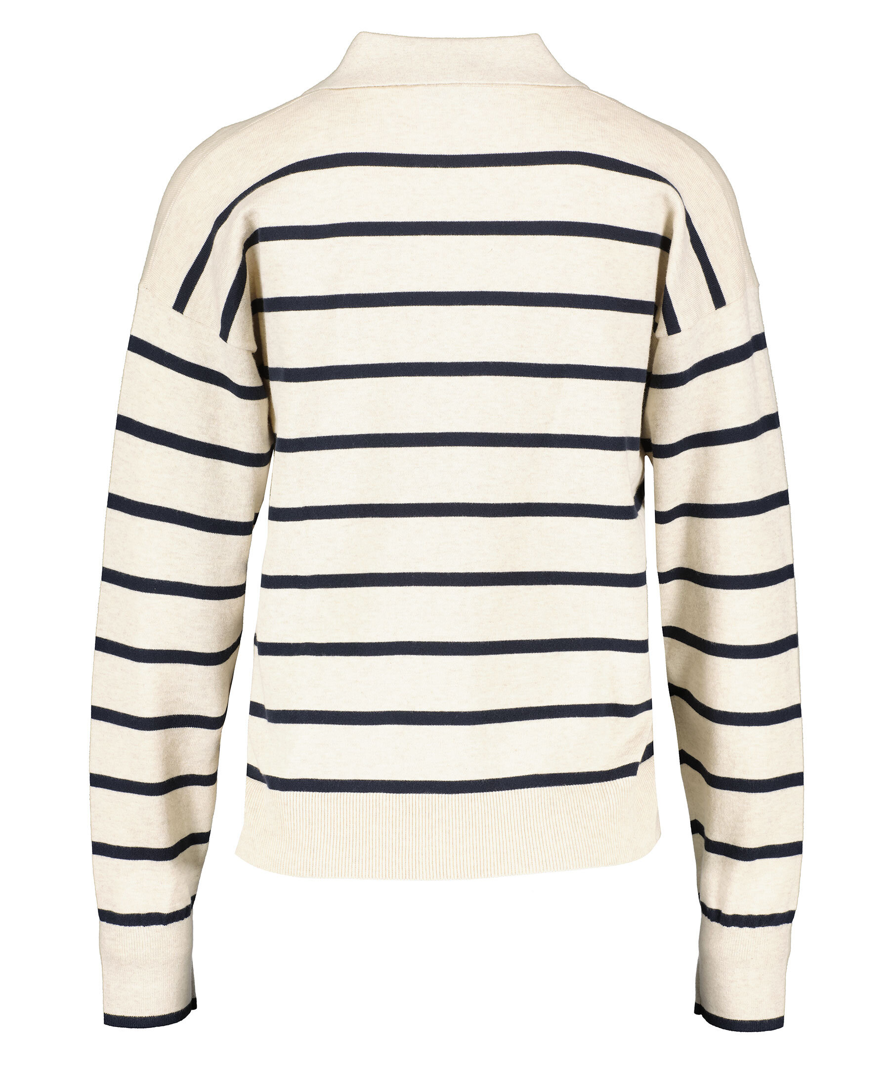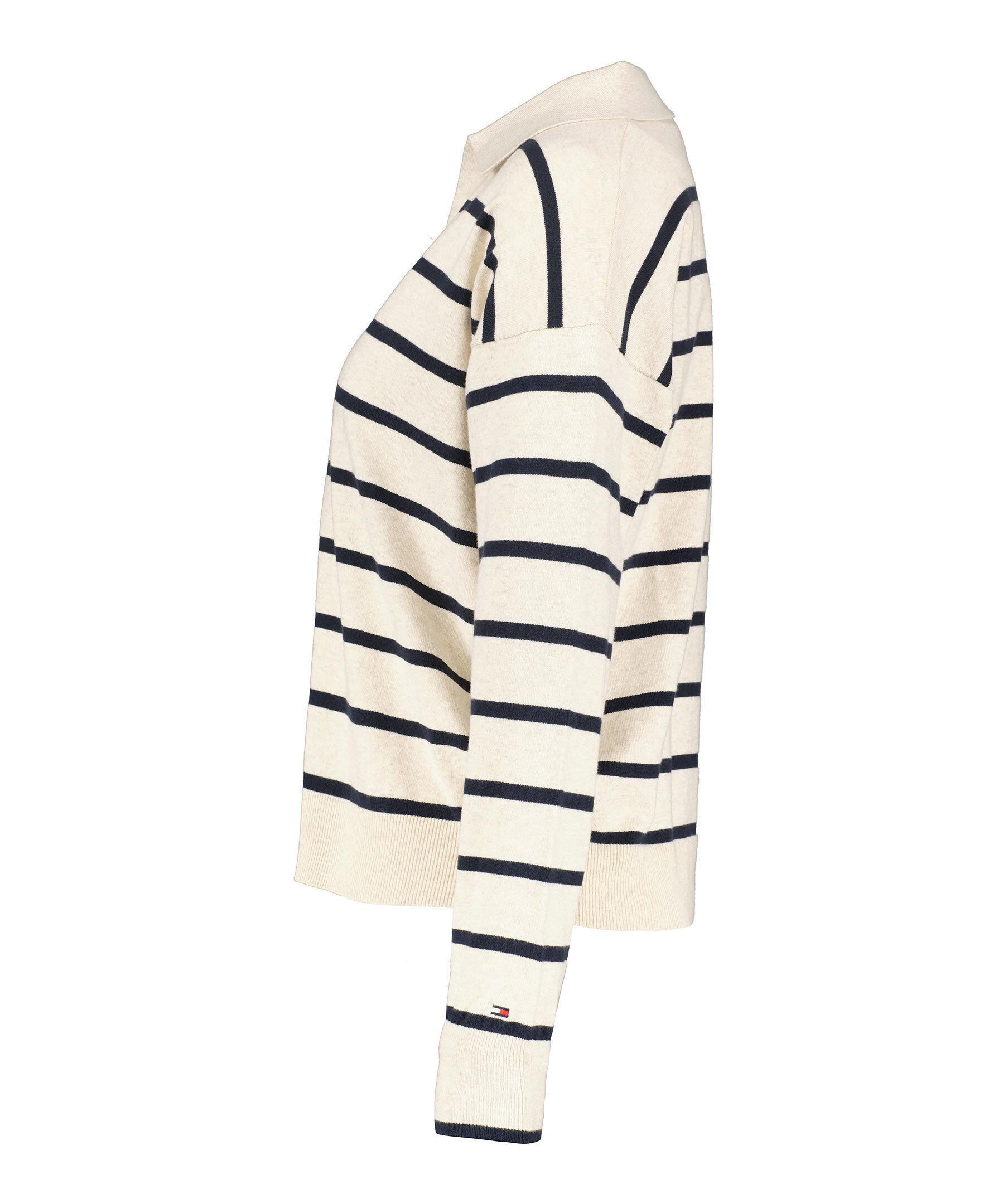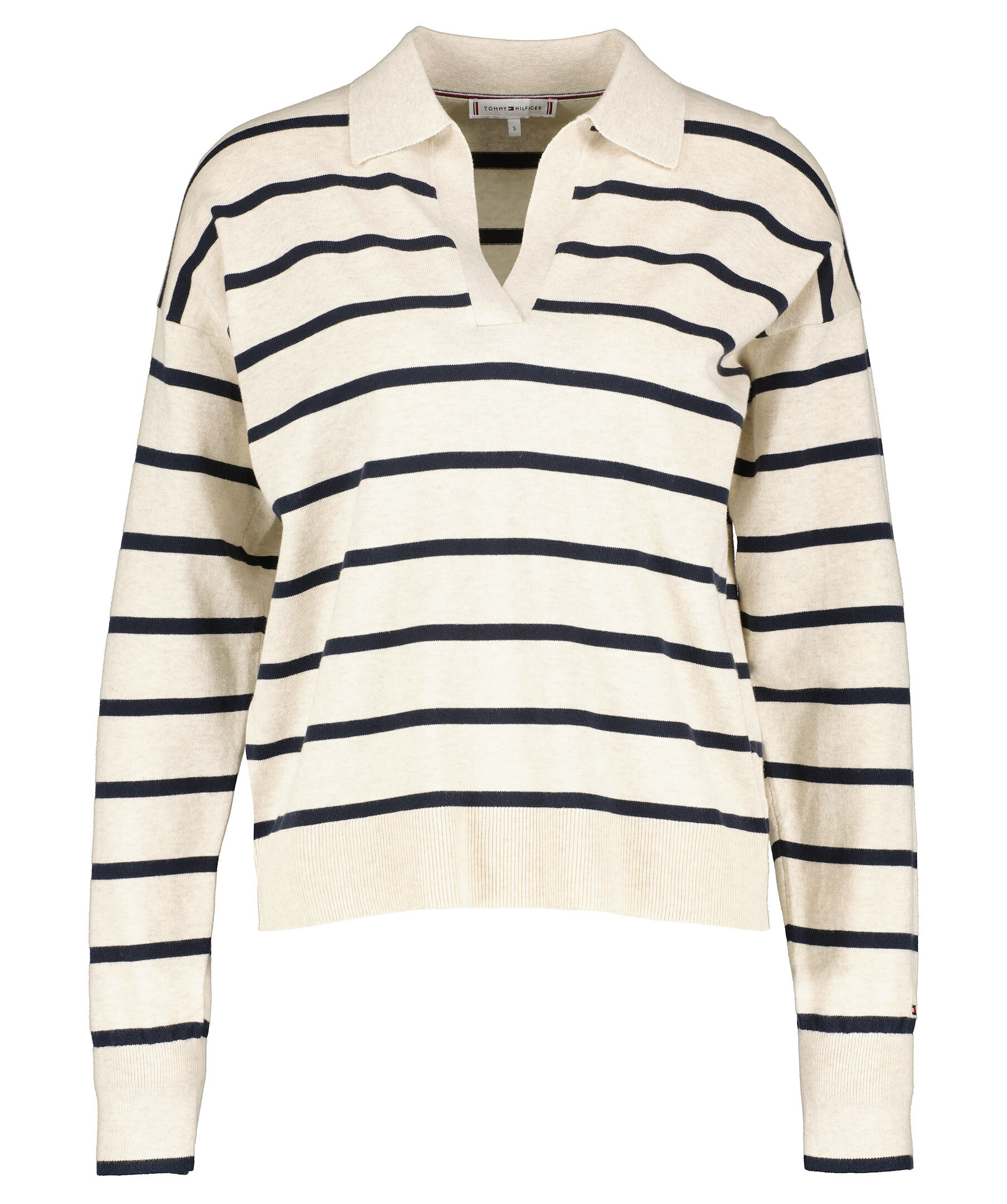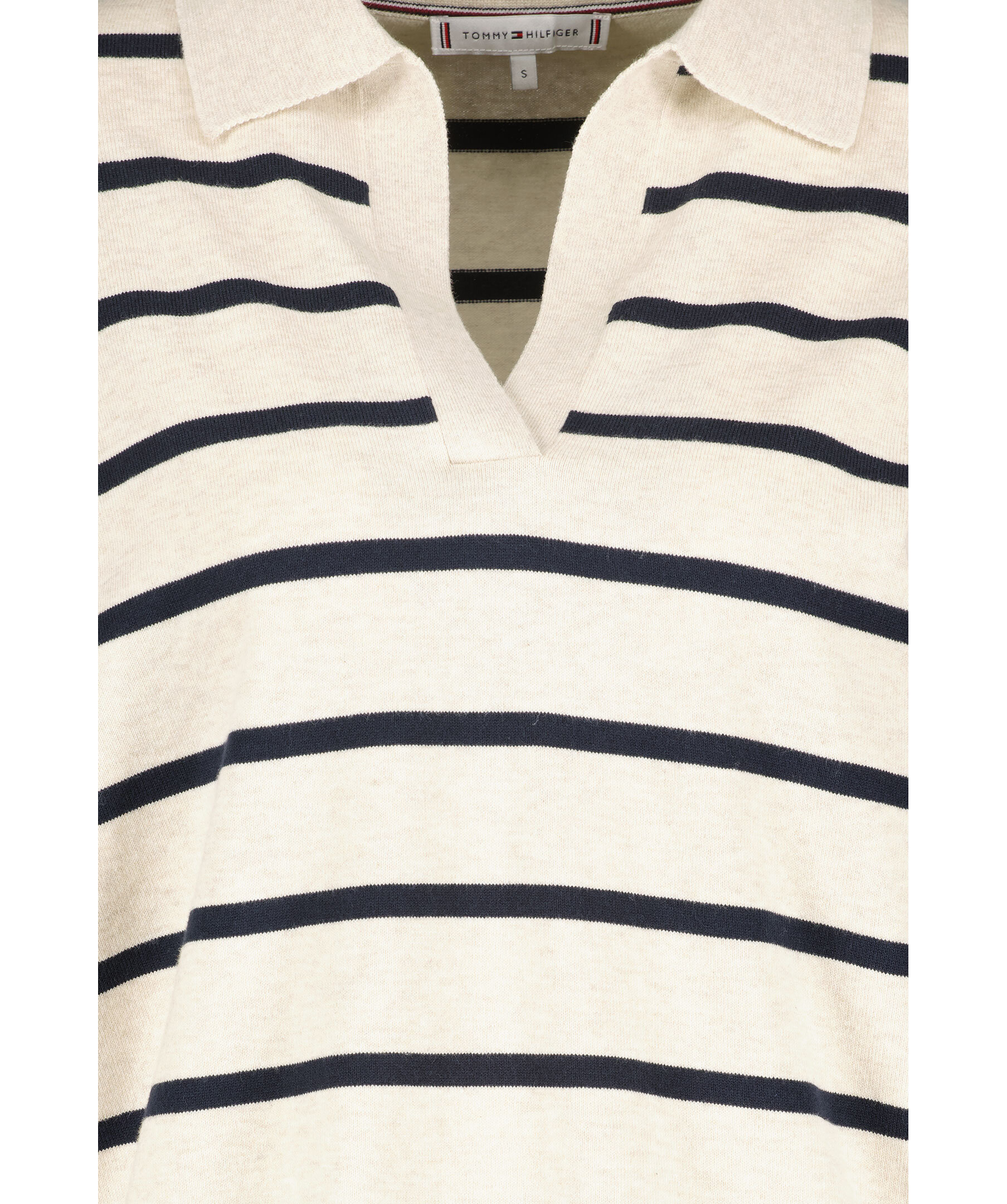 Beigemelerad och svart, stickad randig tröja från Tommy Hilfiger. V-ringad och fin krage. Fina muddar i ärmslut och plaggslut. Tillverkad i 100% bomull.