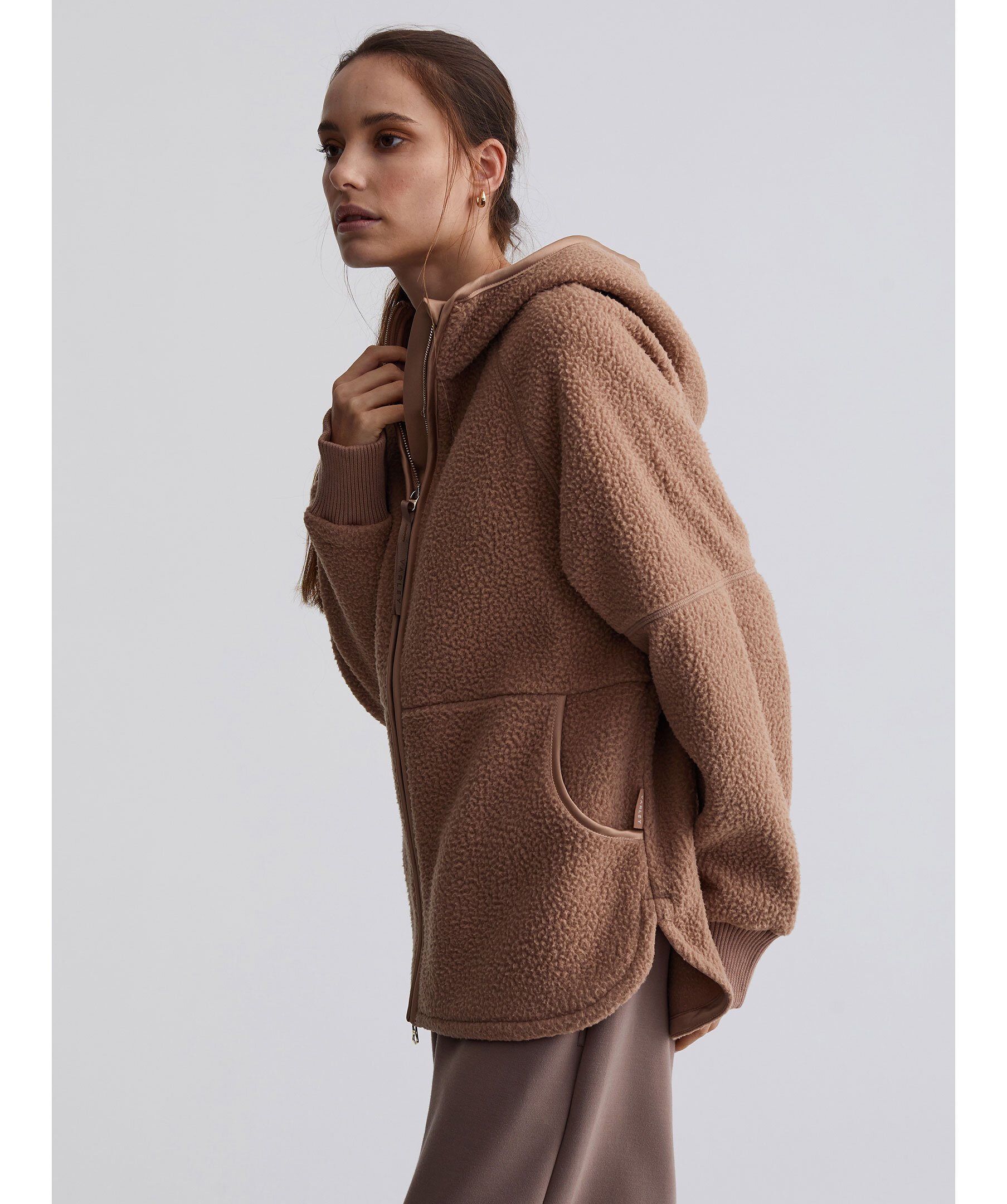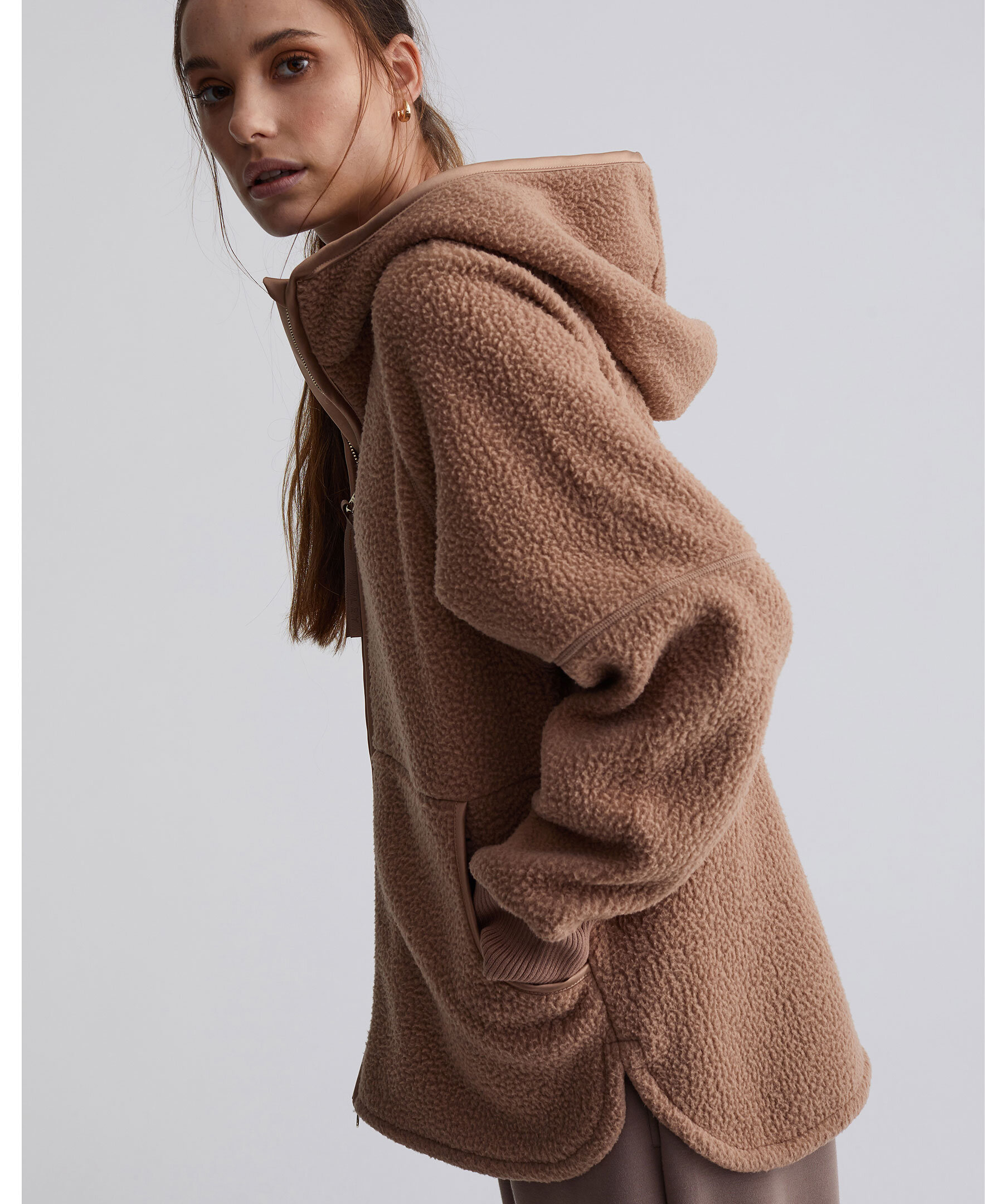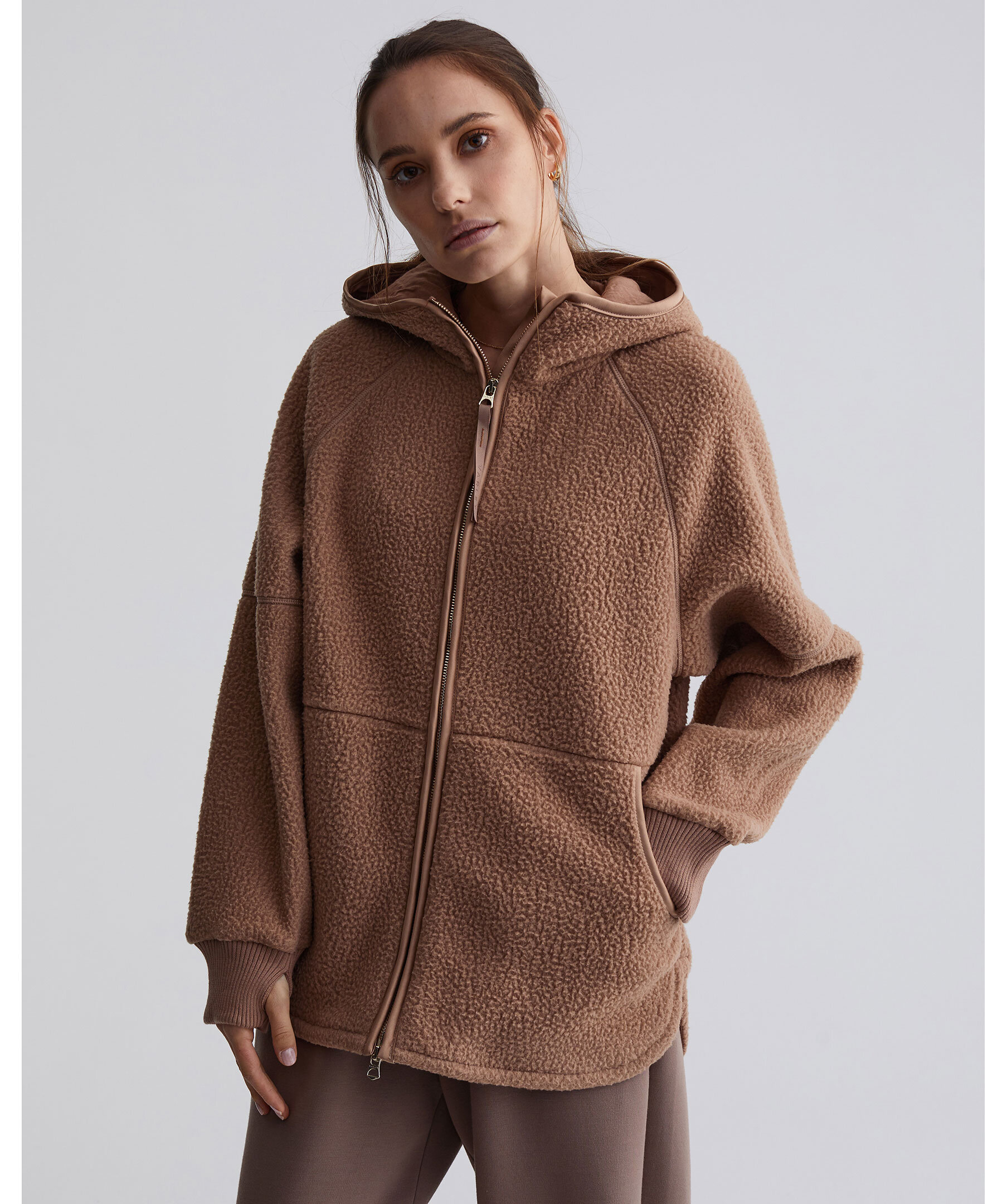 Kamelfärgad fleecetröja från Varlry. Tillverkad i en mjuk, återvunnen plyschfleece. Stängs med tvåvägsdragkedja framtill och har en har en vid luva och två framfickor. Böjd fåll baktill och har raglanärmar för enkel rörelse och har satängkanter i ärmslut.