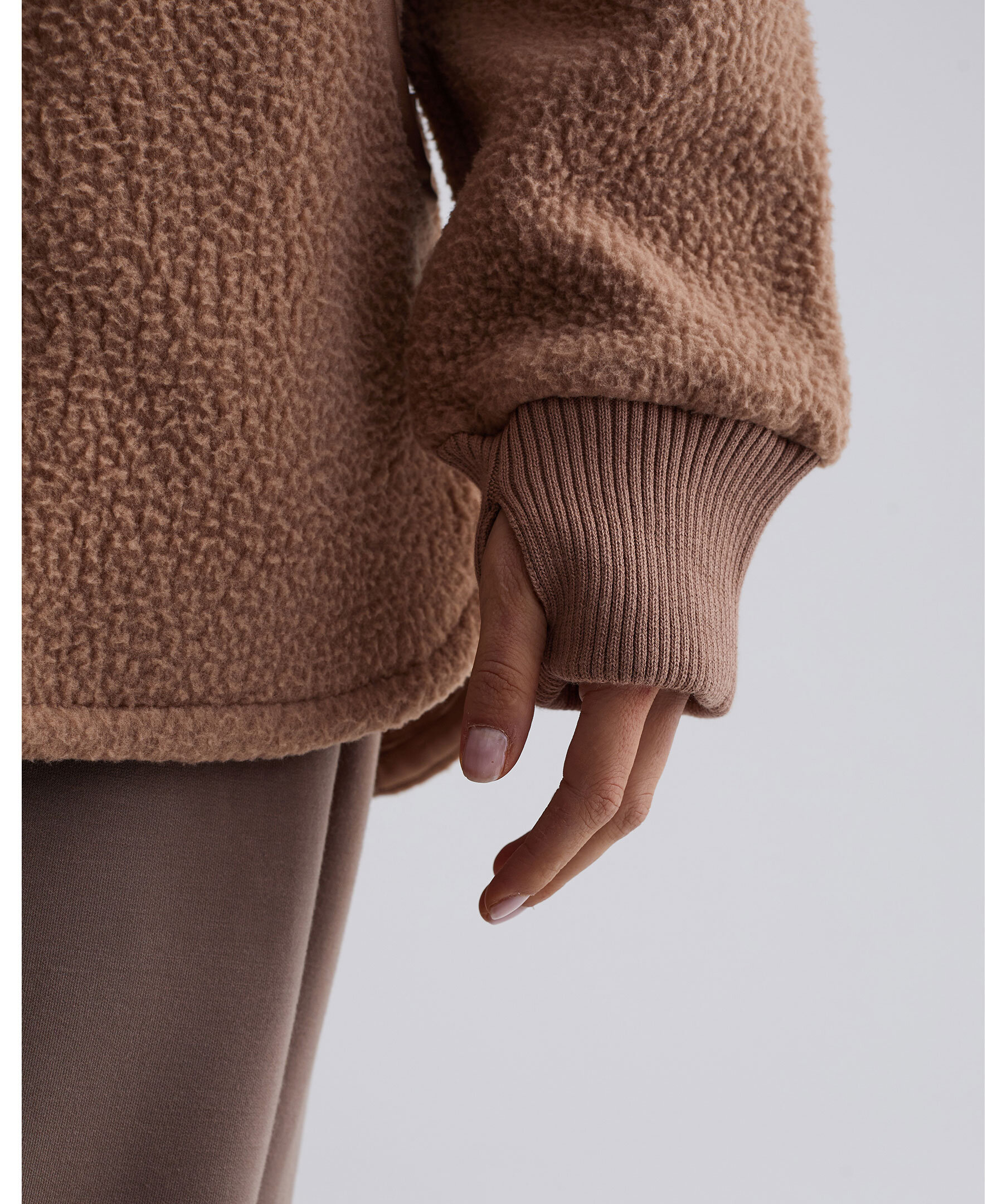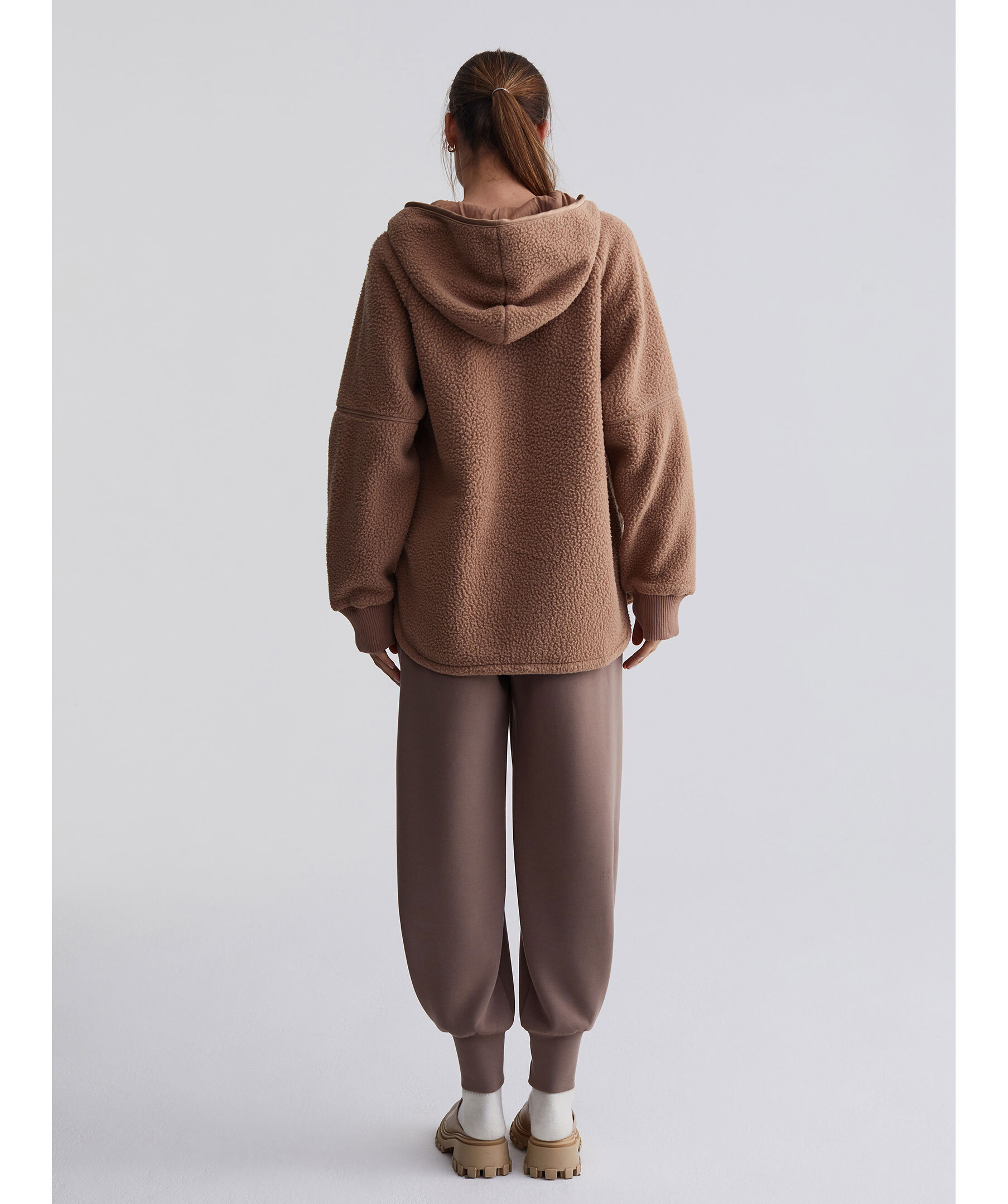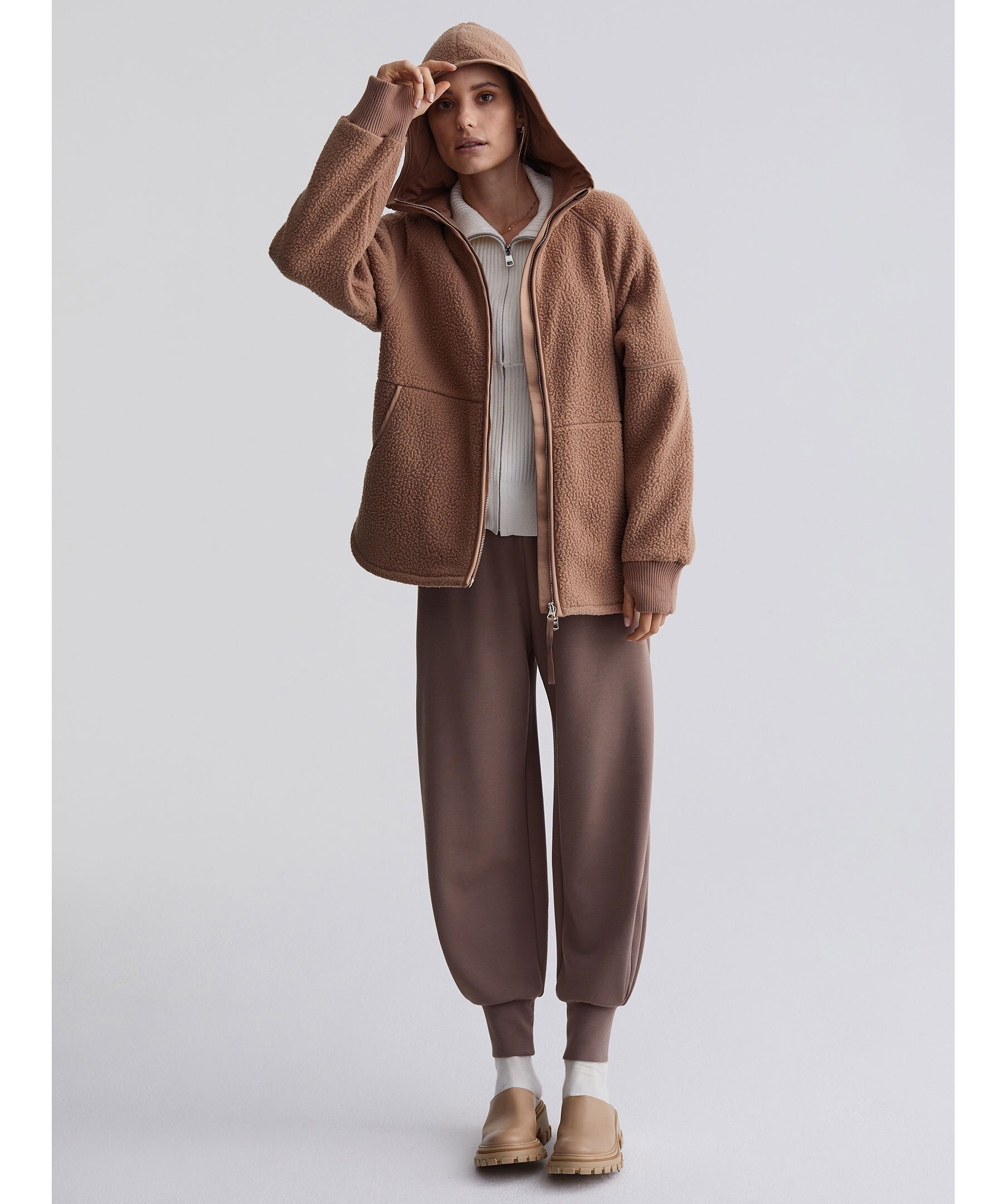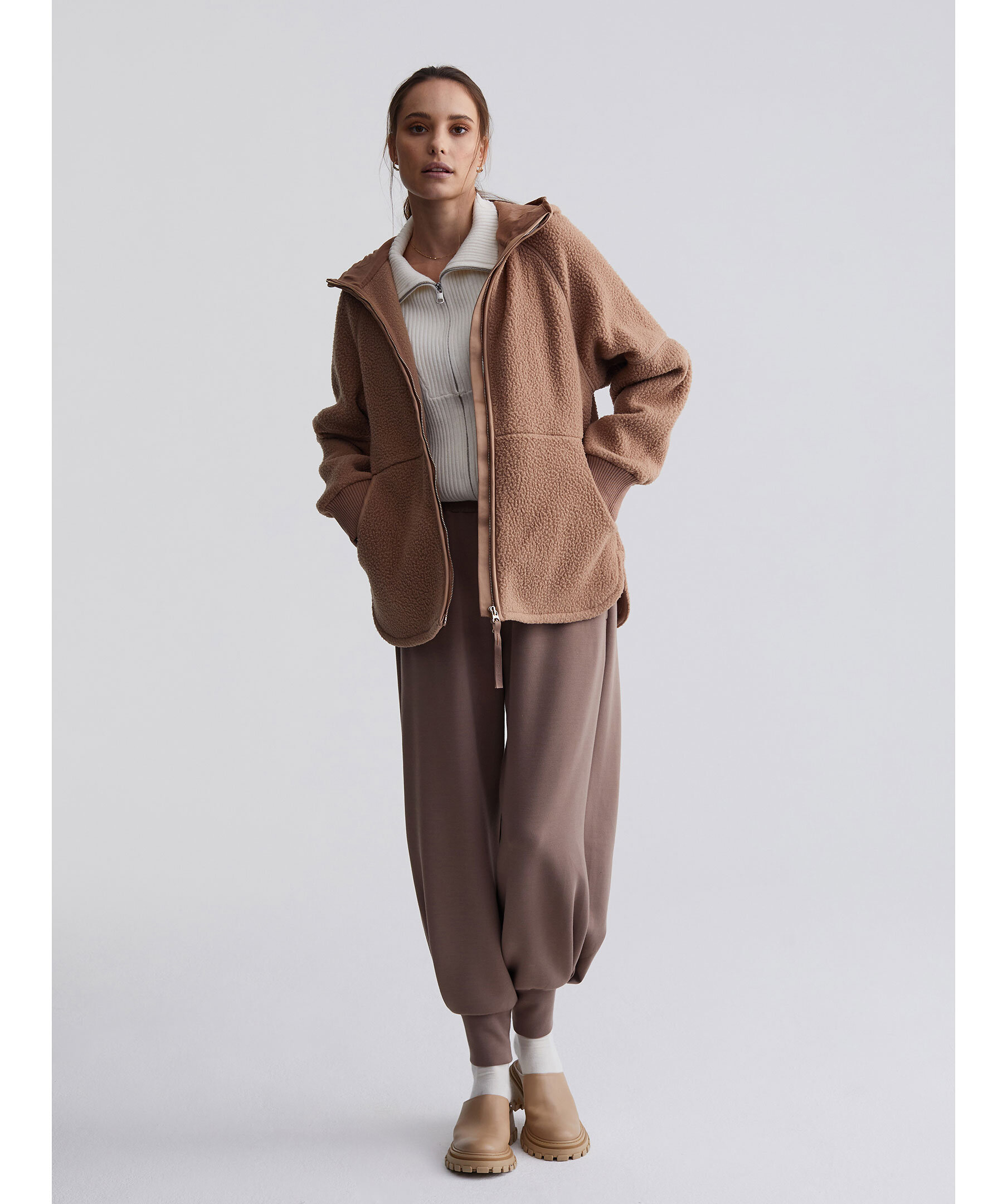 Kamelfärgad fleecetröja från Varlry. Tillverkad i en mjuk, återvunnen plyschfleece. Stängs med tvåvägsdragkedja framtill och har en har en vid luva och två framfickor. Böjd fåll baktill och har raglanärmar för enkel rörelse och har satängkanter i ärmslut.