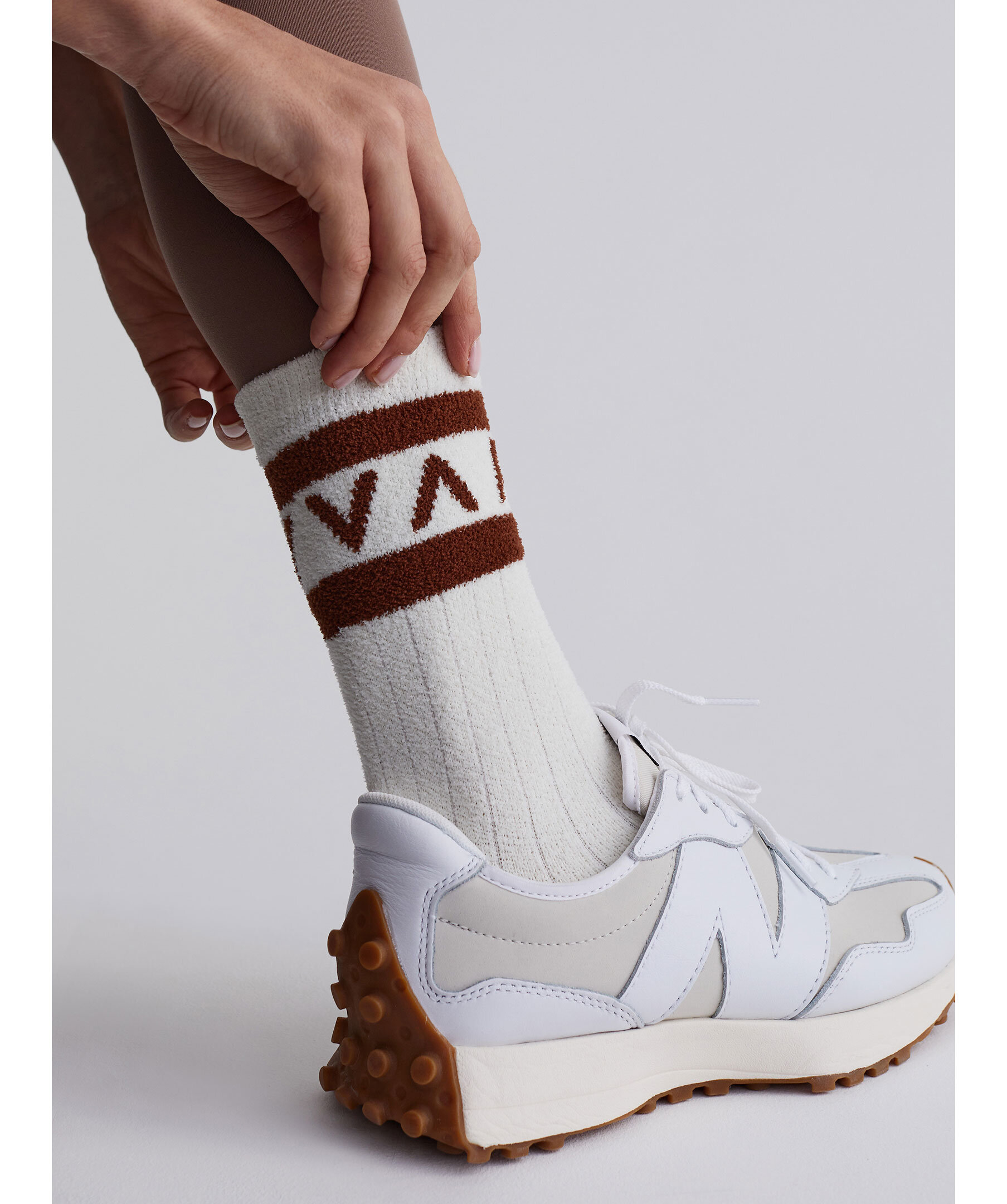 Vita, mjuka och extremt bekväma strumpor från Varley. Bruna ränder, logotyp upptill och brun häl. Perfekta för svalare väder eller inomhus när golven är kalla.