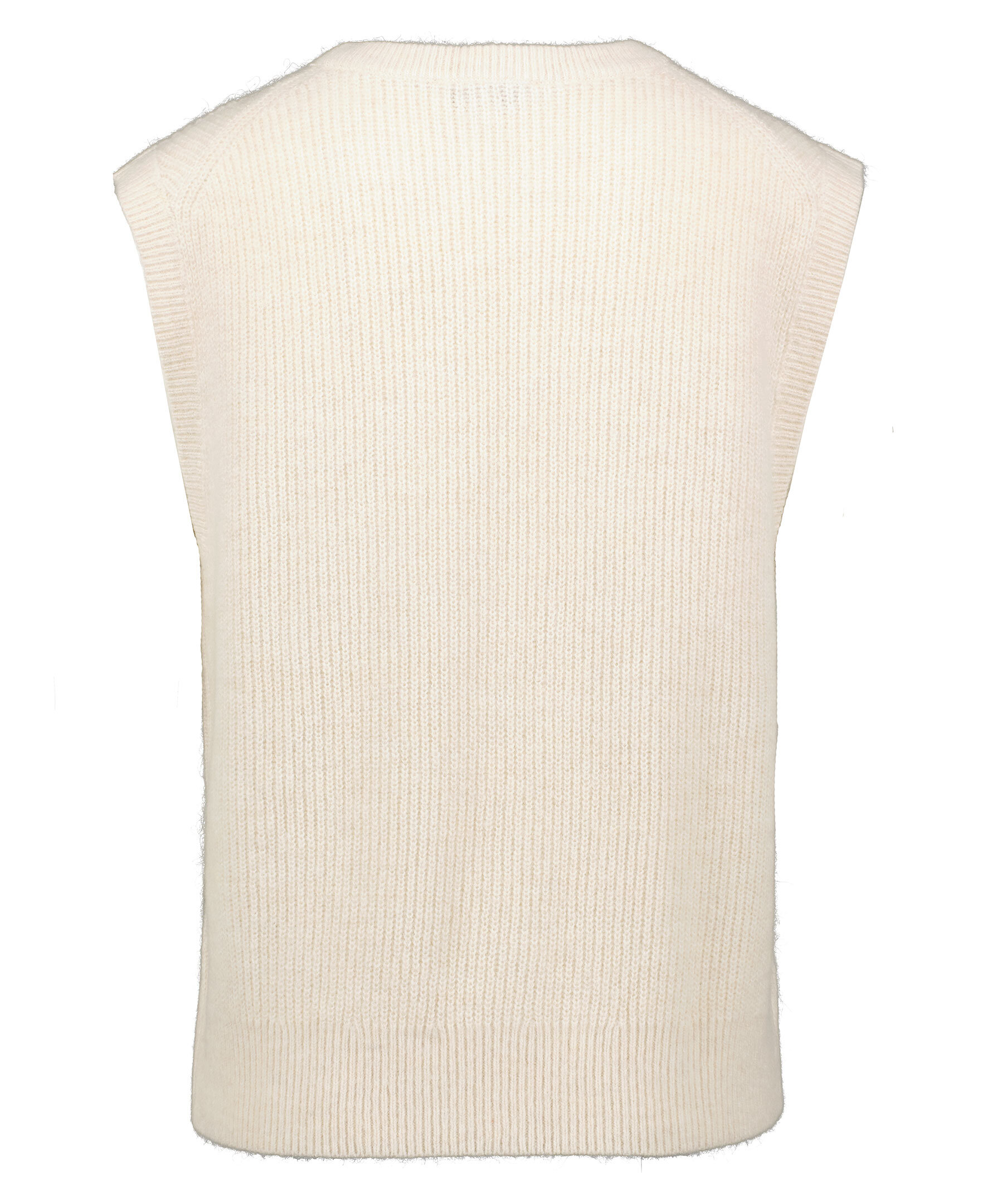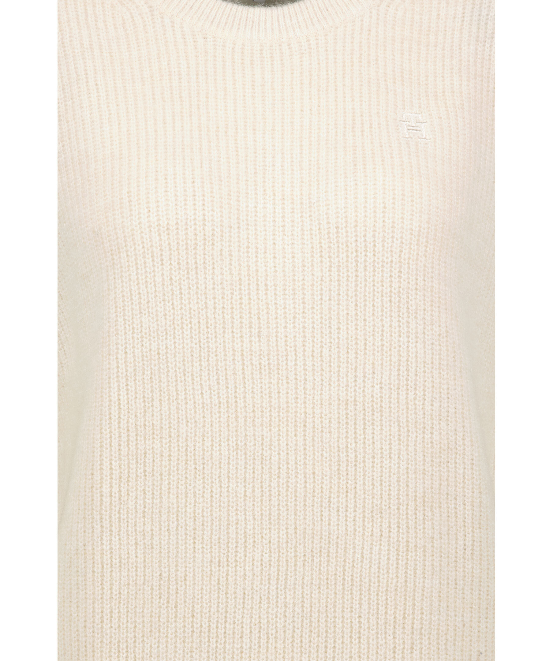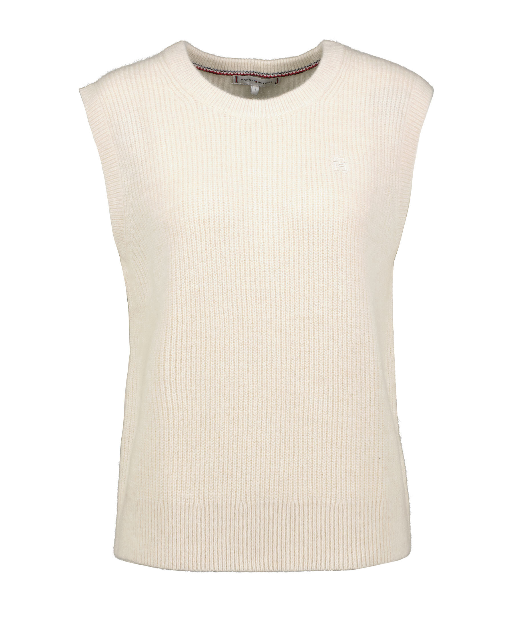 Krämvit, avslappnad stickad väst från Tommy Hilfiger. Tillverkad i mjuk alpacka- och ullfibrer som blandas in för en extra mjuk touch. Ribbstickad, rundad halsring TH monogrambroderi på bröstet.