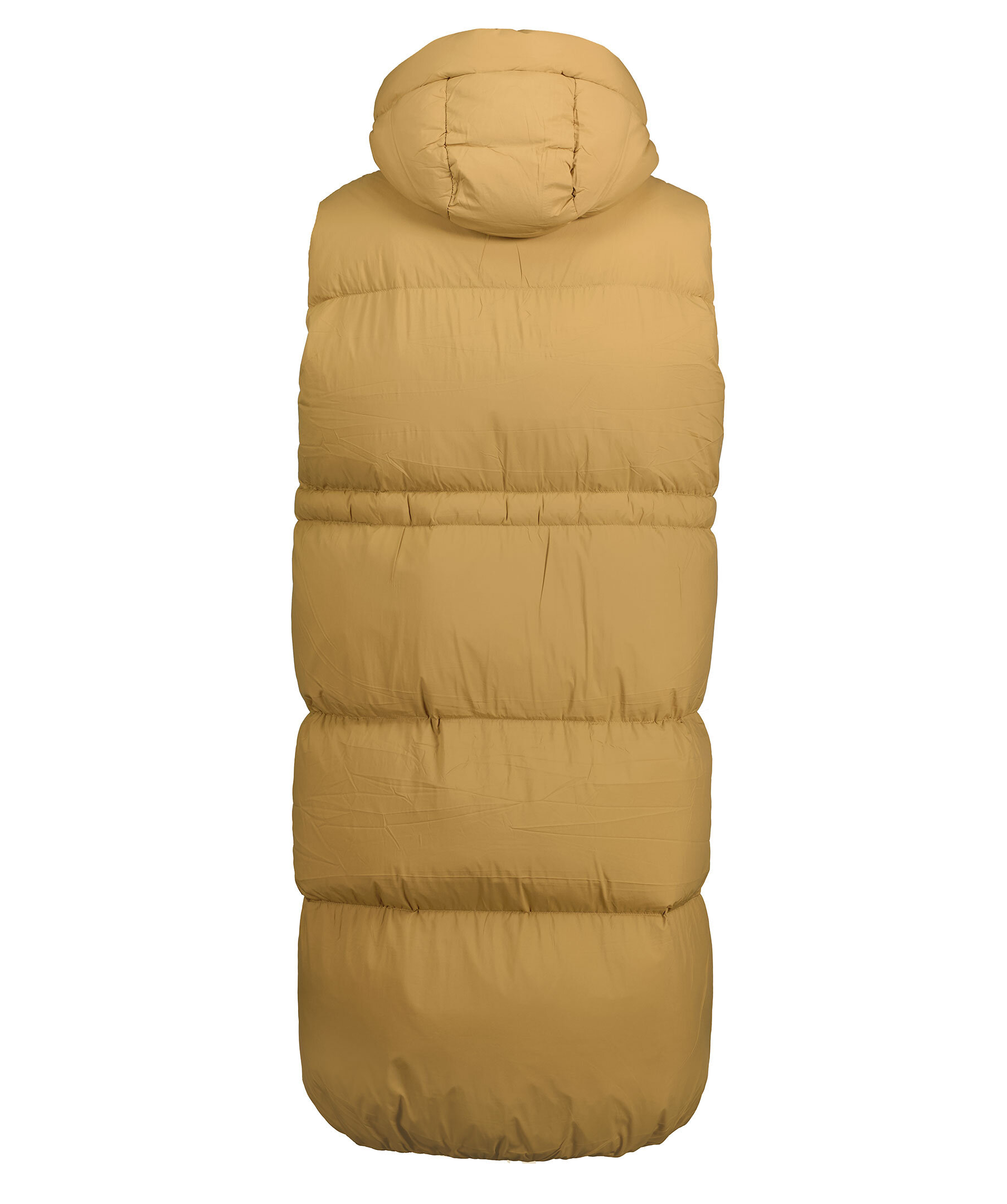Kamelfärgad lång dunväst med luva från Tommy Hilfiger. Stängs framtill med guldfärgad tvåvägsdragkedja. dragsko i midjan. Två sidfickor med dold dragkedja. Liten broderad logotyp på vänster bröst. Resår vid plaggslut.