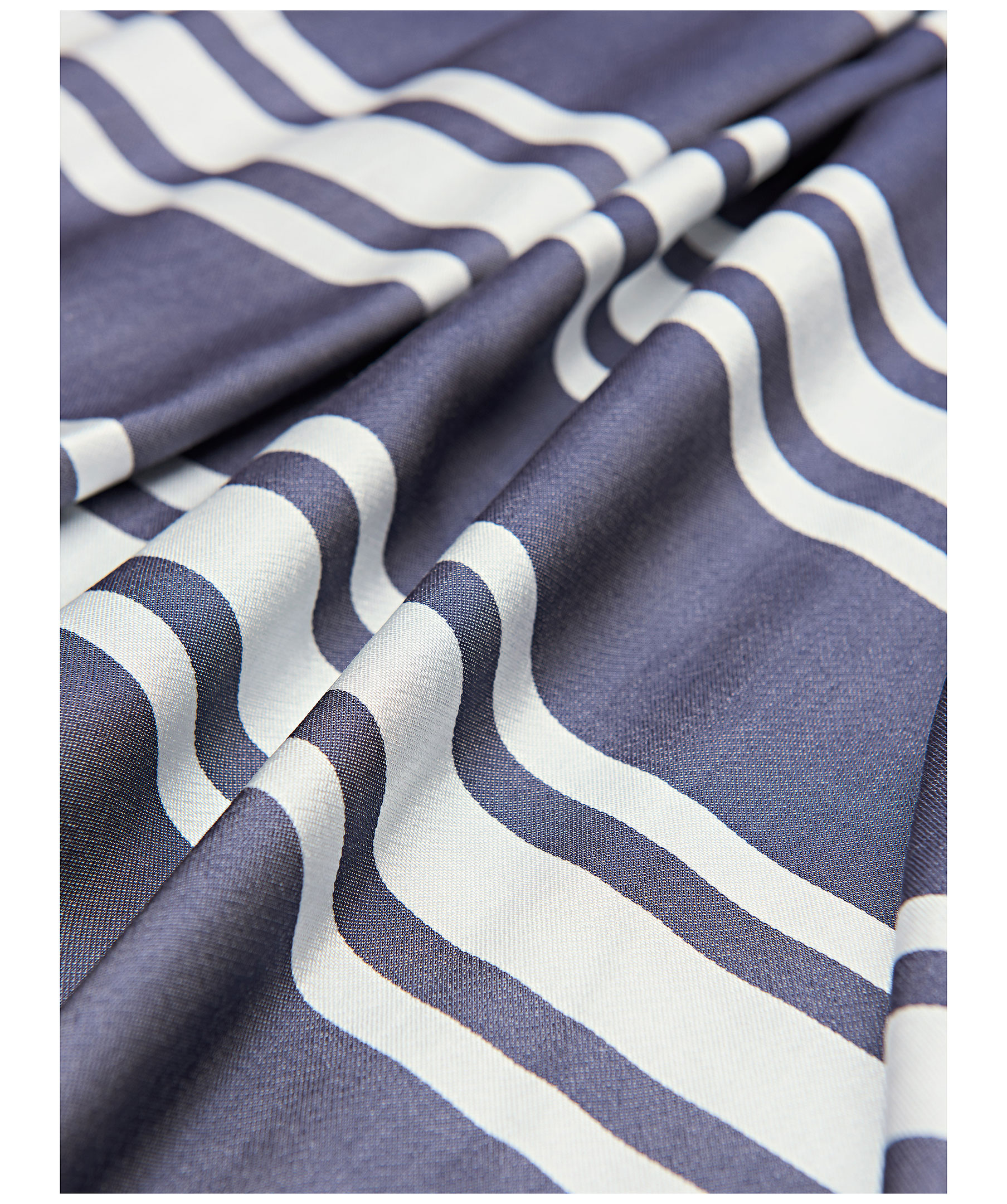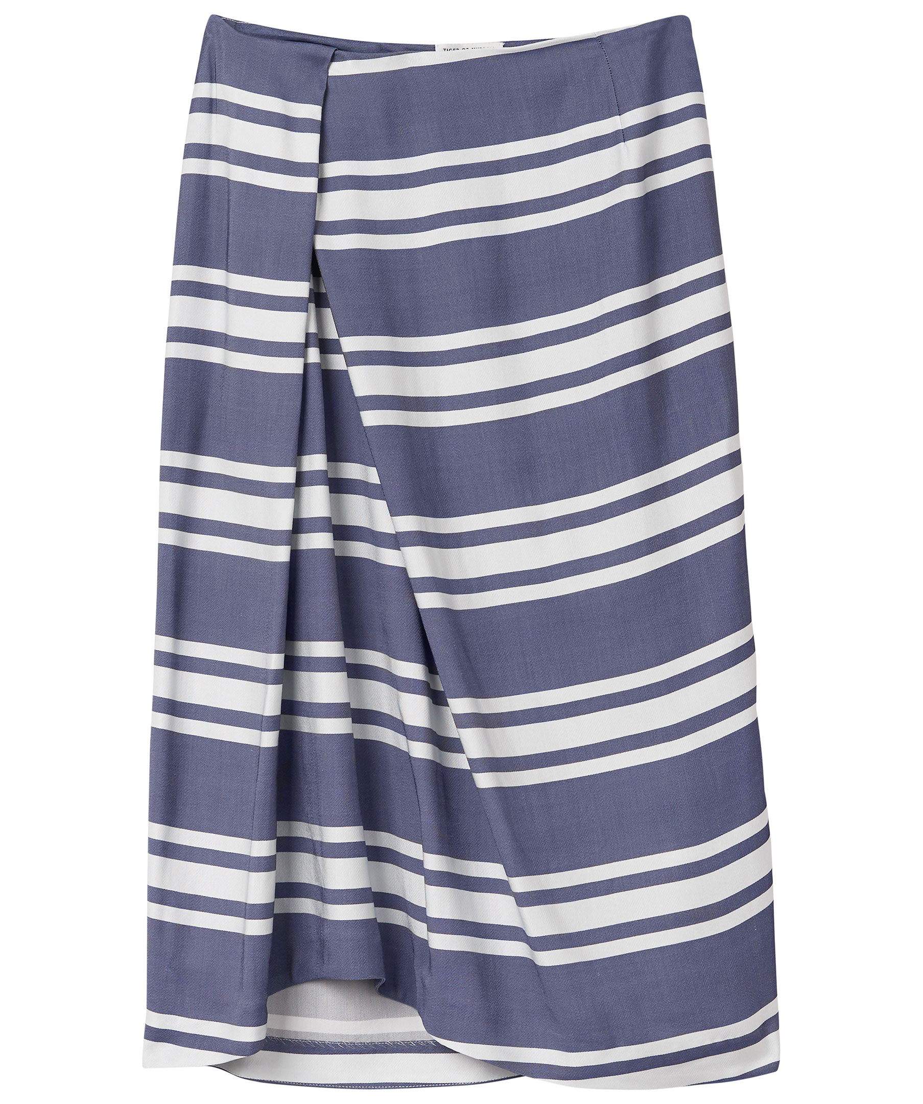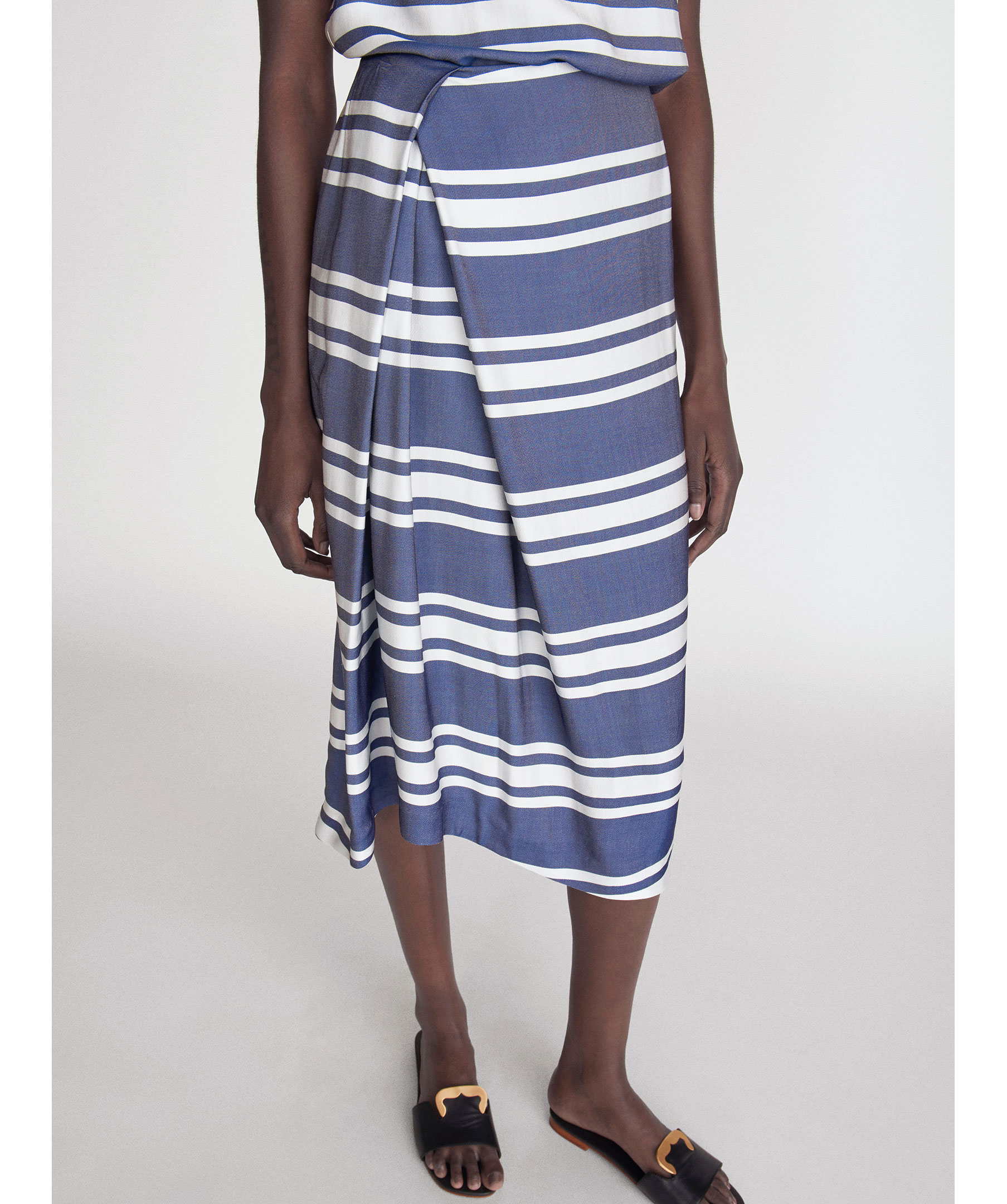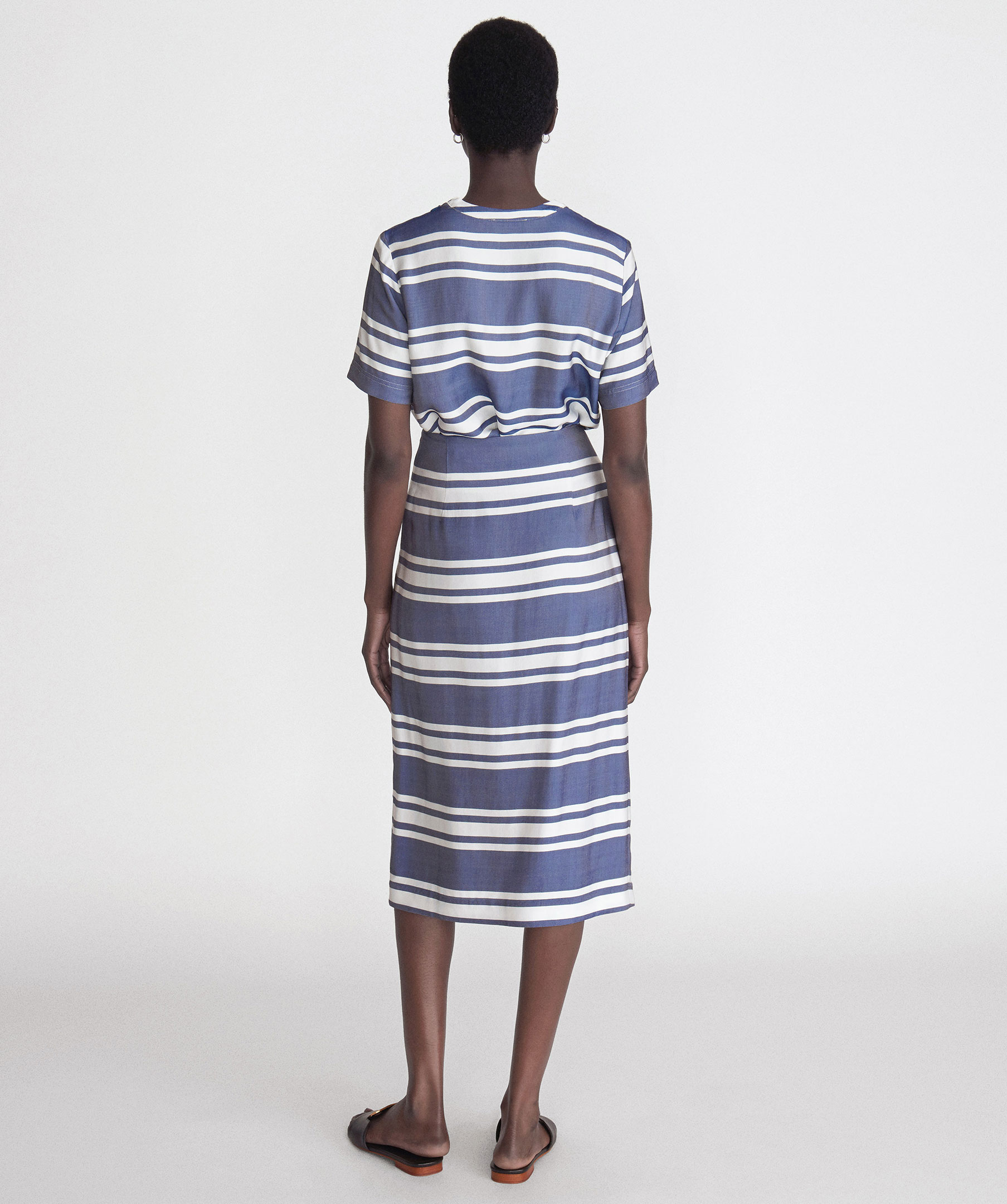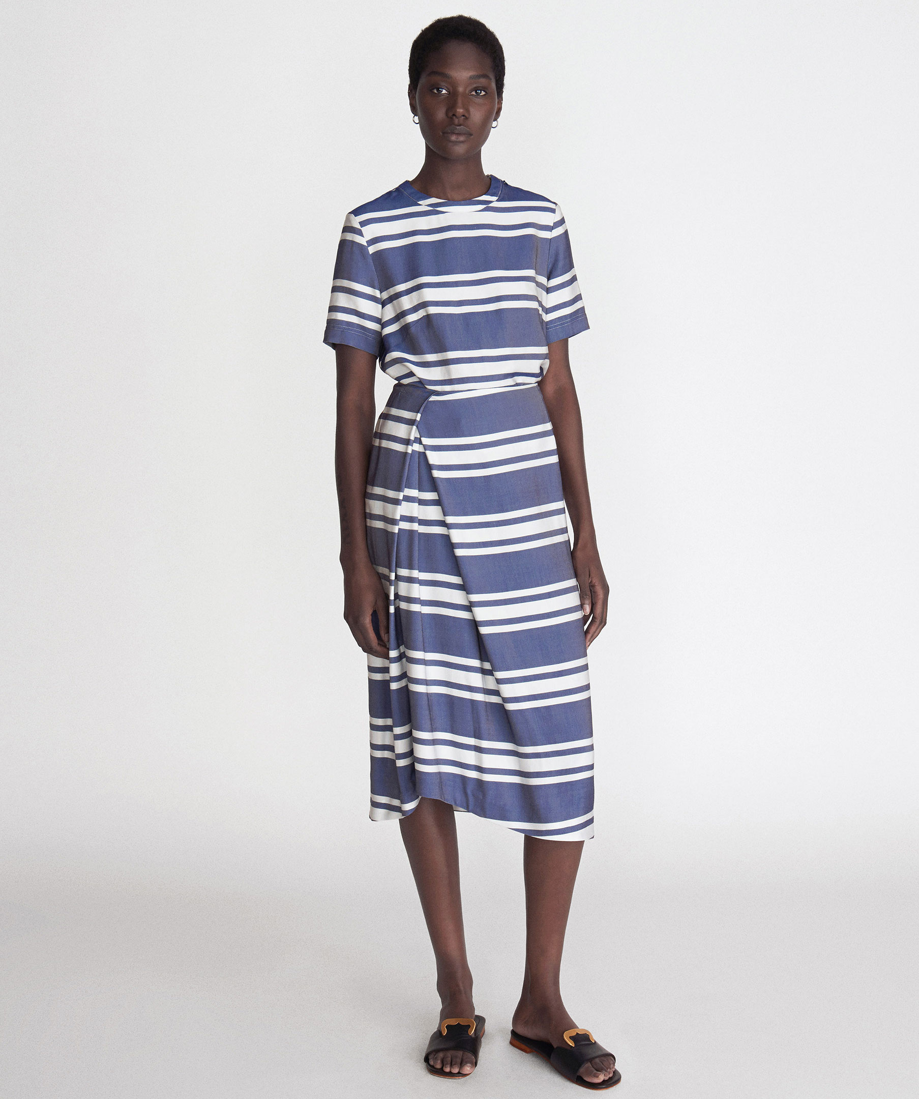 Blå/vit randig kjol från Tiger of Sweden med lätt drapering framtill. Dold dragkedja i sidan, normal passform, slutar under knäna.