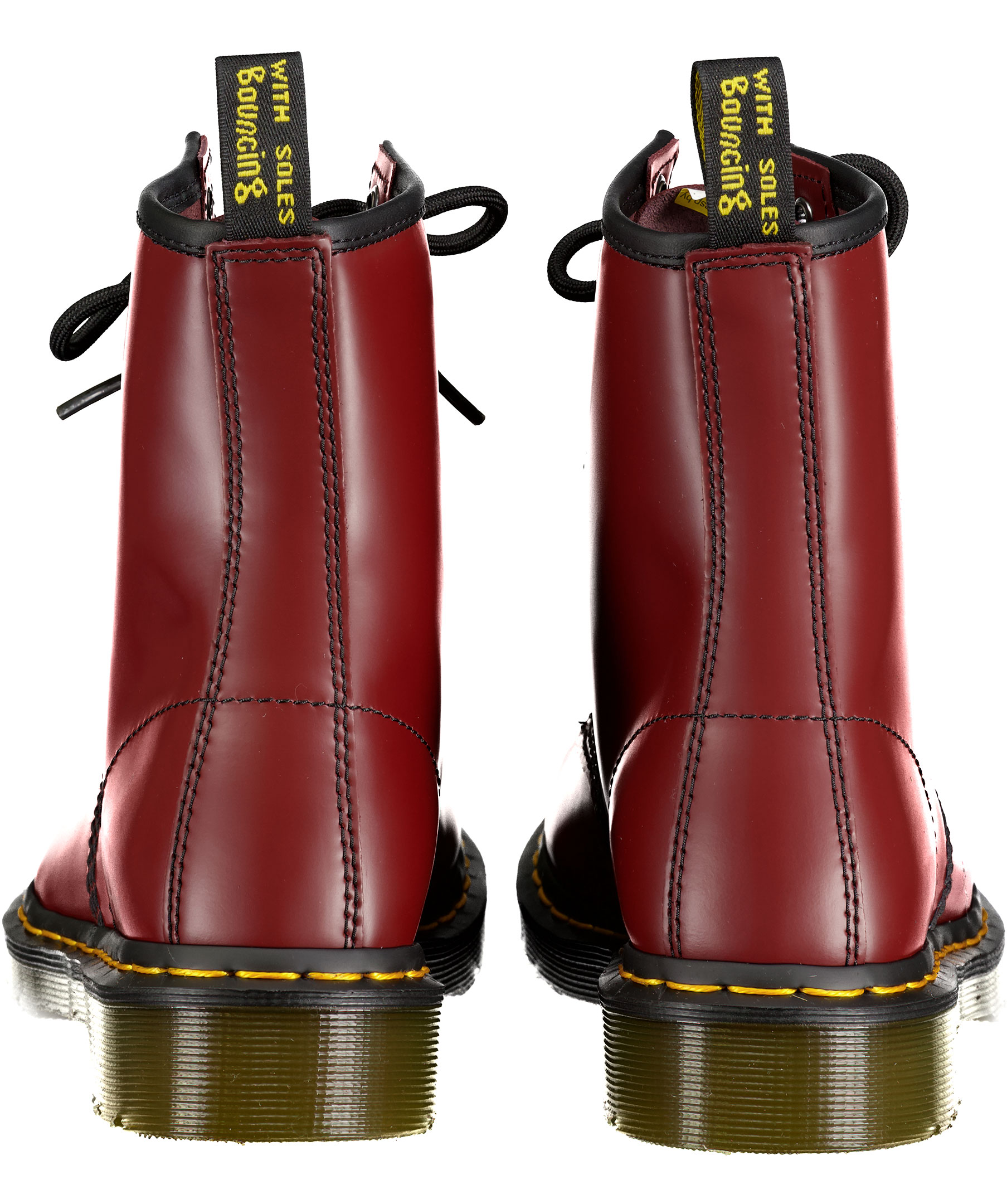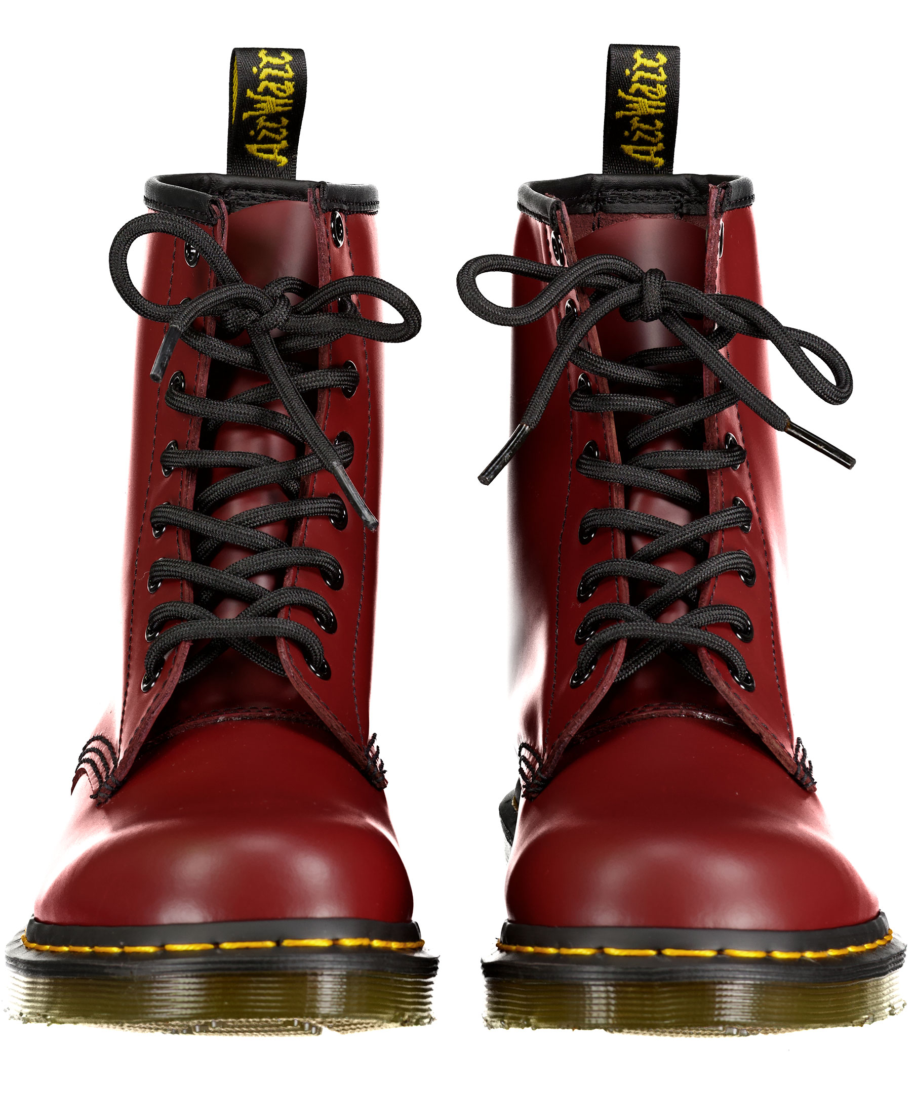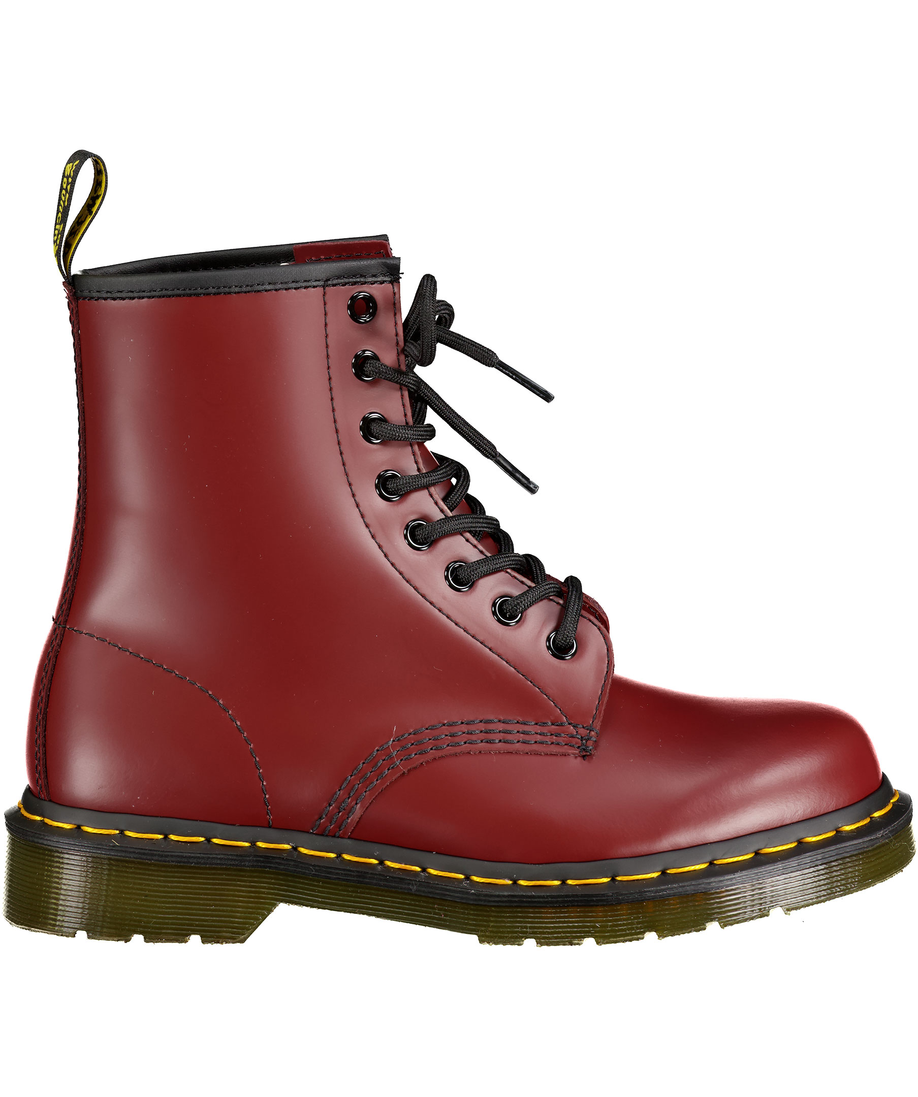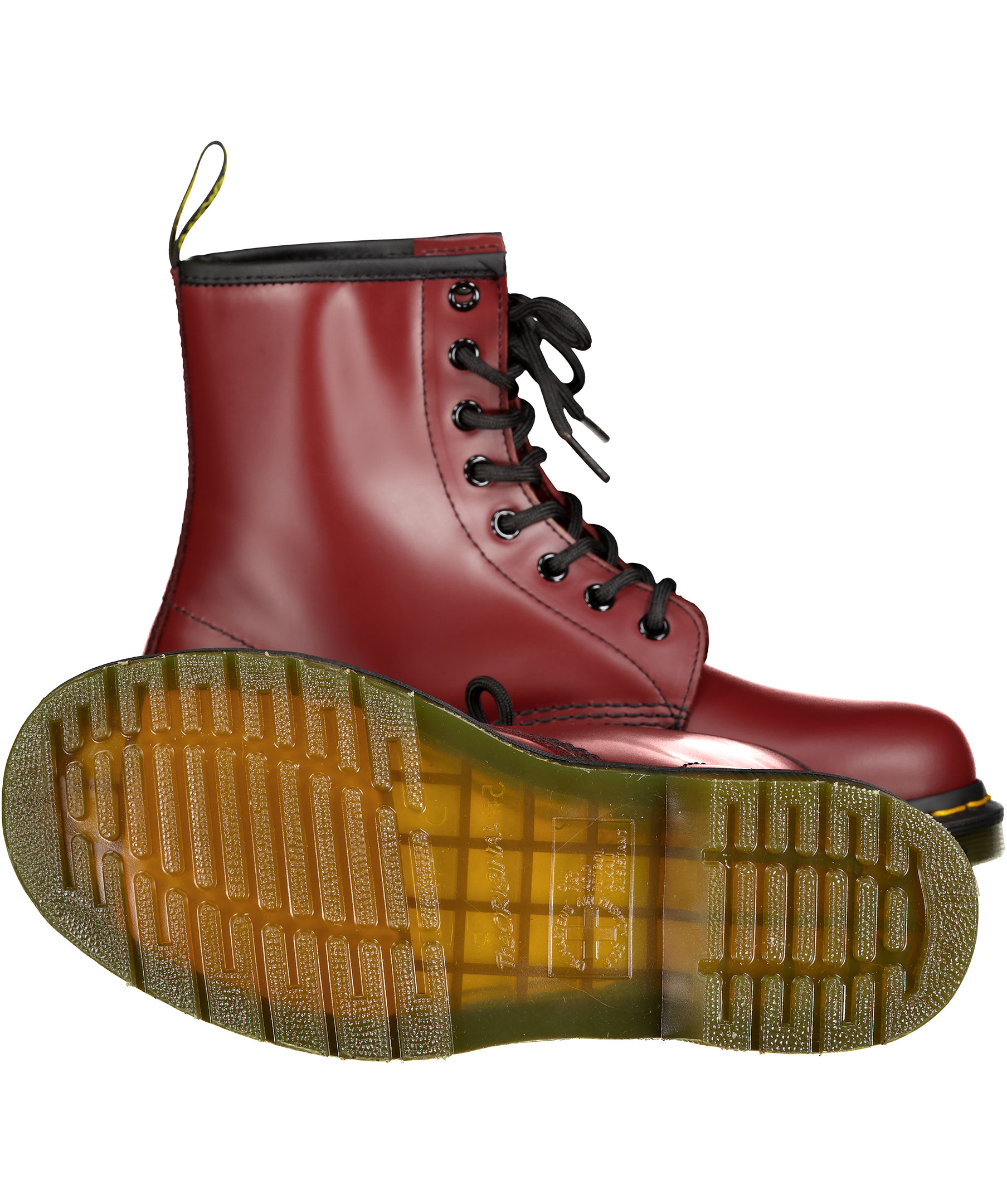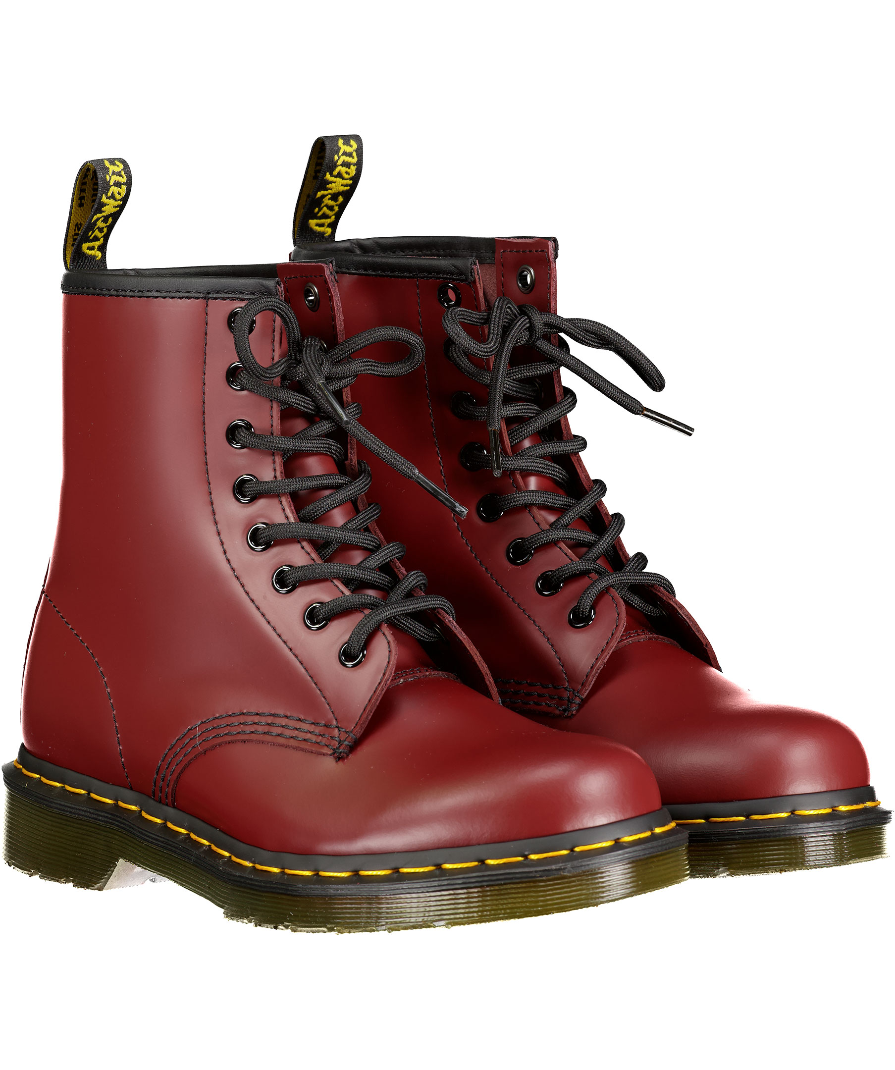 Röda kängor från Dr. Martens. Ikonisk häl-ögla baktill, 8-hålssnörning, gul söm vid yttersulan. Tillverkade i läder och sula av gummi. Unisex modell.