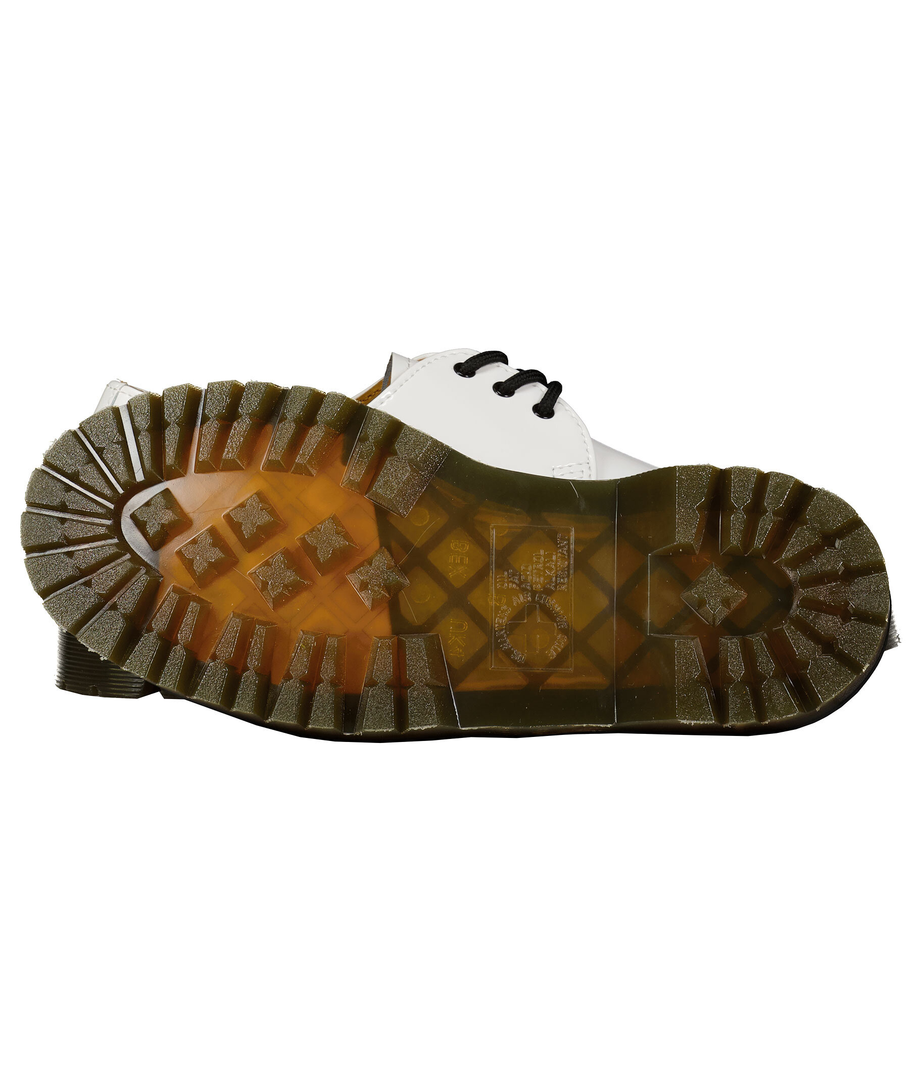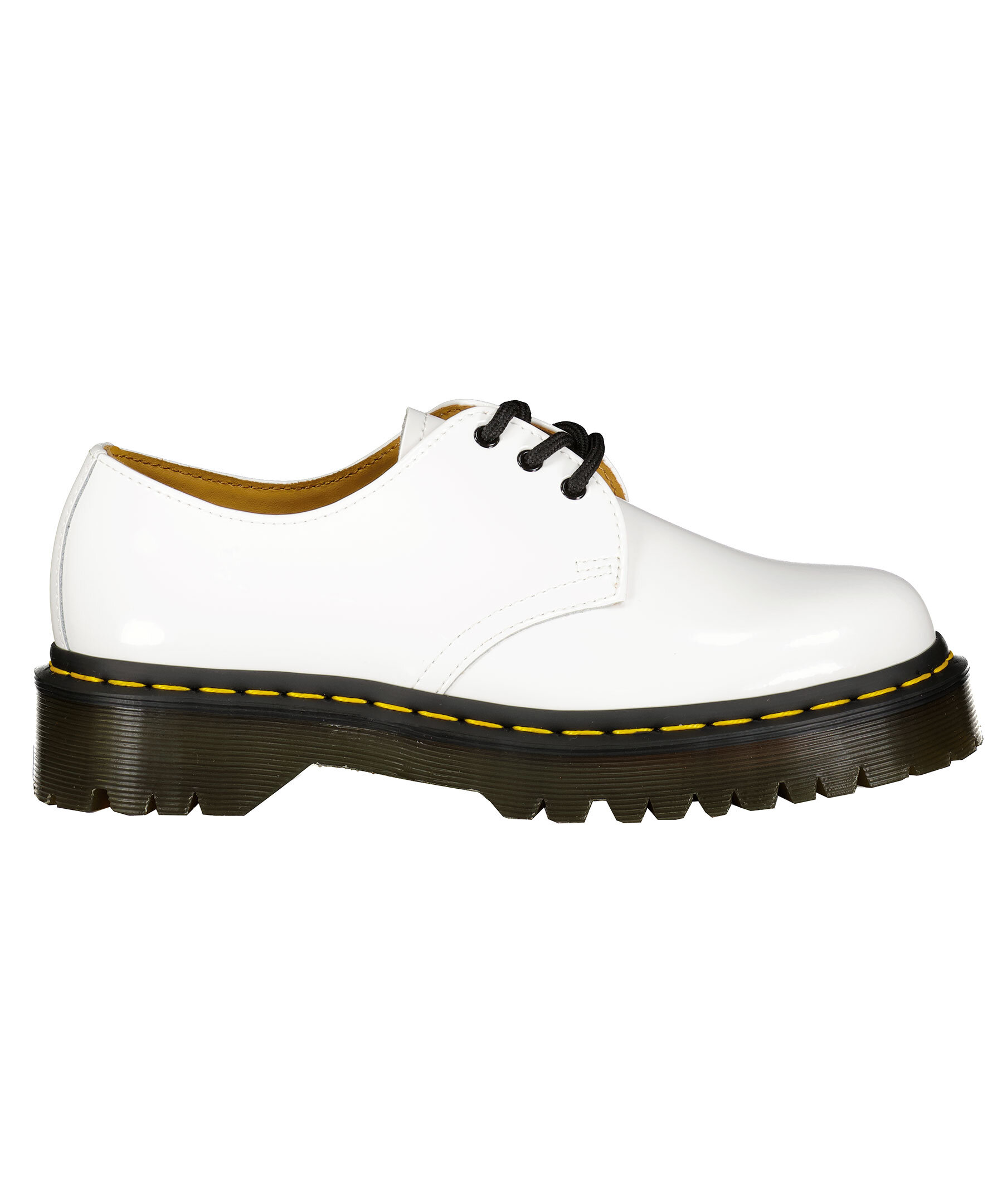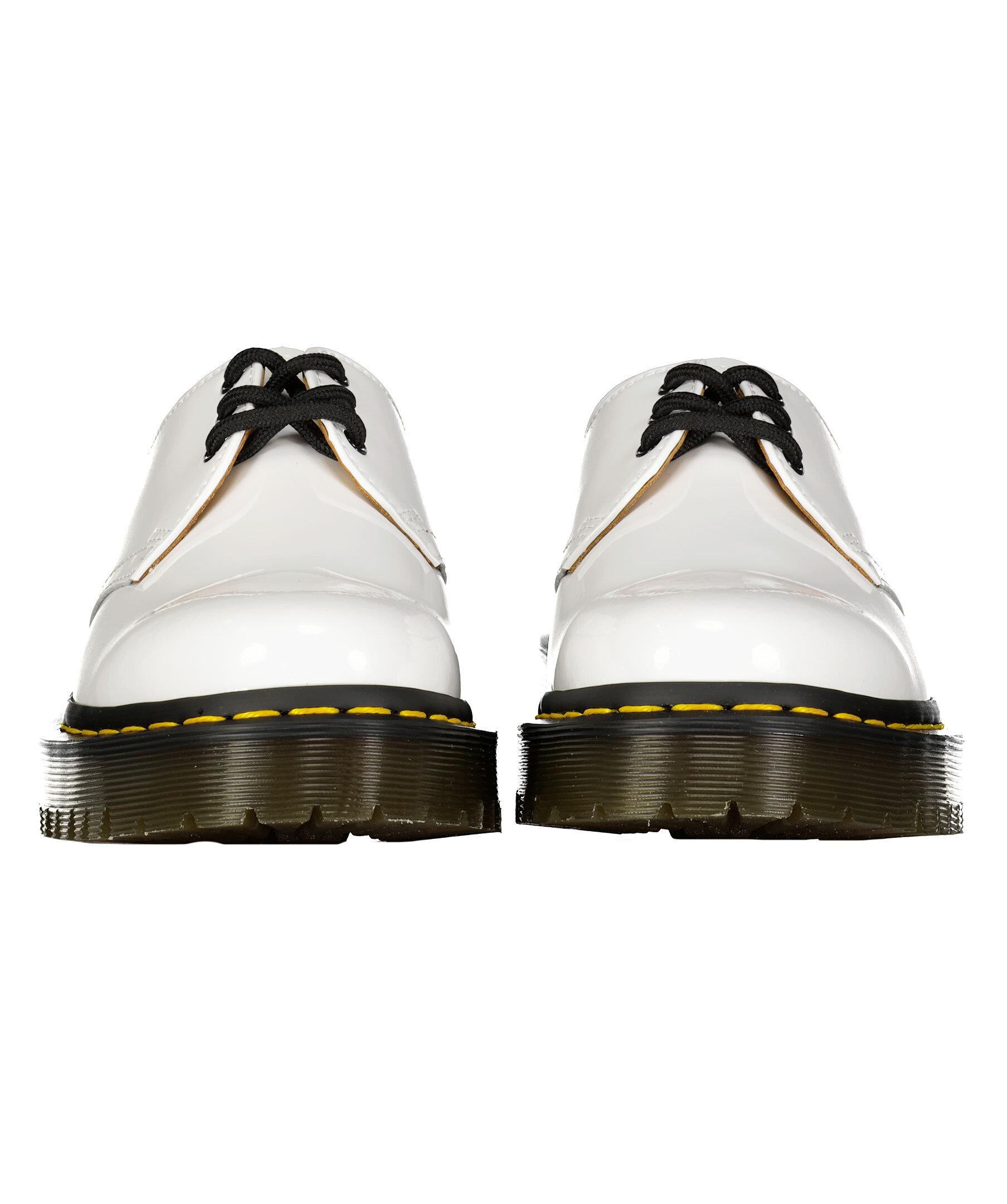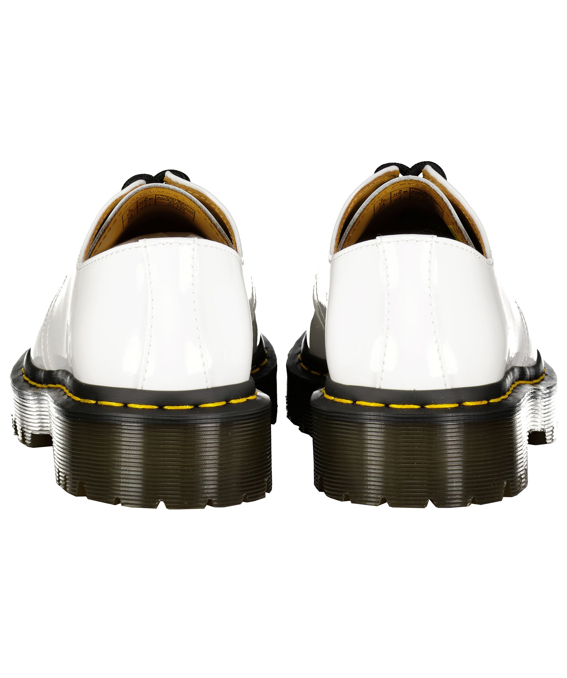 Vita skor i lackat läder från Dr. Martens. Högre sula med Dr. Martens klassiska, gula söm. Trehålssnörning med svarta skosnören.
