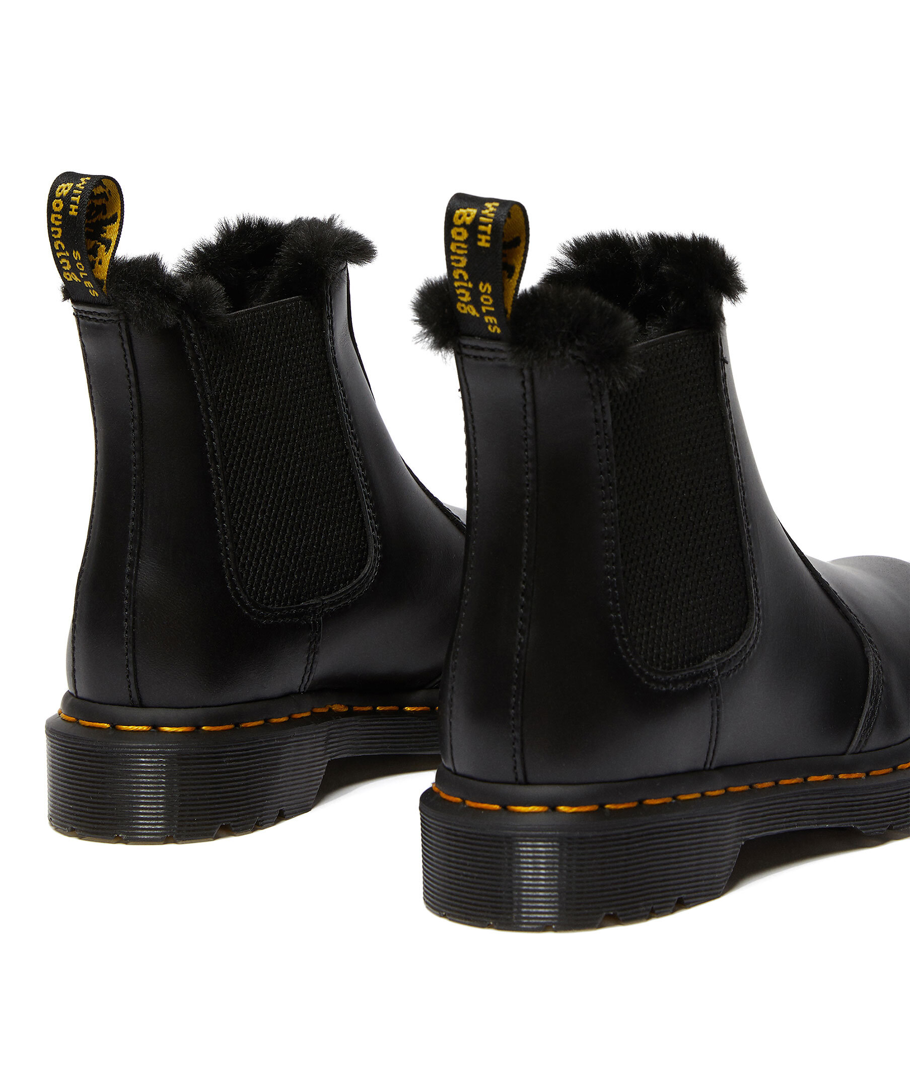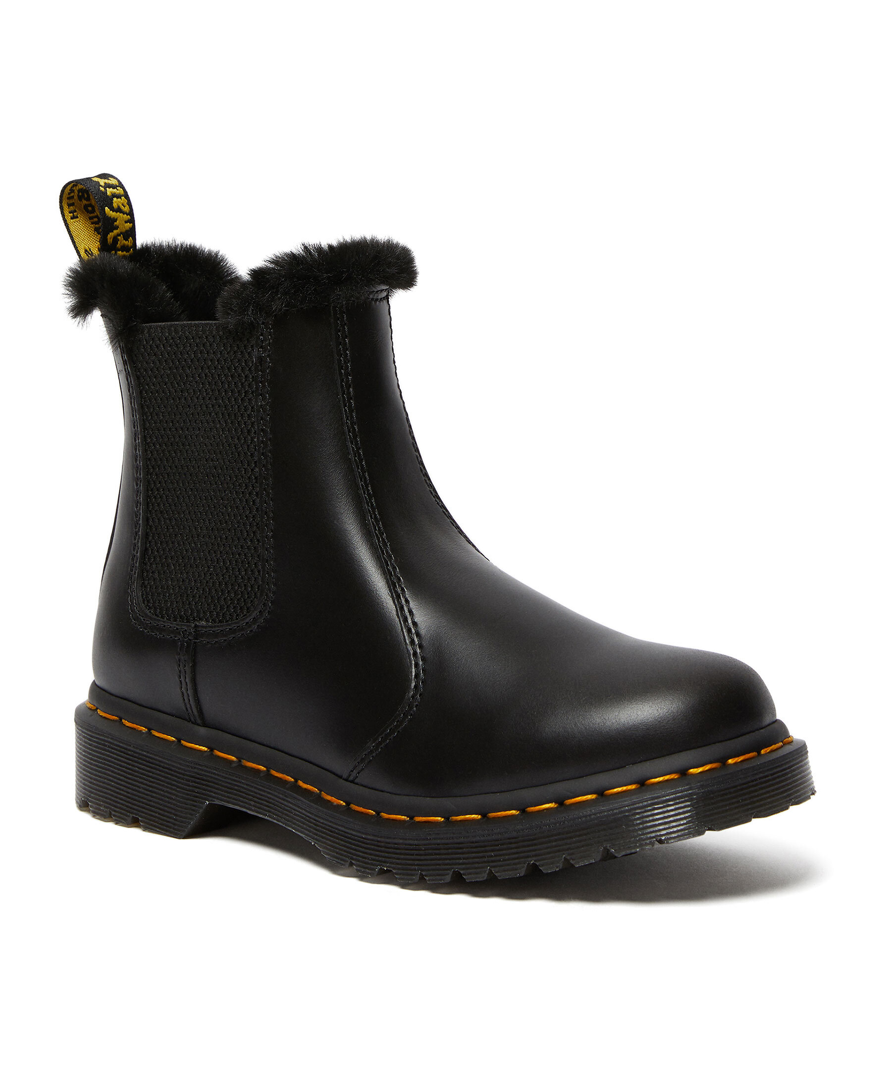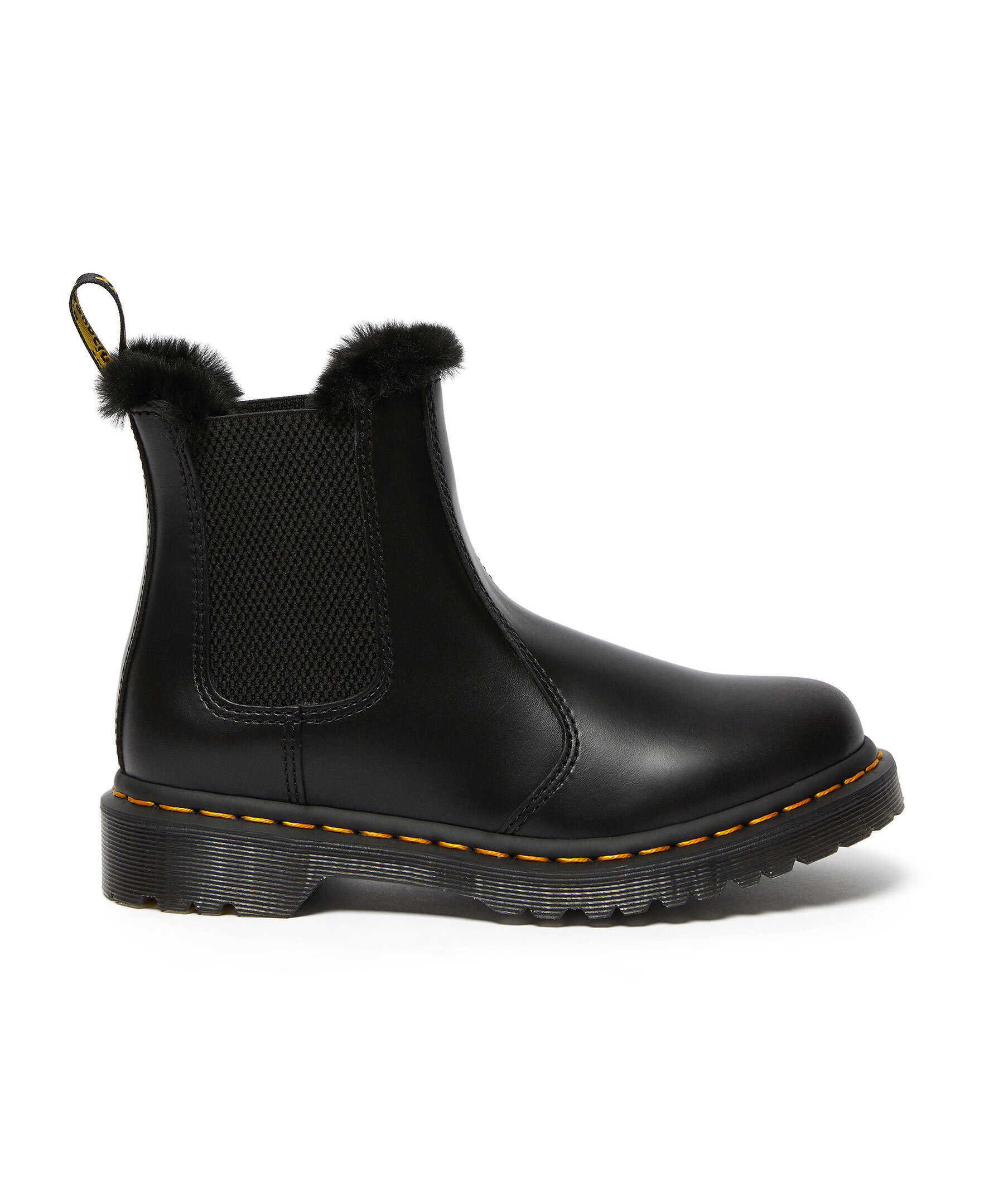 Svarta, fodrade boots som är varma och slitstarka från Dr. Martens. Fodrade med en mjuk fuskpäls och tillverkade i ett mjukt, vaxat läder med glansig yta. Har gula sömmar mot sulan och har en ögla bak med gul text. Grov sula i PVC och resor i sidorna som gör det lättare att få på sig skon.
