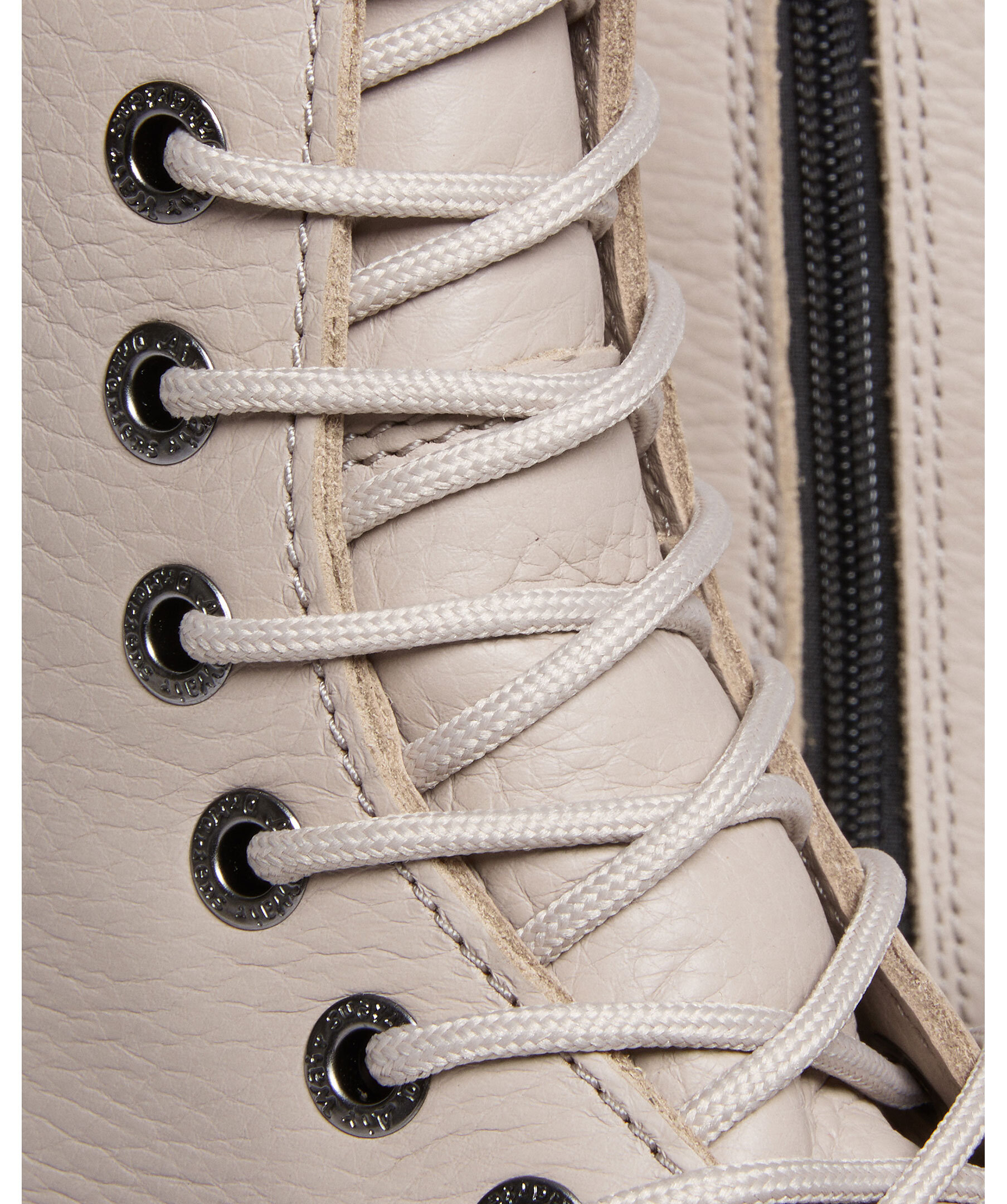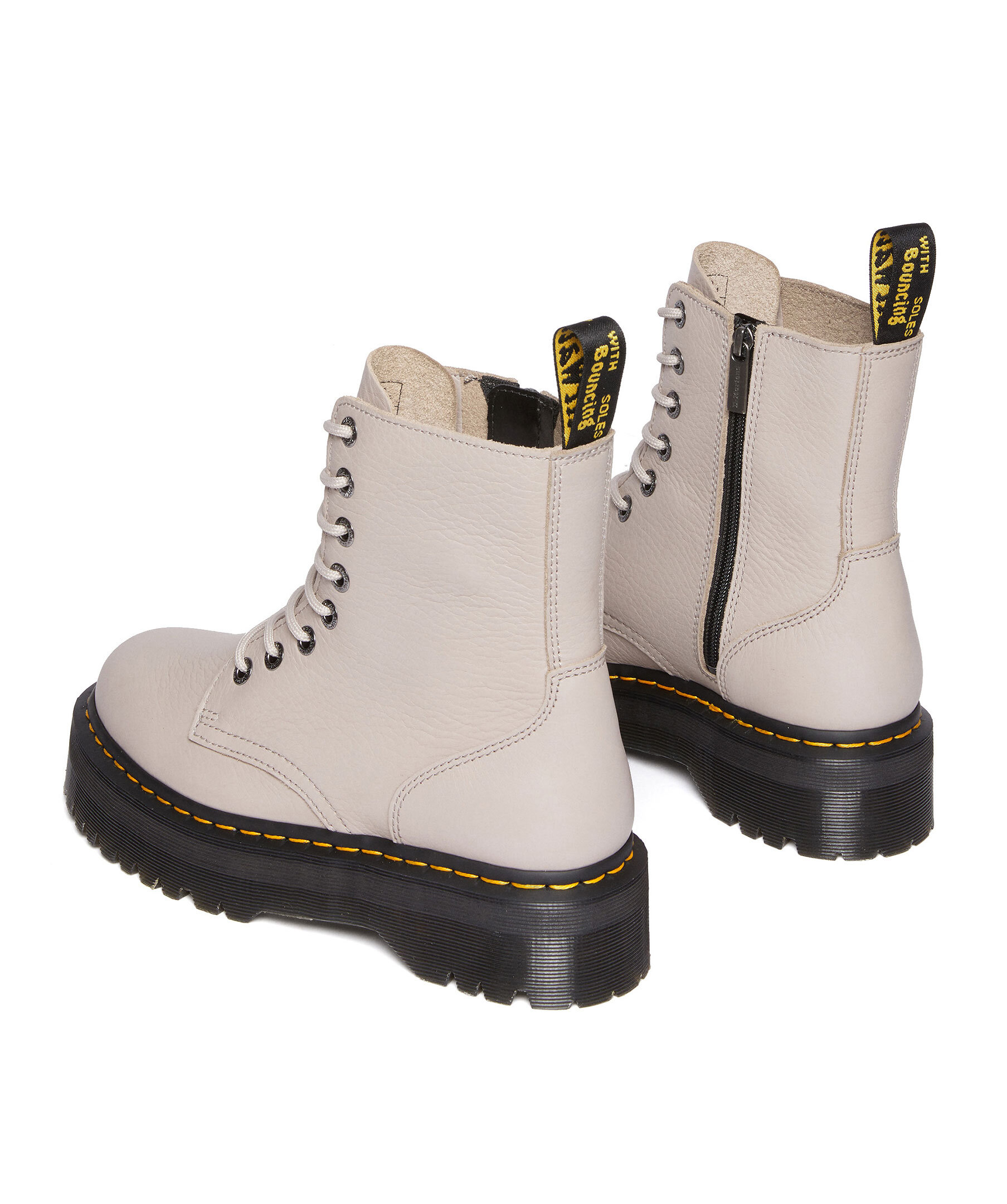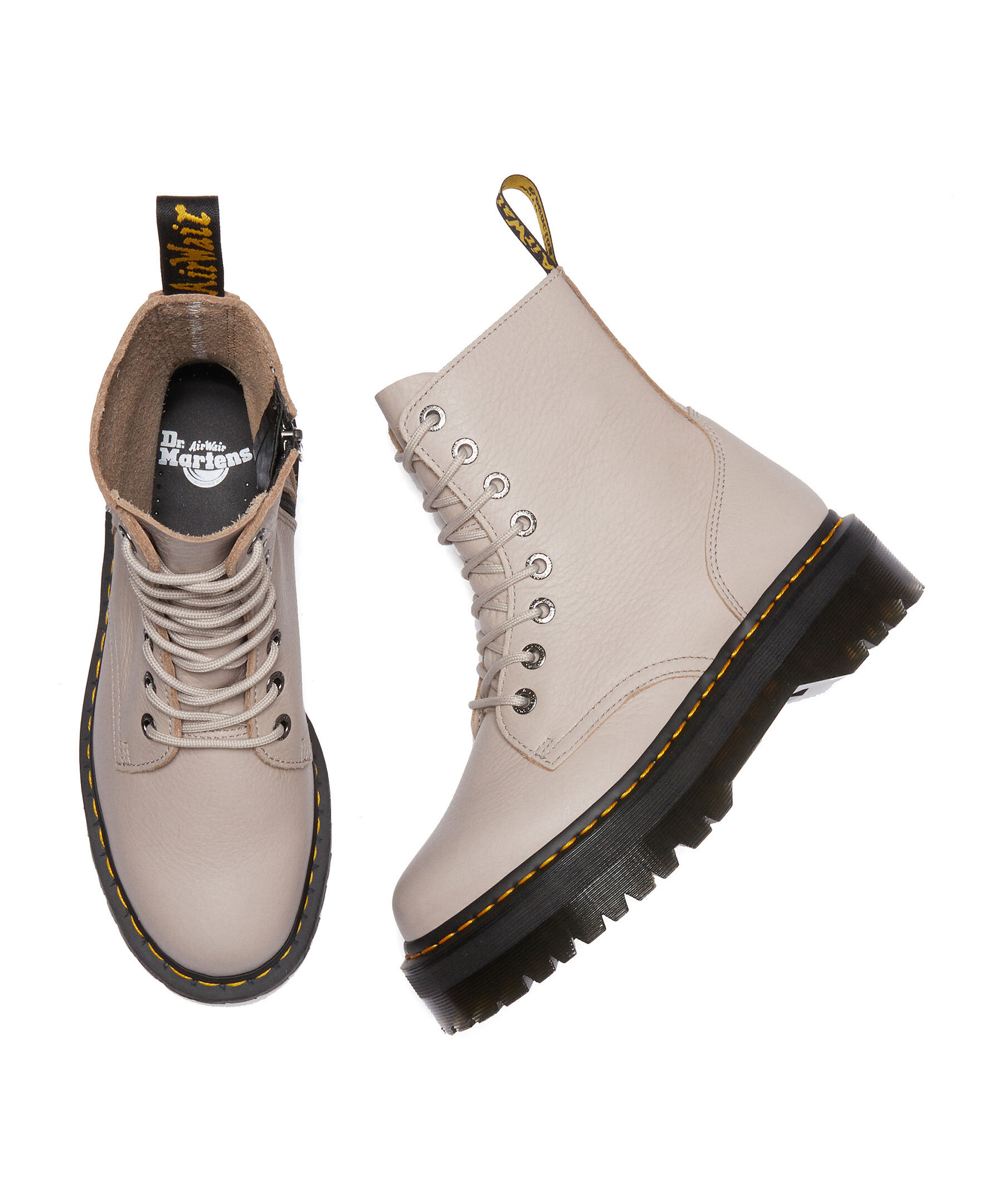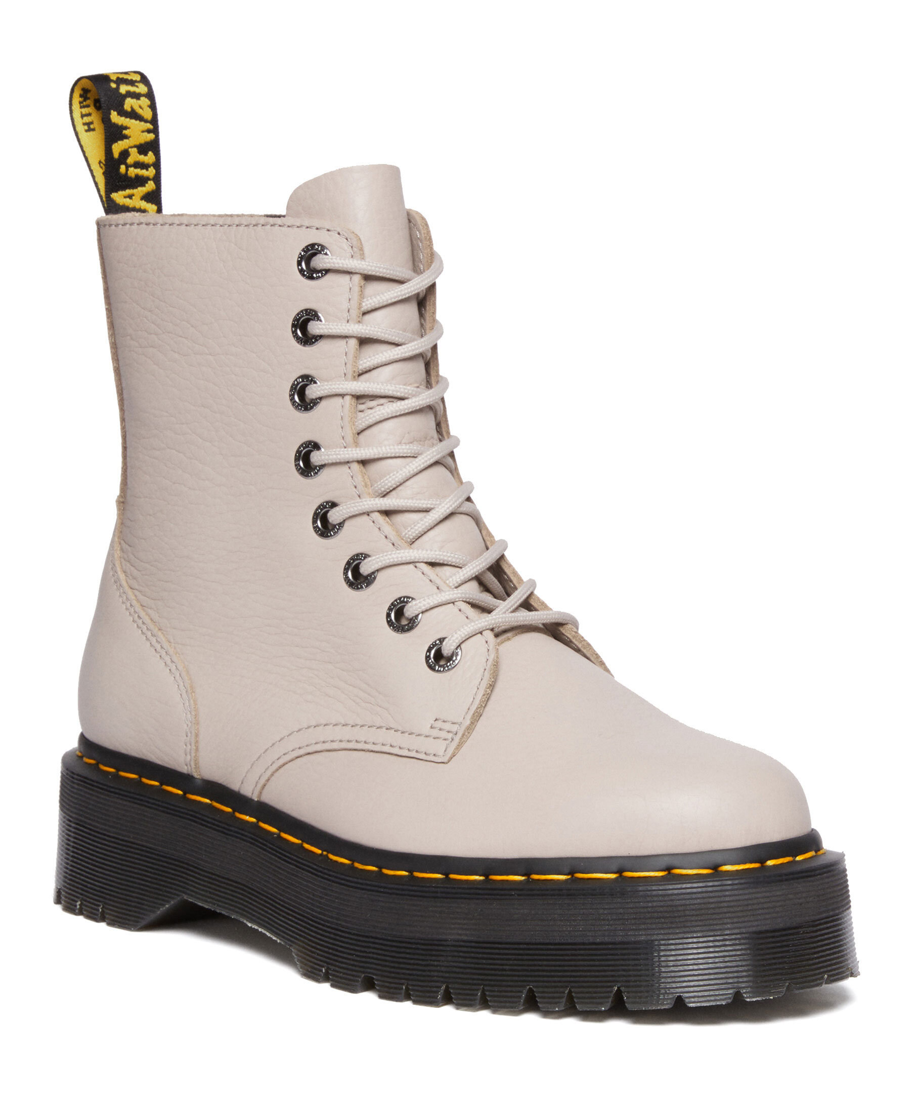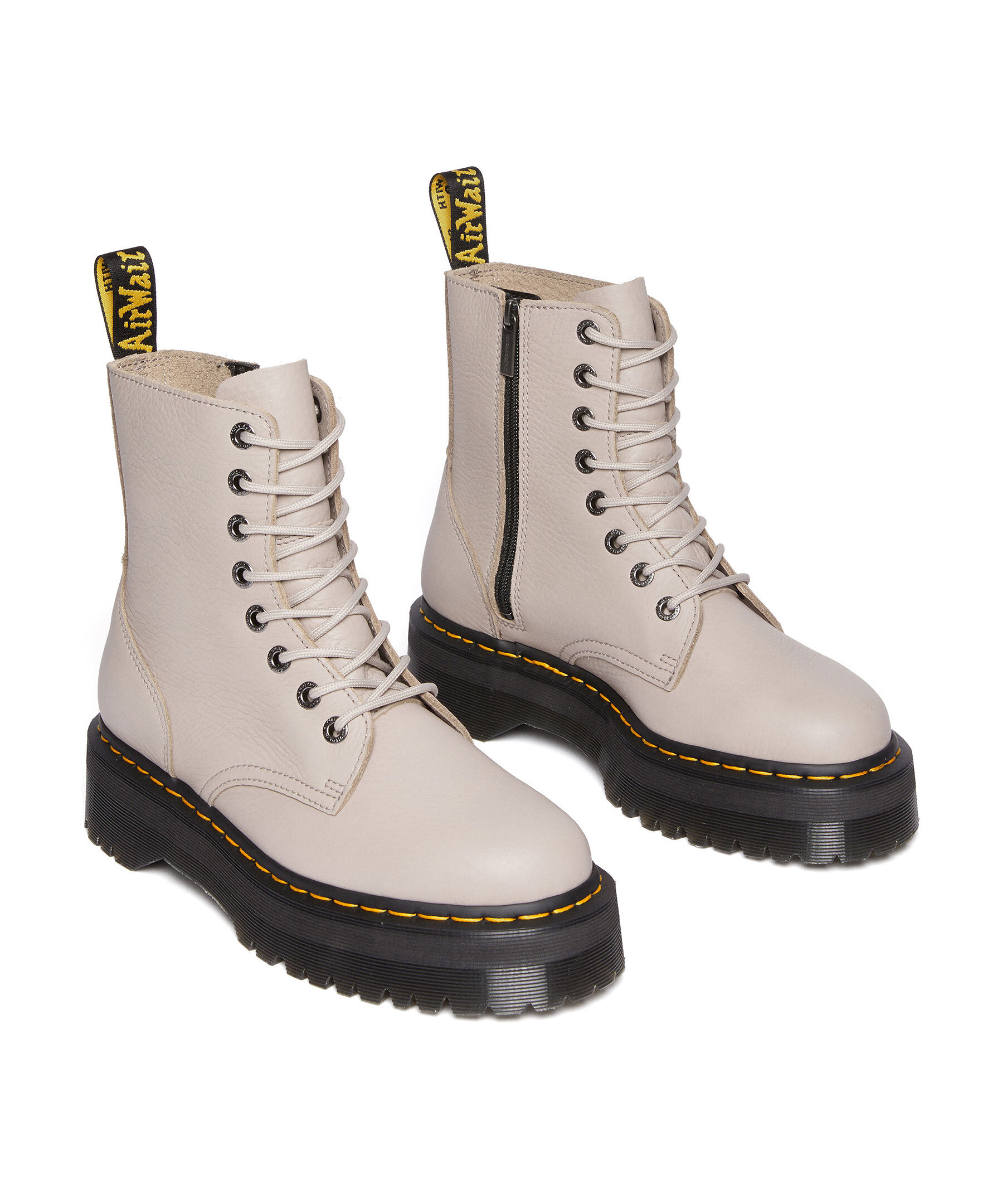 Taupefärgade klassiska läderkängor från Dr. Martens. Snörning framtill, dragkedja i sidan, ikonisk häl-ögla, tillverkade i läder med hög gummisula. Unisex-modell. 3,8 cm hög plattform i PVC.