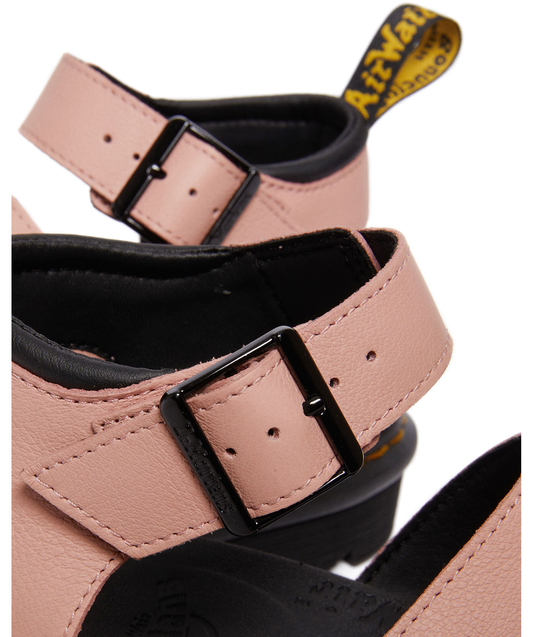 Rosa sandaler med attityd från Dr. Martens. Extra komfort, justerbar rem upptill och tre remmar över foten. En superlätt sula i PVC med en svag luftning för ytterligare höjd och en extremt slitstark Goodyear svetsning. Tillverkade av ett slätt, belagt läder med en matt finish.
