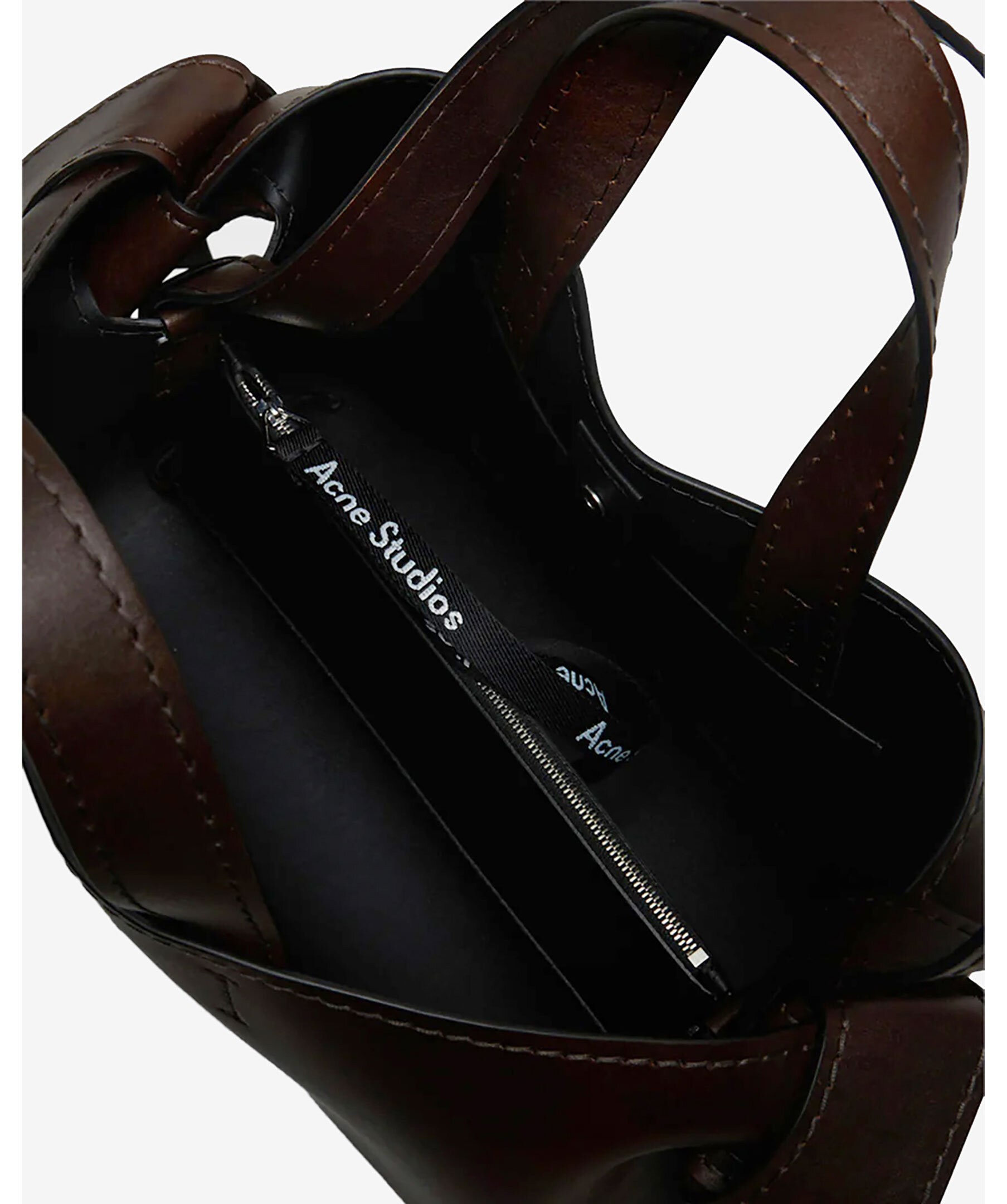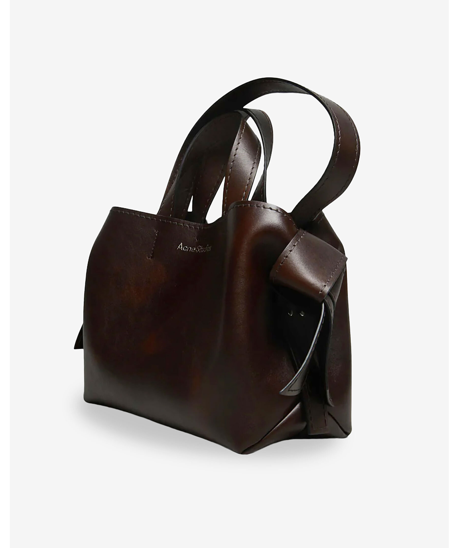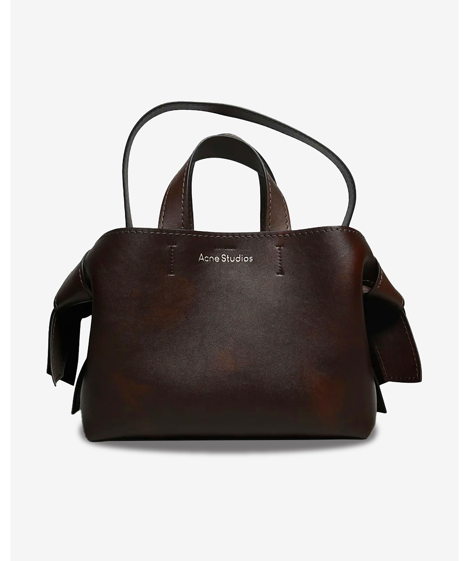 Stor mörkbrun väska från Acne Studios. Vridna knutar inspirerade av traditionella japanska obi-skärp på sidorna. Den har en präglad logotyp fram och tryckknappsstängning, som öppnas för att avslöja ett blixtlåsfack för förvaring av små saker. Väskan har handtag upptill samt en avtagbar och justerbar axelrem. Mått: Höjd: 26 cm, Bredd: 34,5 cm, Djup: 15,5 cm. Skal: 100 % kalvläder, foder: 100 % lammskinn.