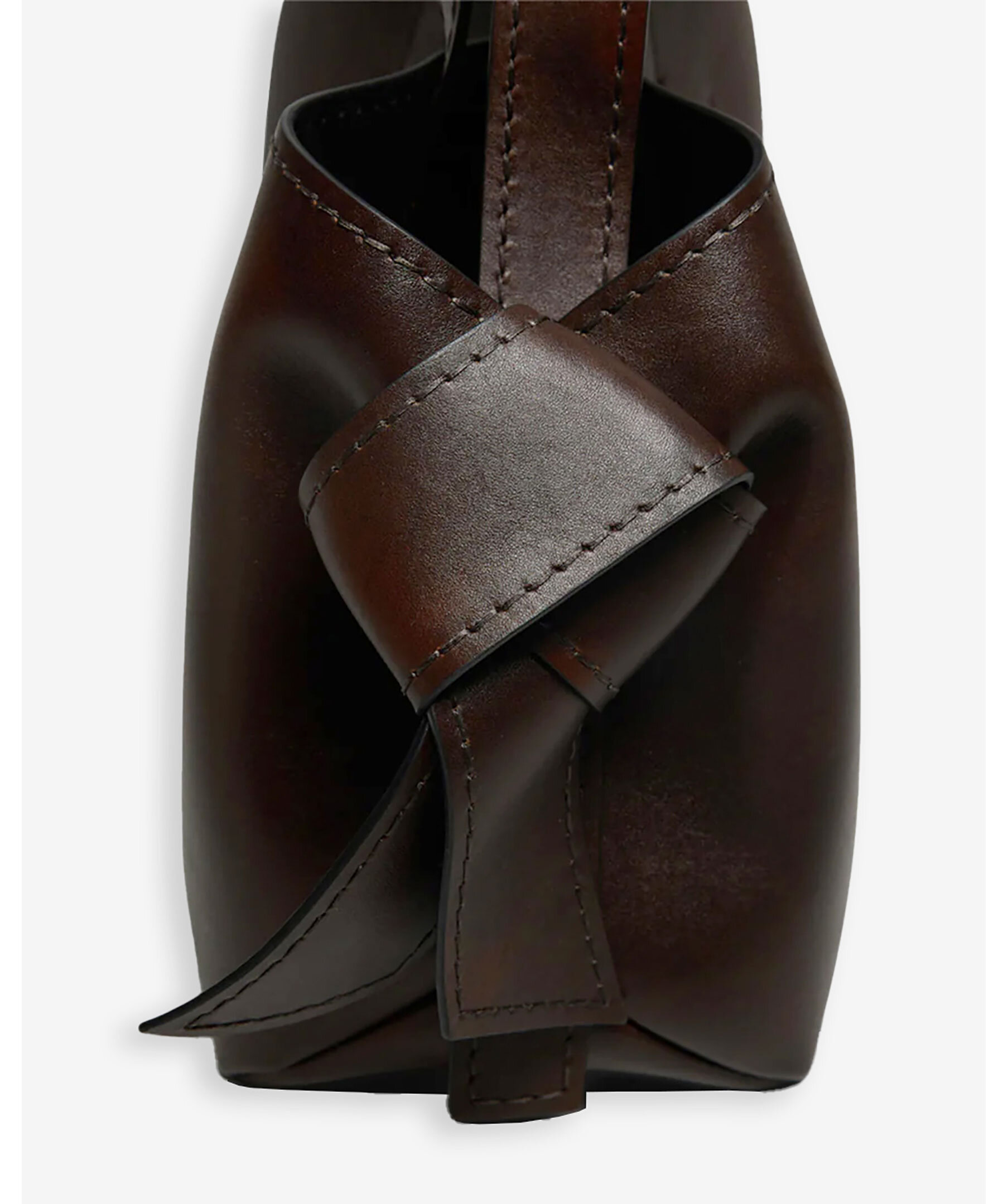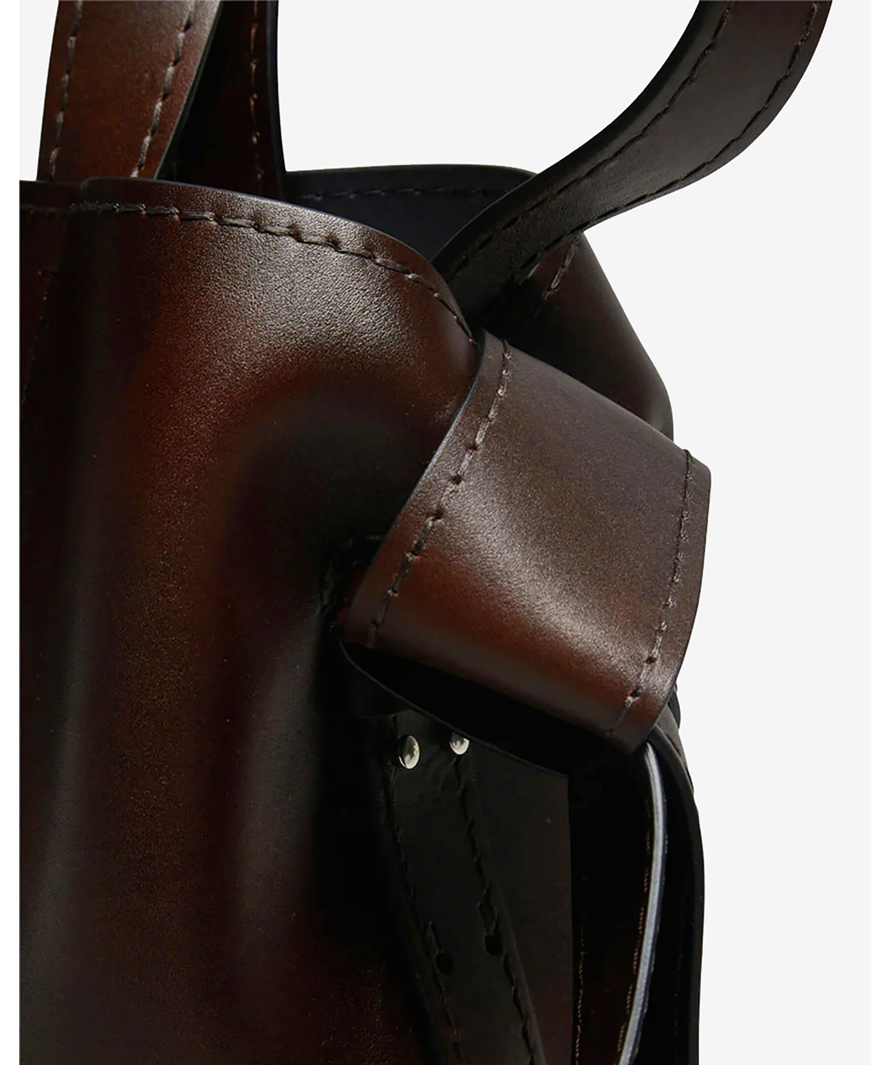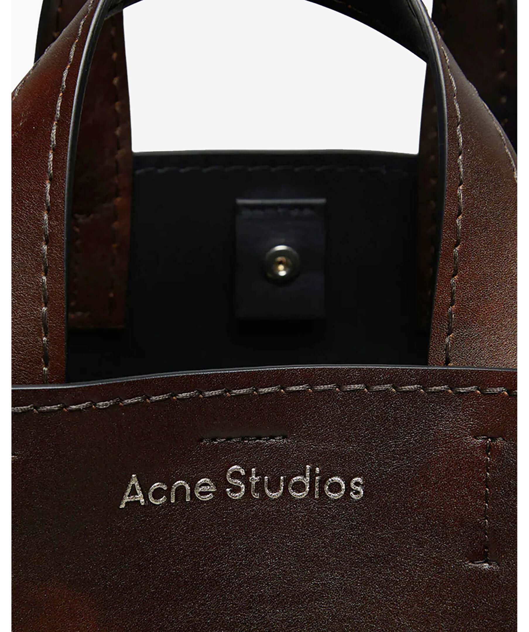 Stor mörkbrun väska från Acne Studios. Vridna knutar inspirerade av traditionella japanska obi-skärp på sidorna. Den har en präglad logotyp fram och tryckknappsstängning, som öppnas för att avslöja ett blixtlåsfack för förvaring av små saker. Väskan har handtag upptill samt en avtagbar och justerbar axelrem. Mått: Höjd: 26 cm, Bredd: 34,5 cm, Djup: 15,5 cm. Skal: 100 % kalvläder, foder: 100 % lammskinn.
