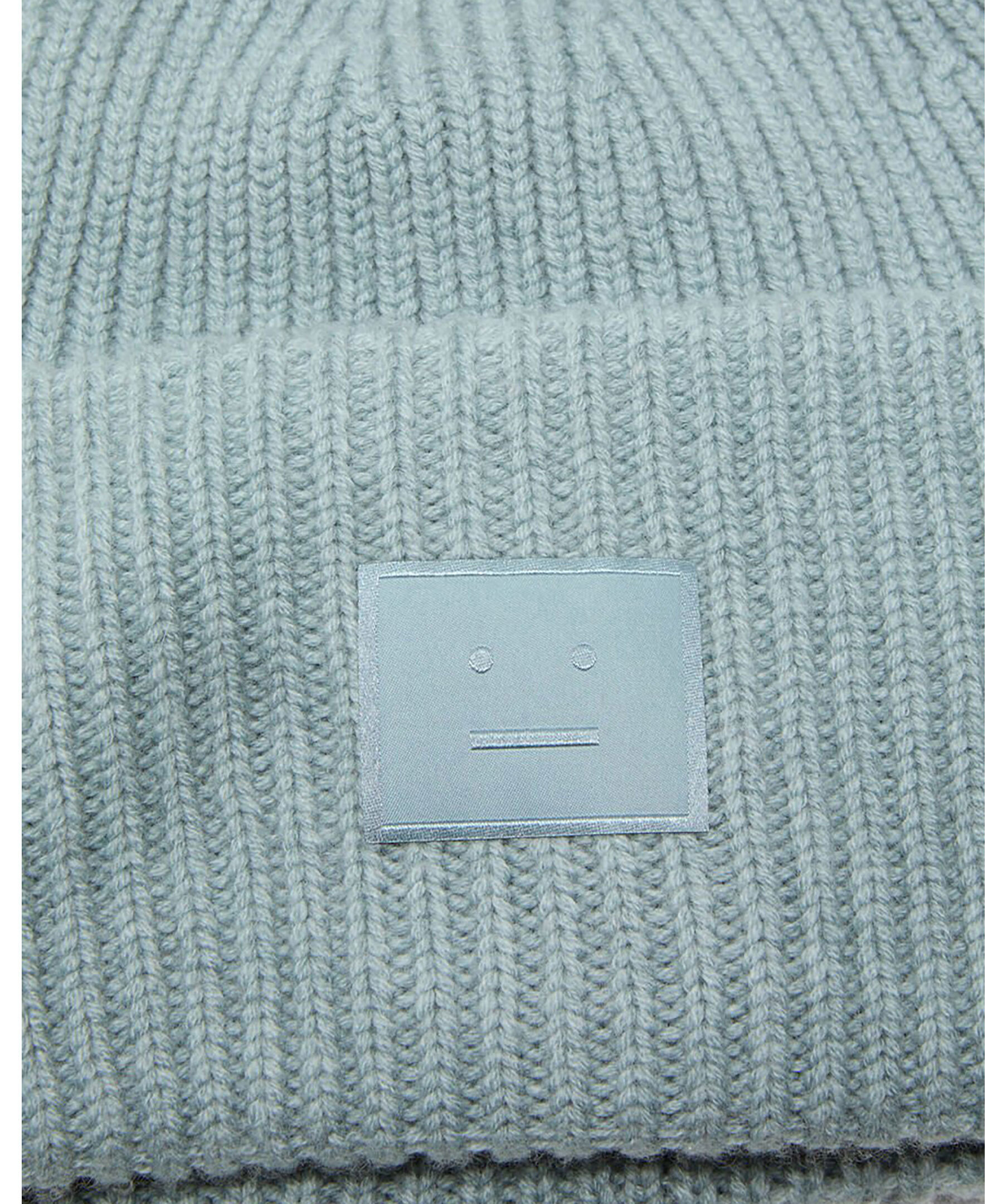 Blå, ribbstickad mössa från Acne Studios. Mössan har en bred, uppvikt kant samt deras signatur-smiley på framsidan. Tillverkad av noggrant utvalt yakgarn av hög kvalitet.
