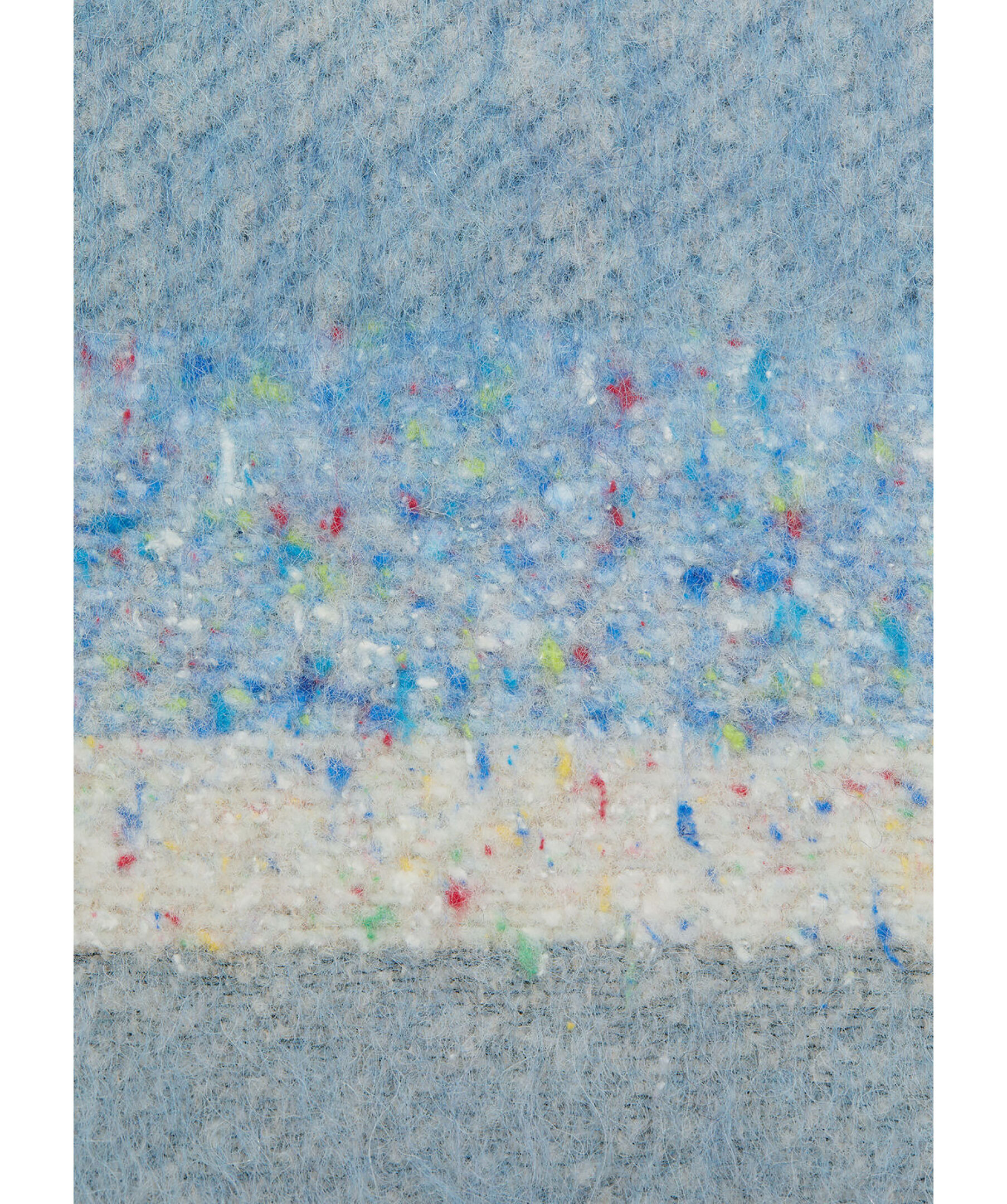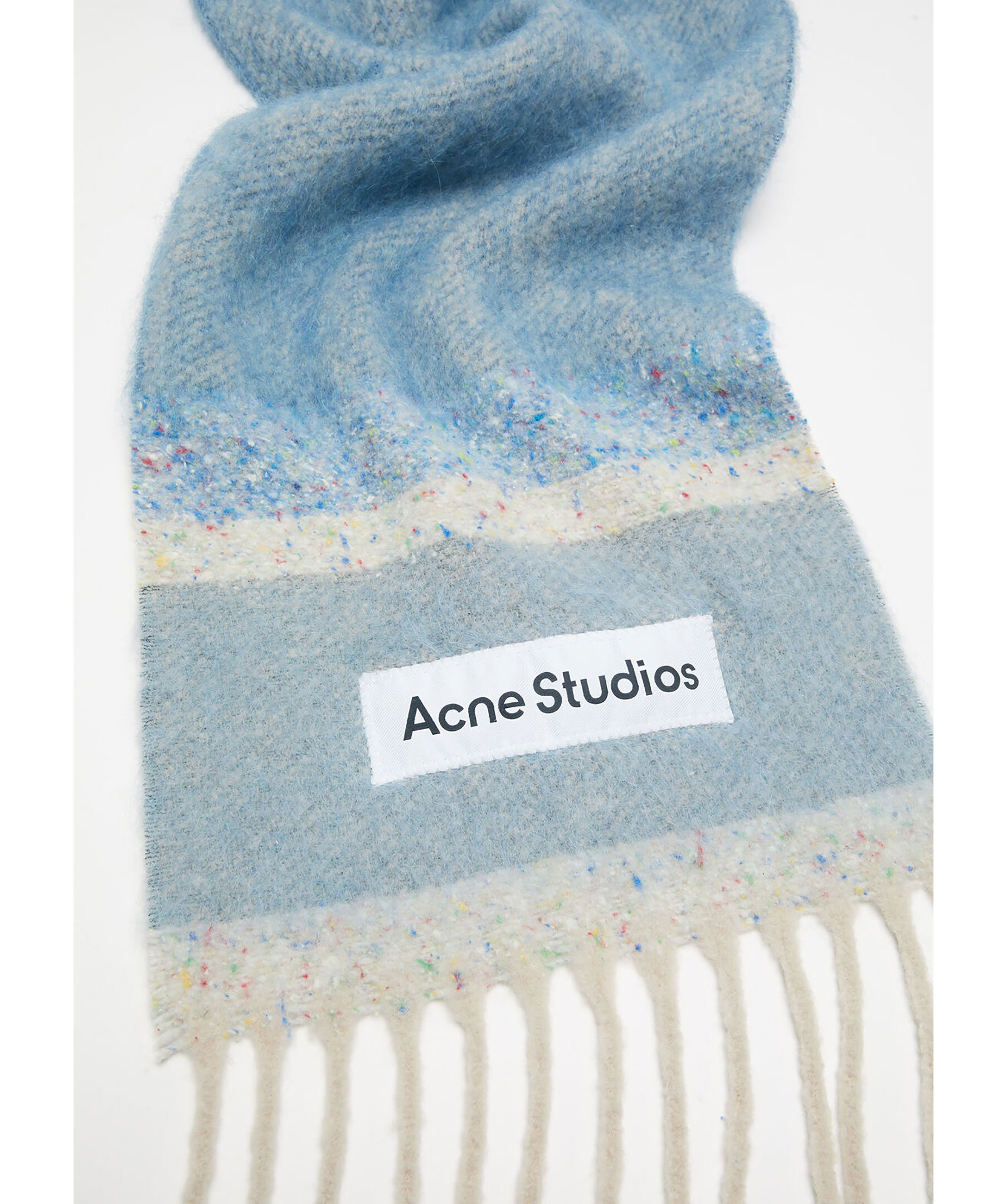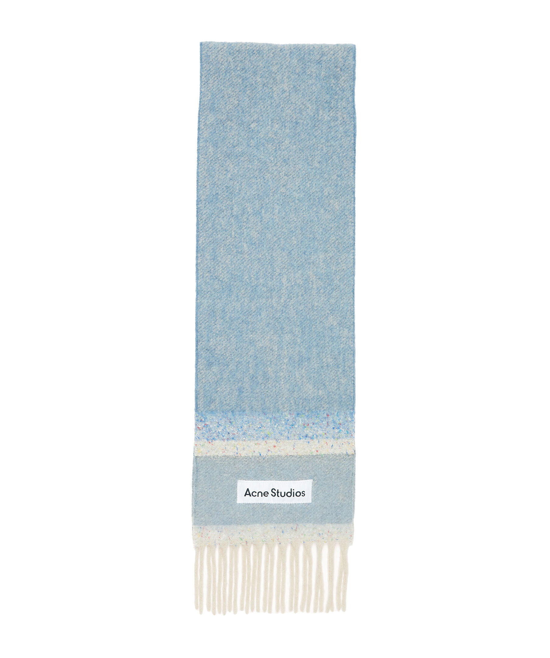 Fransad halsduk i en jeansblå färg från Acne studios. Tillverkad i en ull- och alpackablandning. Halsduken har en donegal-struktur och är detaljerad med en rosa Acne Studios-etikett. Mått: 30cm bred och 220cm lång.