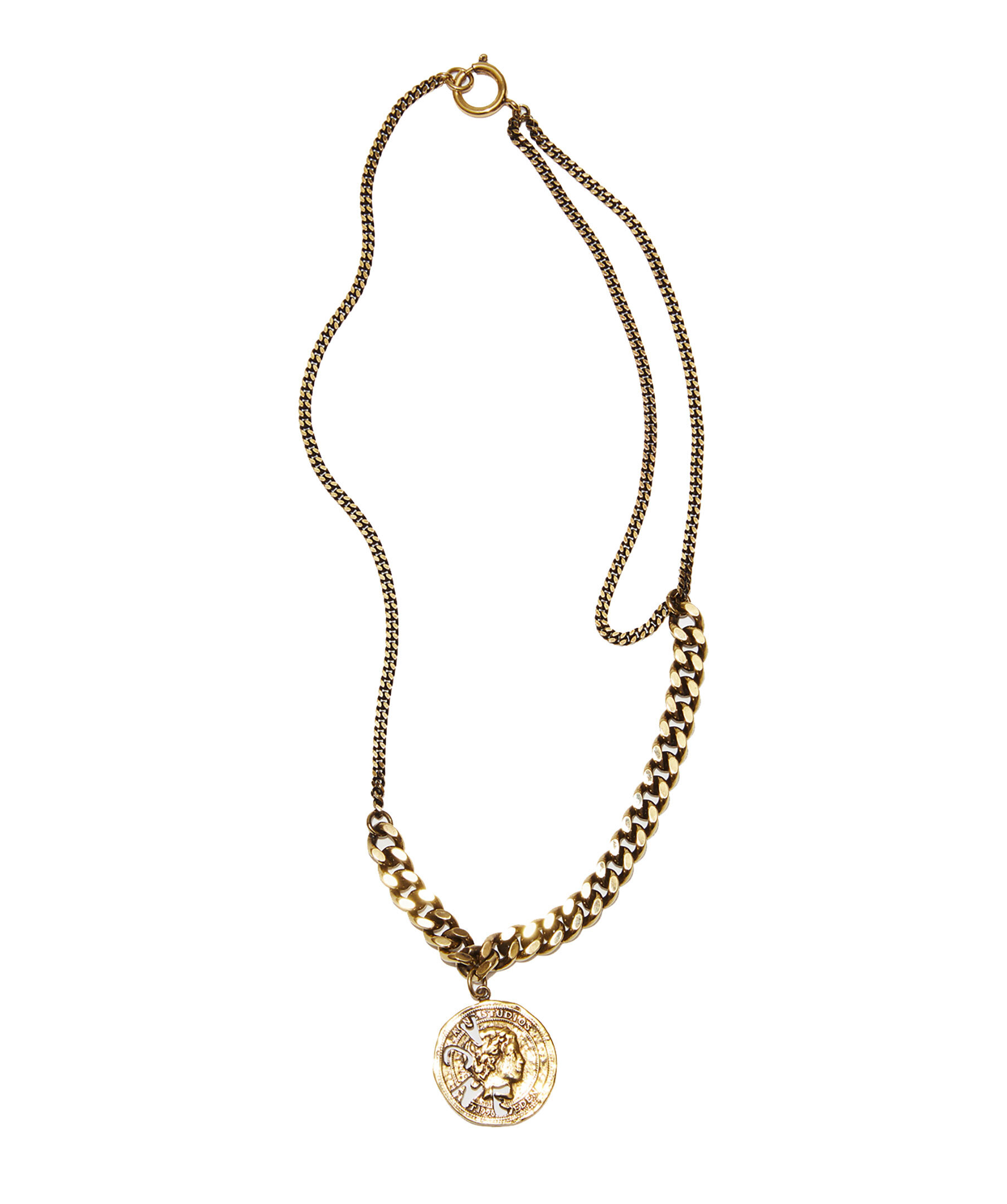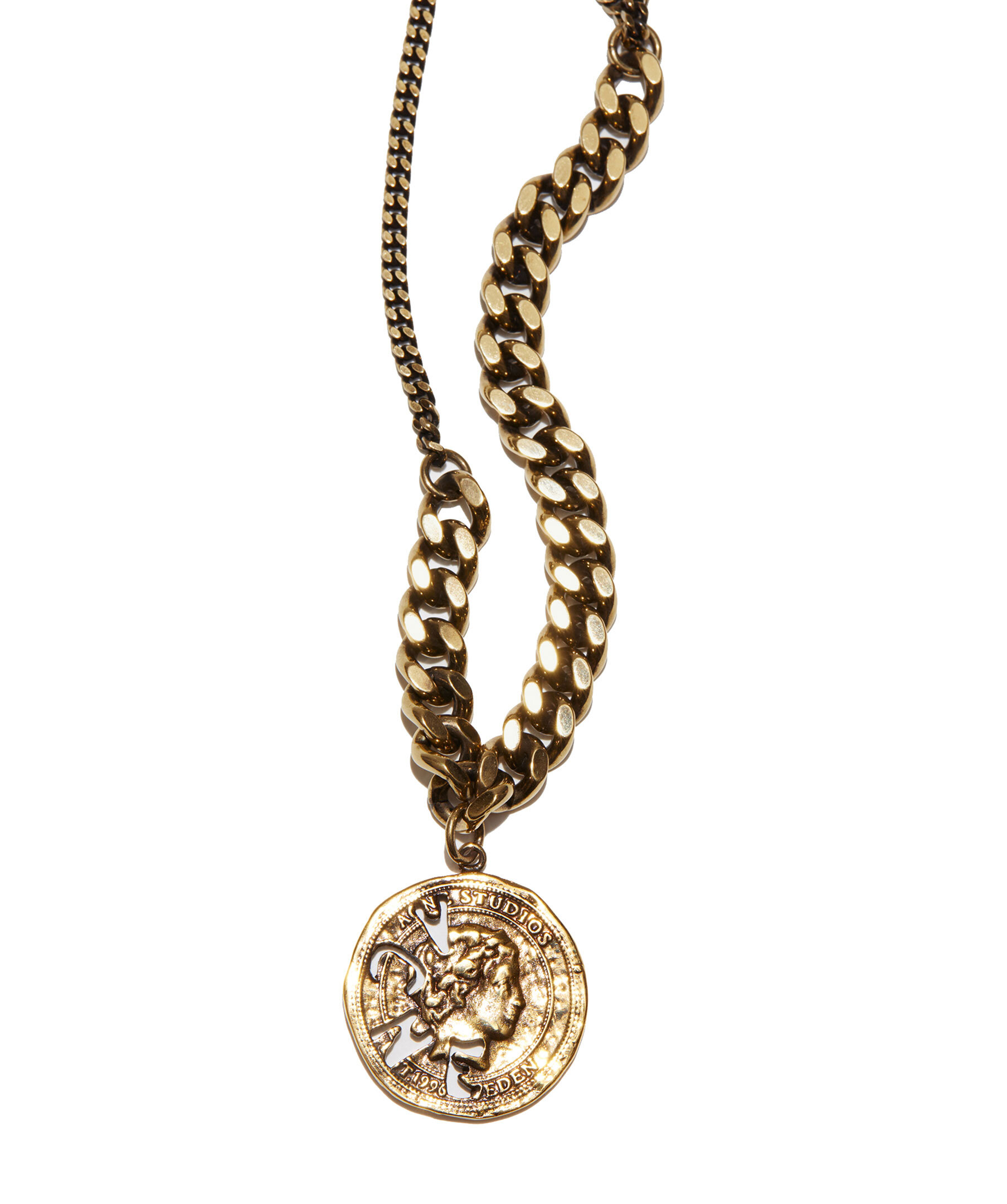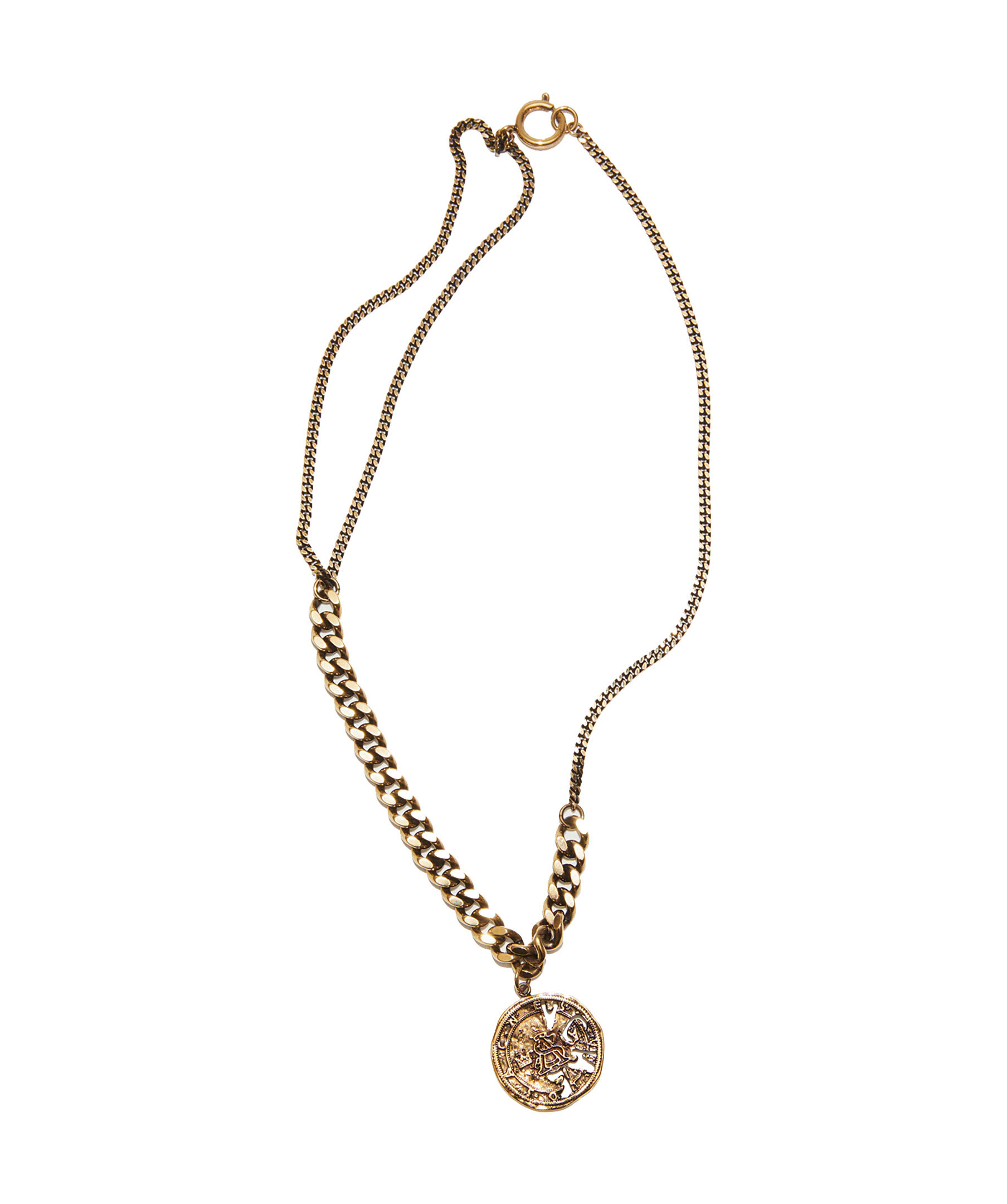 Guldfärgat halsband med mynt med utstansad logotyp. Grövre kedja framtill. Tillverkad i brass.