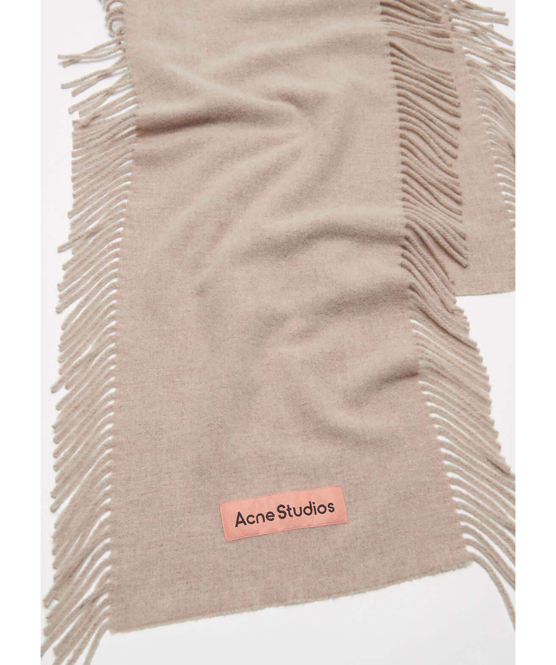 Beige halsduk från Acne Studios. Halsduken har fransar längst med långsidorna, detaljerad med en Acne Studios logotypetikett. Tillverkad av 100% ull.