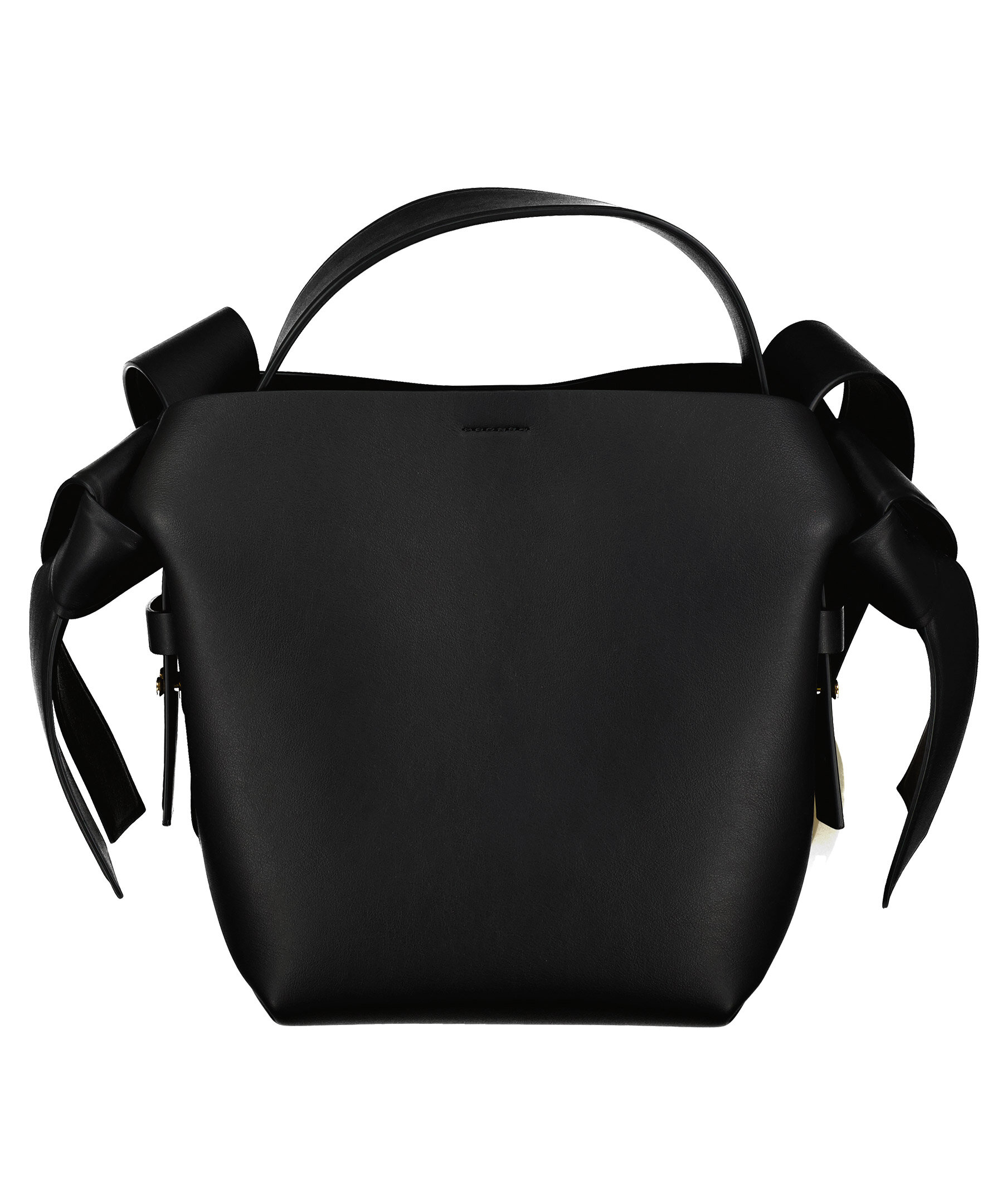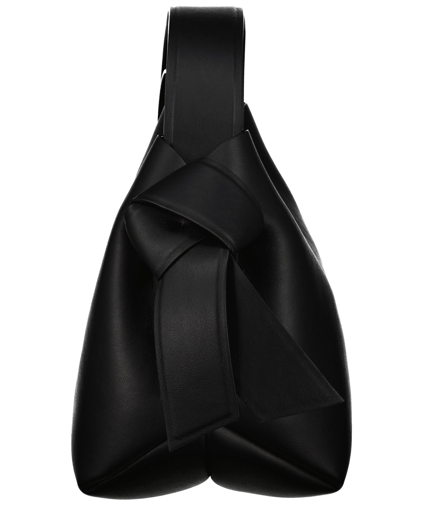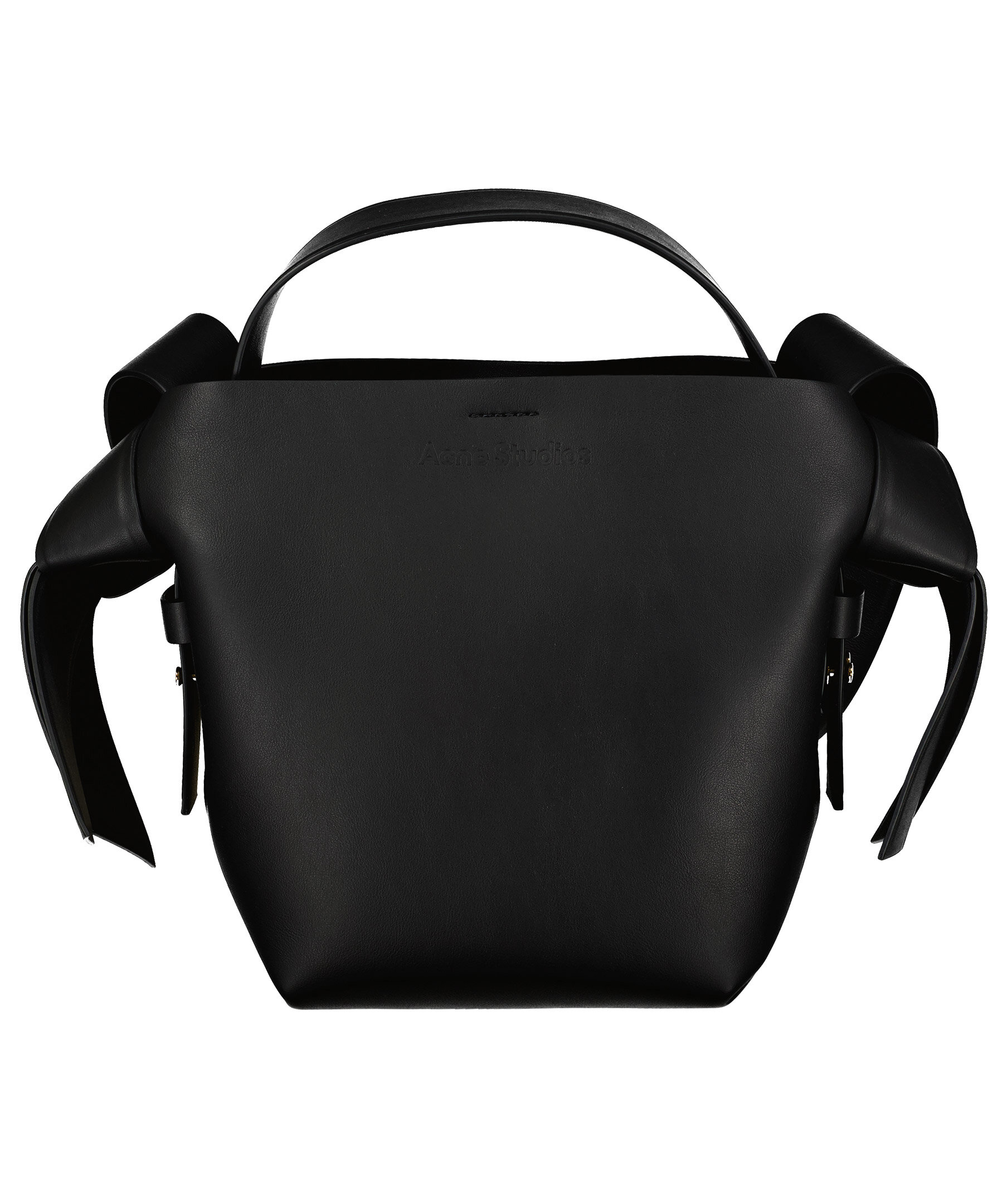 Svart väska i mini storlek från Acne Studios. Har vridna knutar inspirerade av traditionella japanska obi-skärp på sidorna. Den har en präglad logotyp fram och tryckknappsstängning, som öppnas för att avslöja ett blixtlåsfack för förvaring av små saker. Mått: Höjd: 21 cm, längd: 15 cm, bredd: 15 cm.
