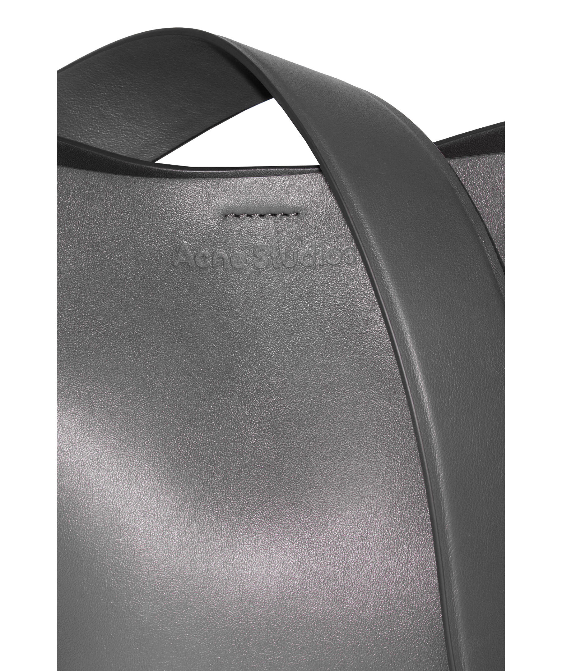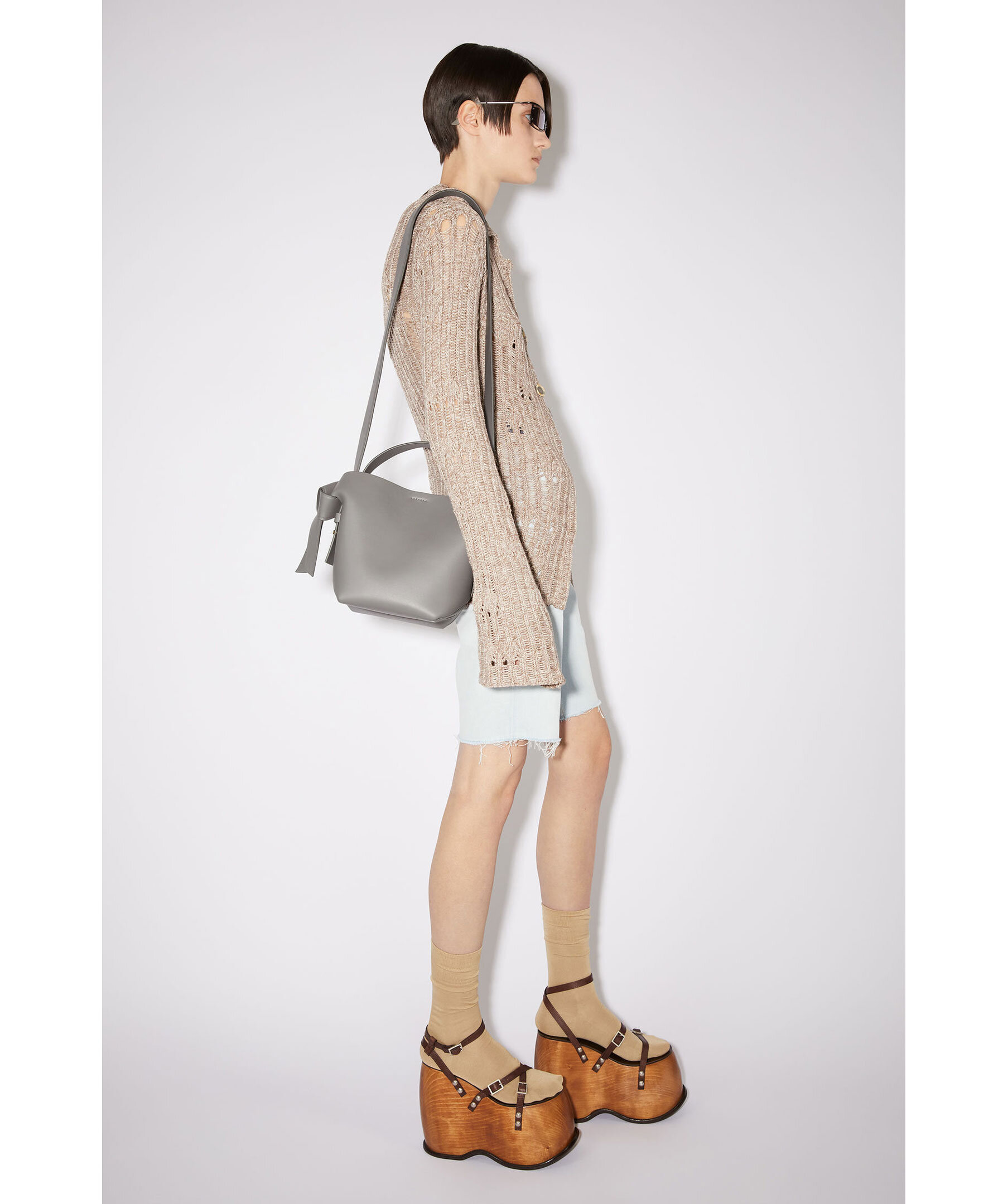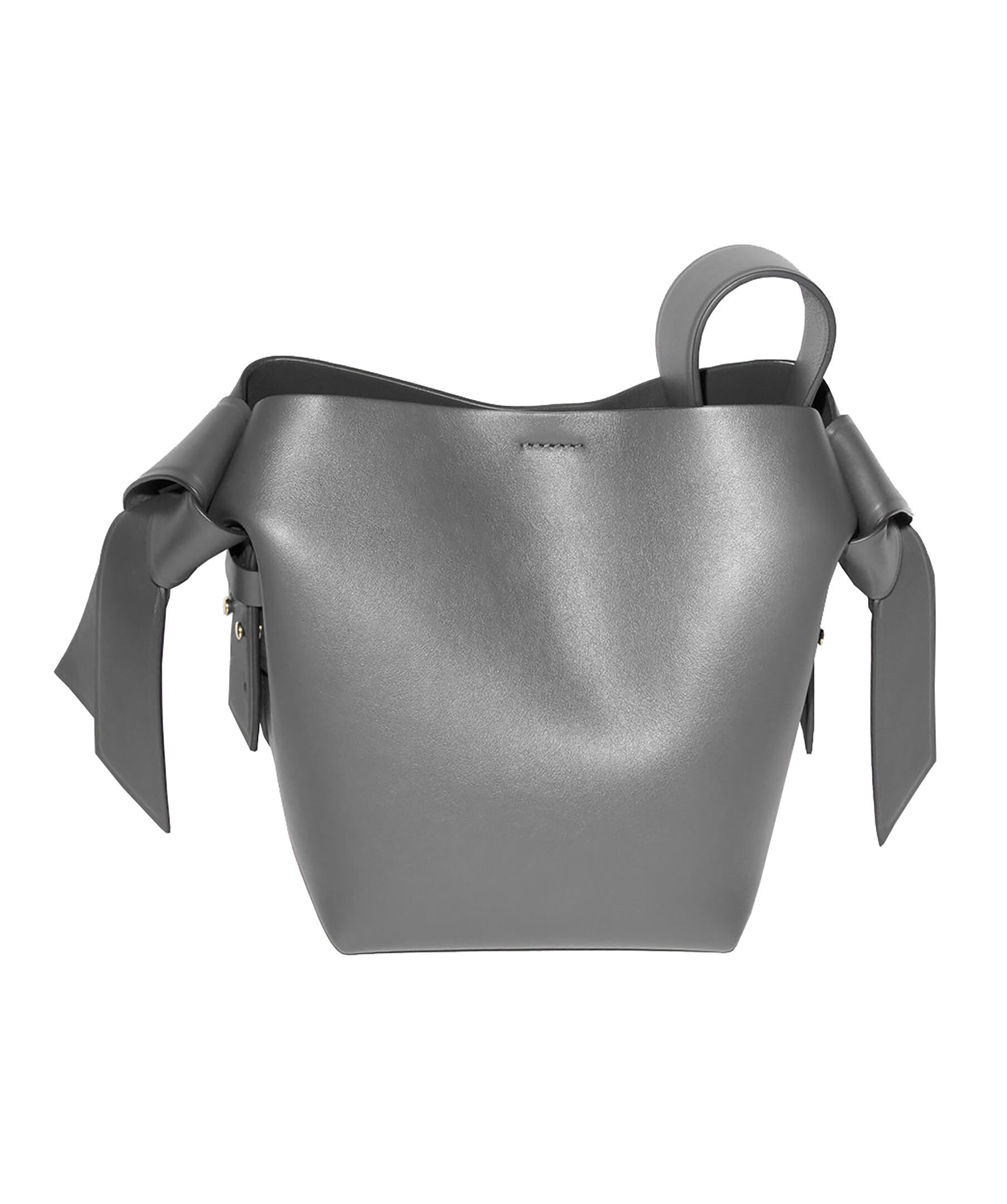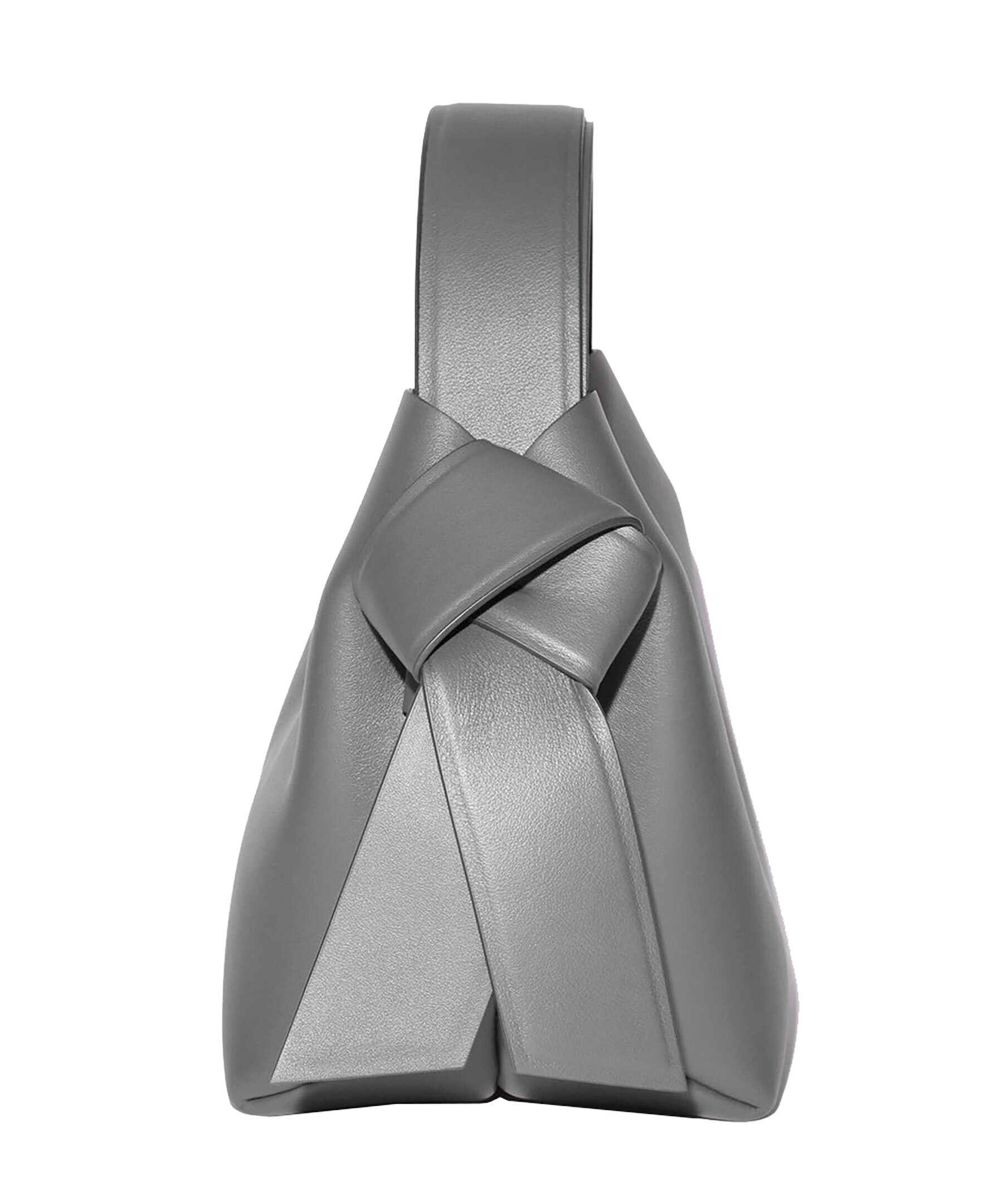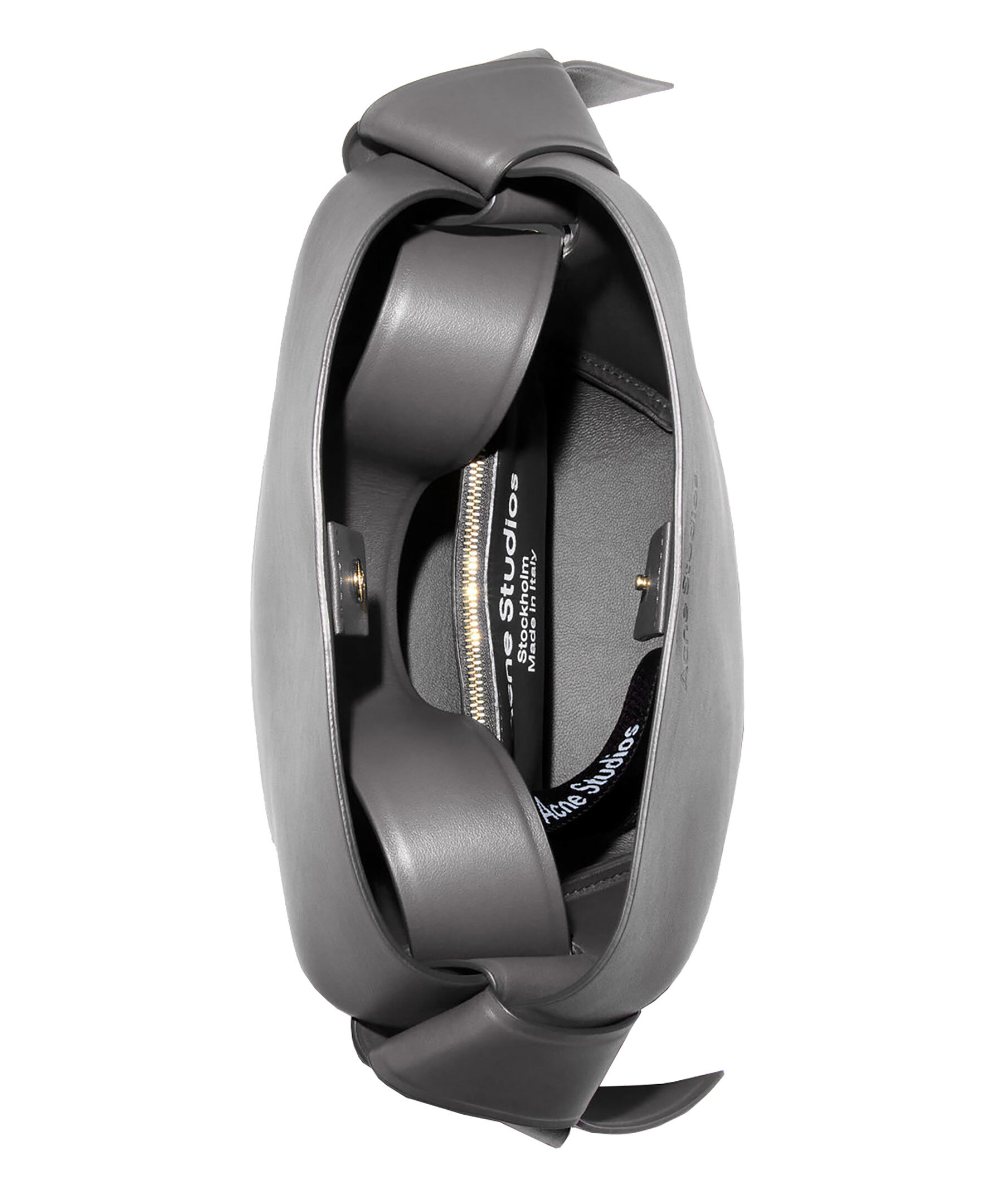 Mörkgrå väska i mini storlek från Acne Studios. Har vridna knutar inspirerade av traditionella japanska obi-skärp på sidorna. Den har en präglad logotyp fram och tryckknappsstängning, som öppnas för att avslöja ett blixtlåsfack för förvaring av små saker. Mått: 21,5 cm X 20,5 cm X 15,5 cm.