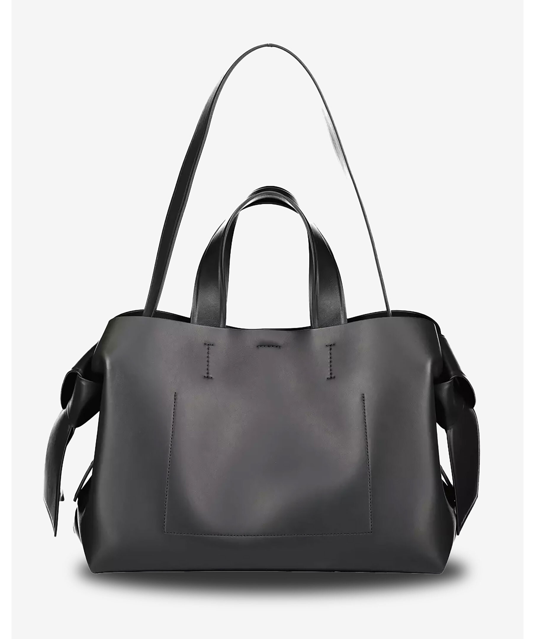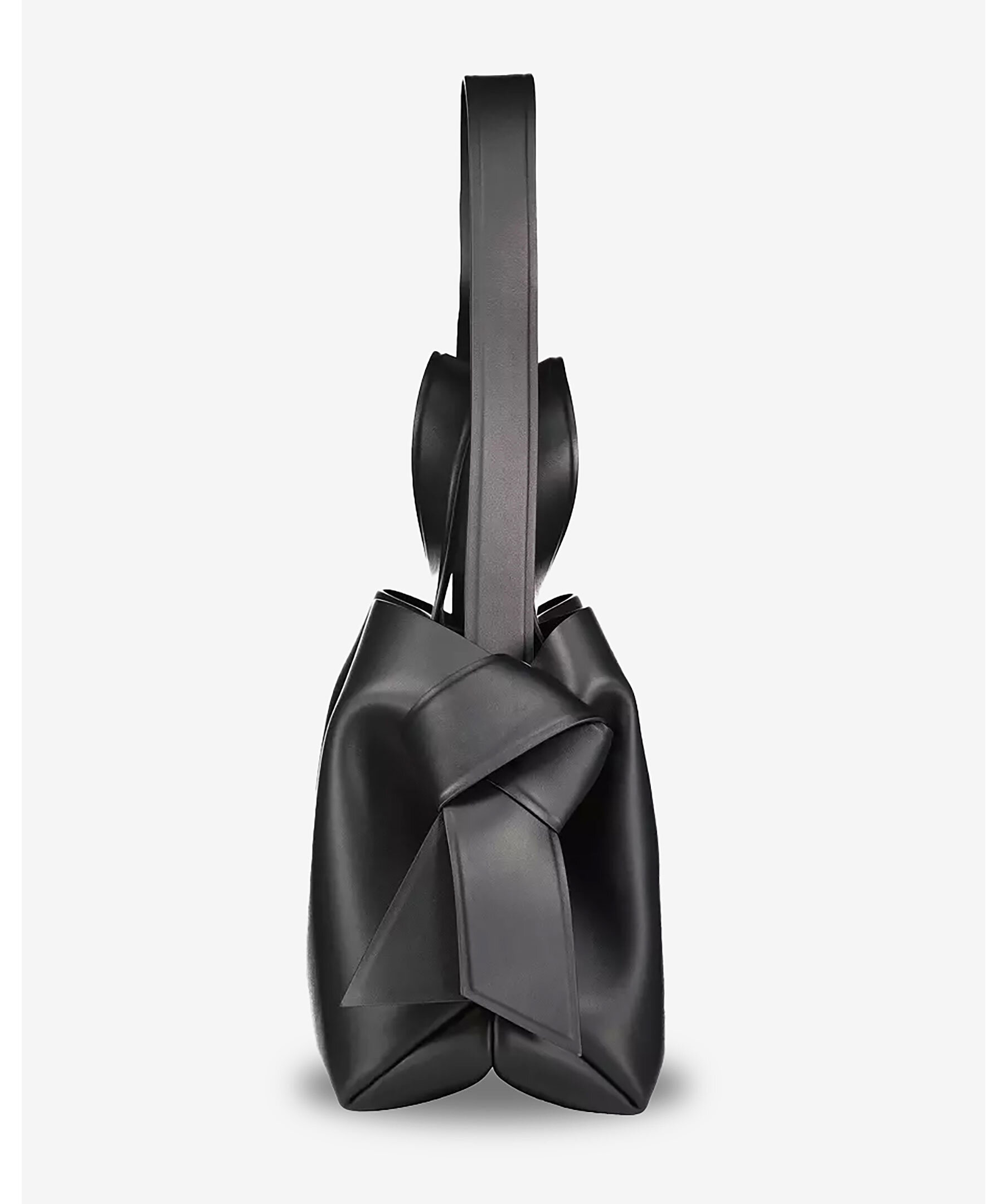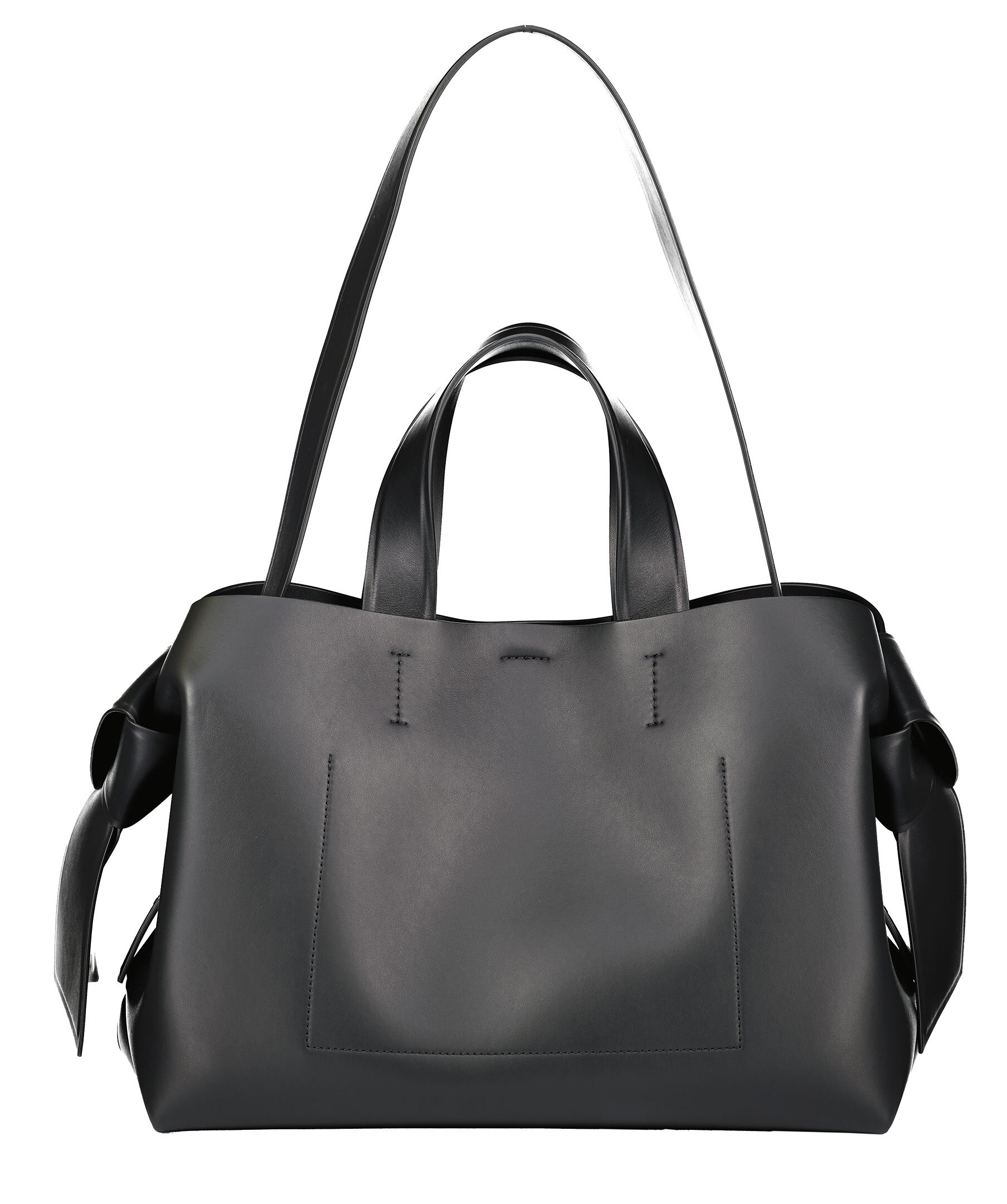 Svart Musubi väska från Acne Studios i Tote modell. Väskan är tillverkad av slätt matt läder, prydd med en musubi-knut på varje kortsida. Huvudfacket stängs med tryckknapp, innerficka som stängs med dragkedja. Präglad logotyp. Avtagbart crossbody-rem. Väskans mått: B: 34,5 cm H: 26 cm D: 15,5 cm.