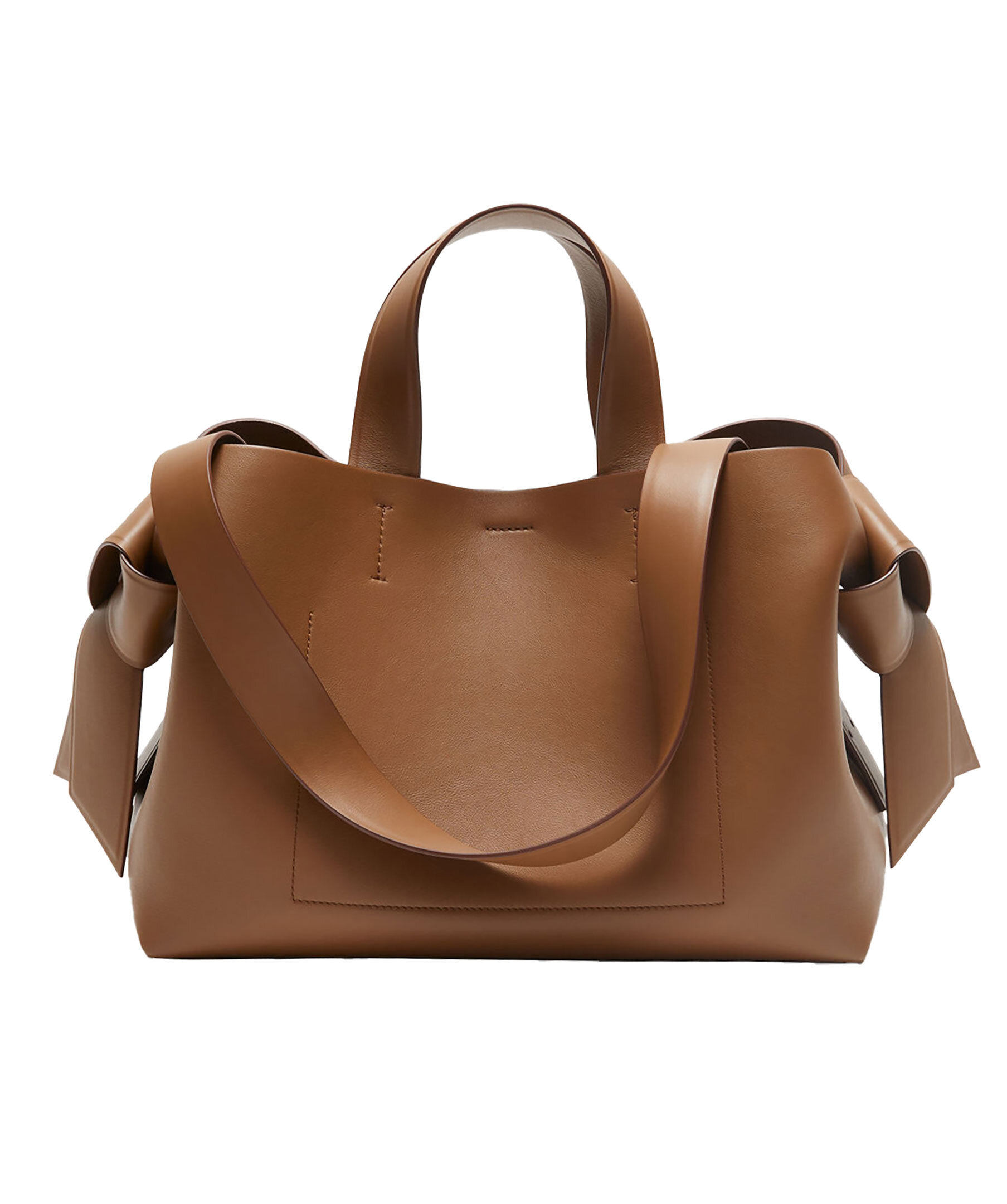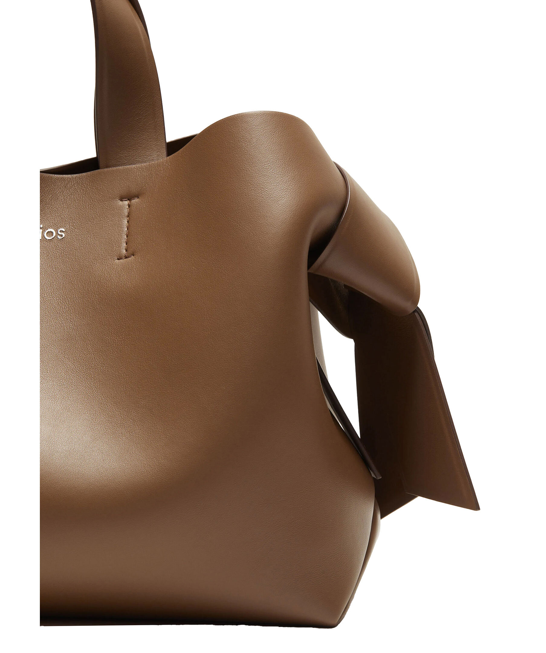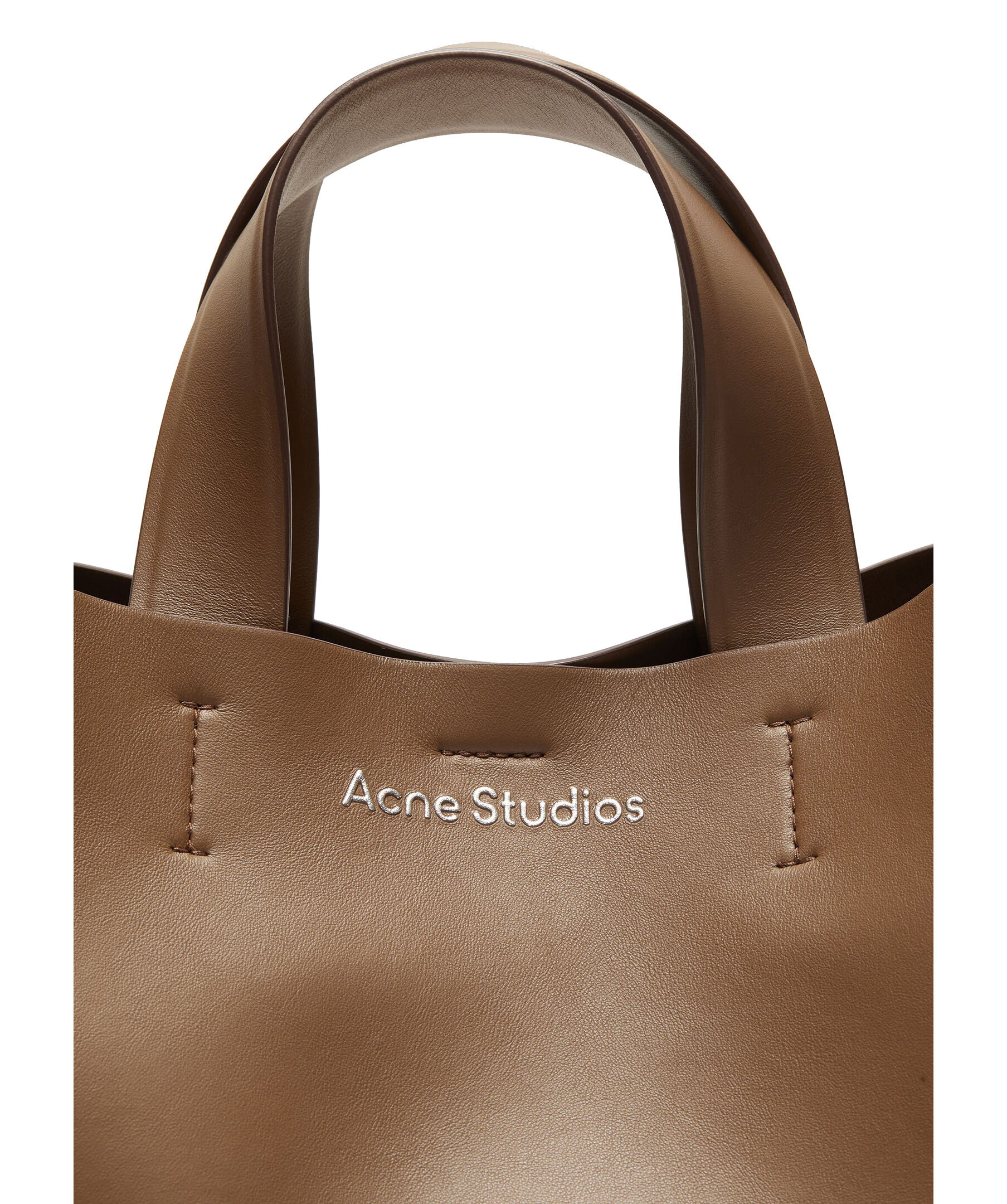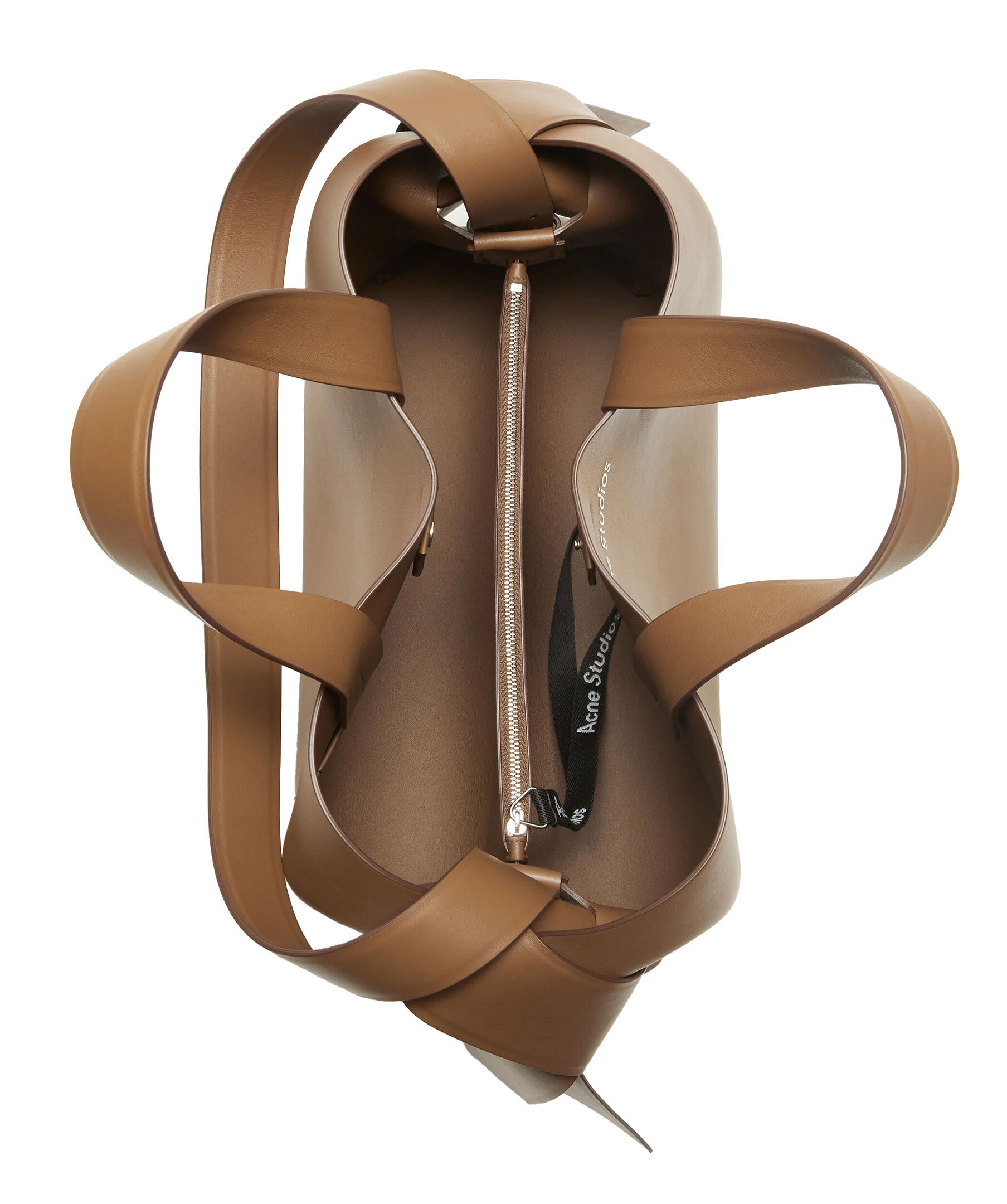 Brun Musubi väska från Acne Studios i Tote modell. Väskan är tillverkad av slätt matt läder, prydd med en musubi-knut på varje kortsida. Huvudfacket stängs med tryckknapp, innerficka som stängs med dragkedja. Präglad logotyp. Avtagbart crossbody-rem. Väskans mått: B: 34,5 cm H: 26 cm D: 15,5 cm.