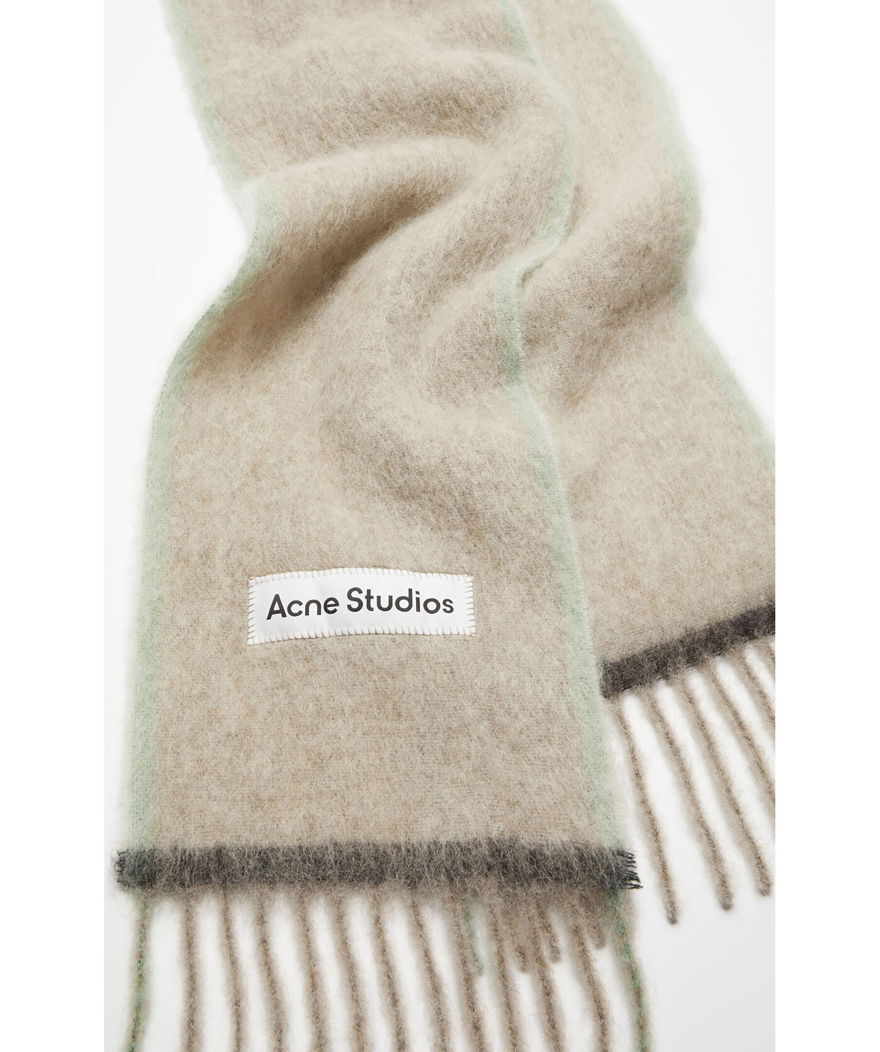 Gråbeige halsduk från Acne studios. Logotyp, fransar samt Vävd kontrastram. Halsduken är 28cm bred, 250cm lång och en fransrad på ca 12cm.