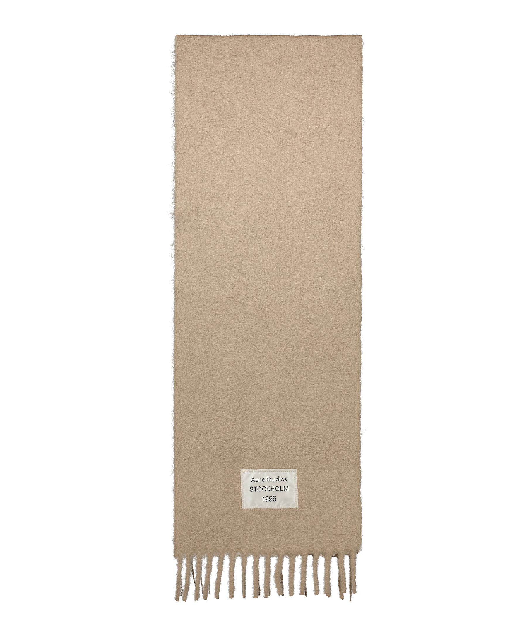 Kamelfärgad, fransad halsduk från Acne studios. Tillverkad i en blandning av alpacka och nylon. Halsduken har en mjuk och hårig konsistens och är detaljerad med en vit Acne Studios-etikett. Mått: 30cm bred och 205cm lång.