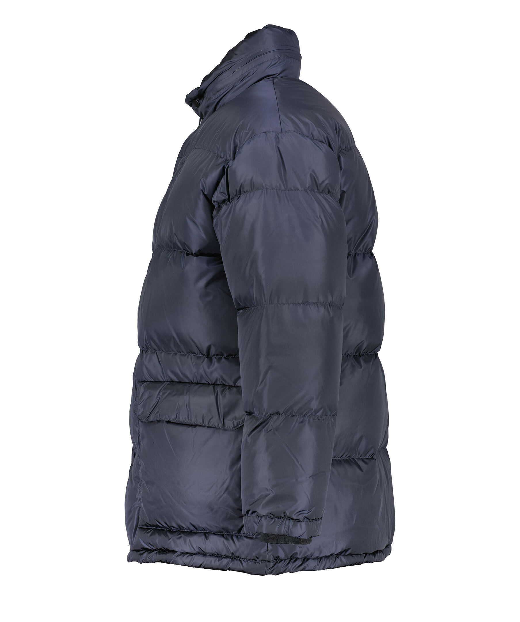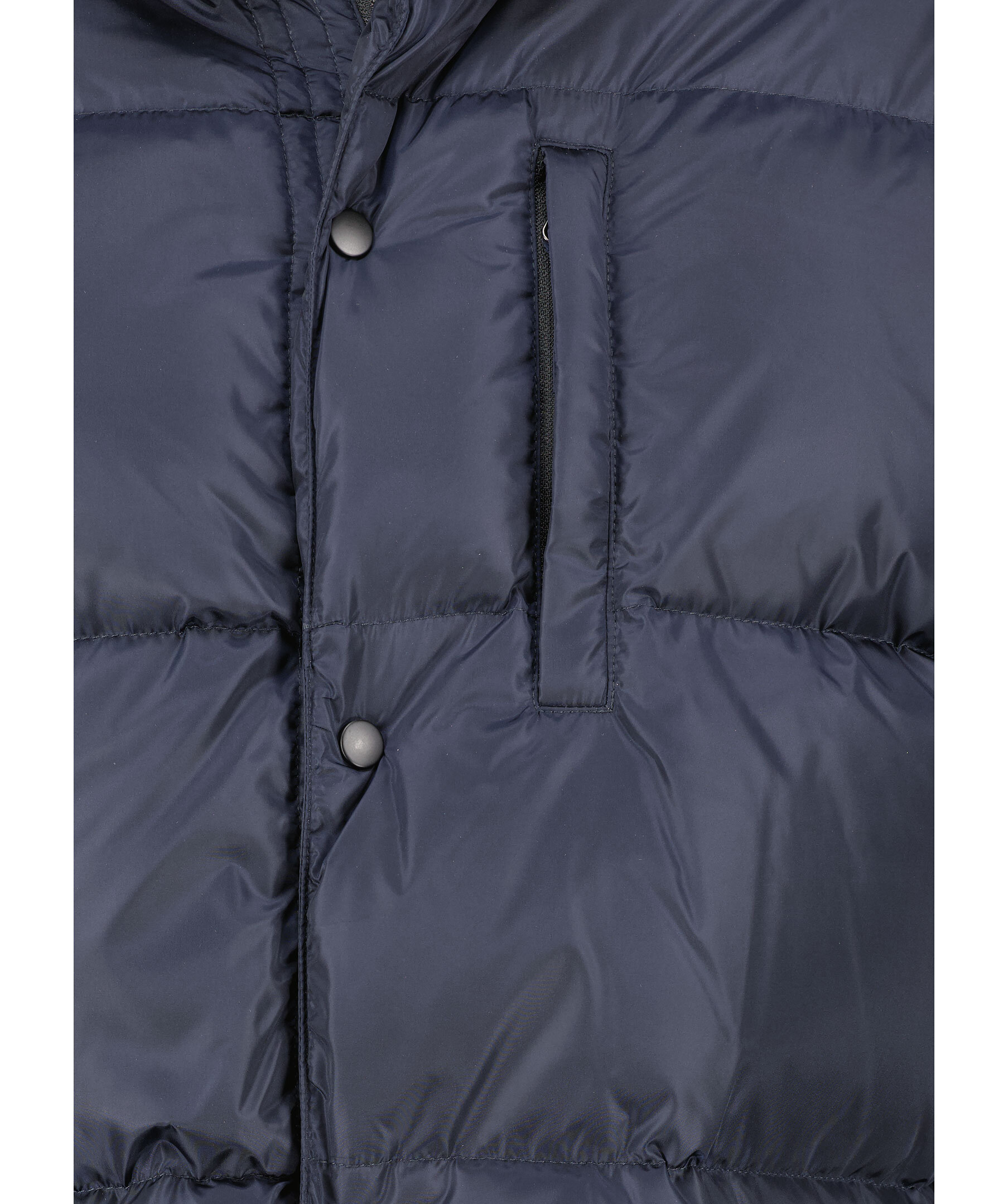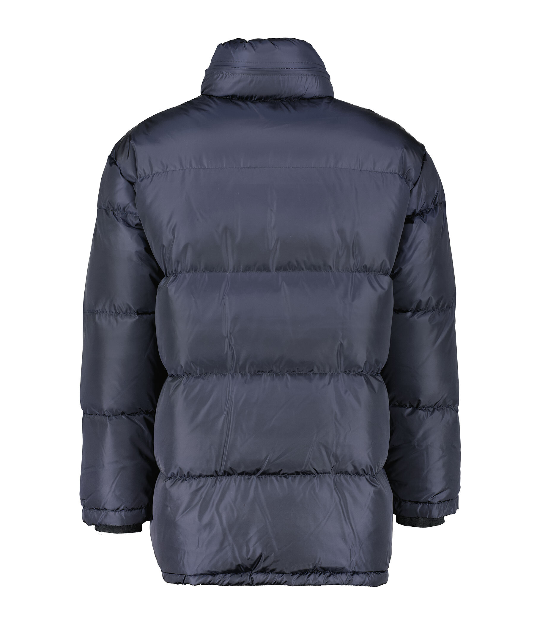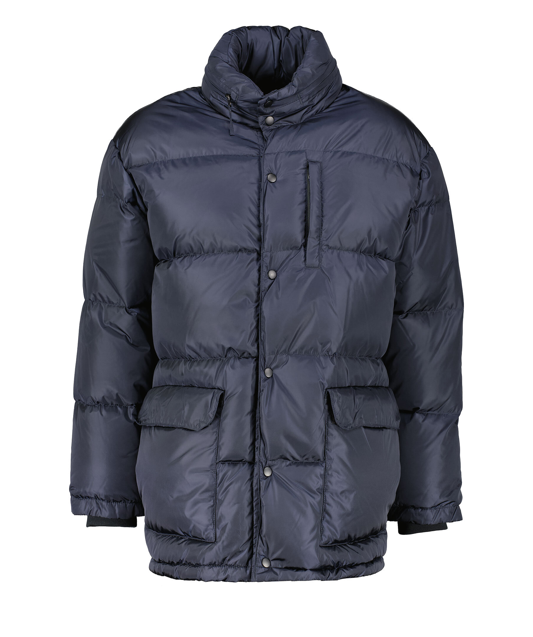 Marinblå pufferjacka från Aspesi. Jackan stängs med dold tvåvägsdragkedja och tryckknappar och har två stora fickor med lock och kardeborrestängning samt en bröstficka med dragkedja. Den har även en huva som går att stoppa in i kragen. Tillverkad i nylon.