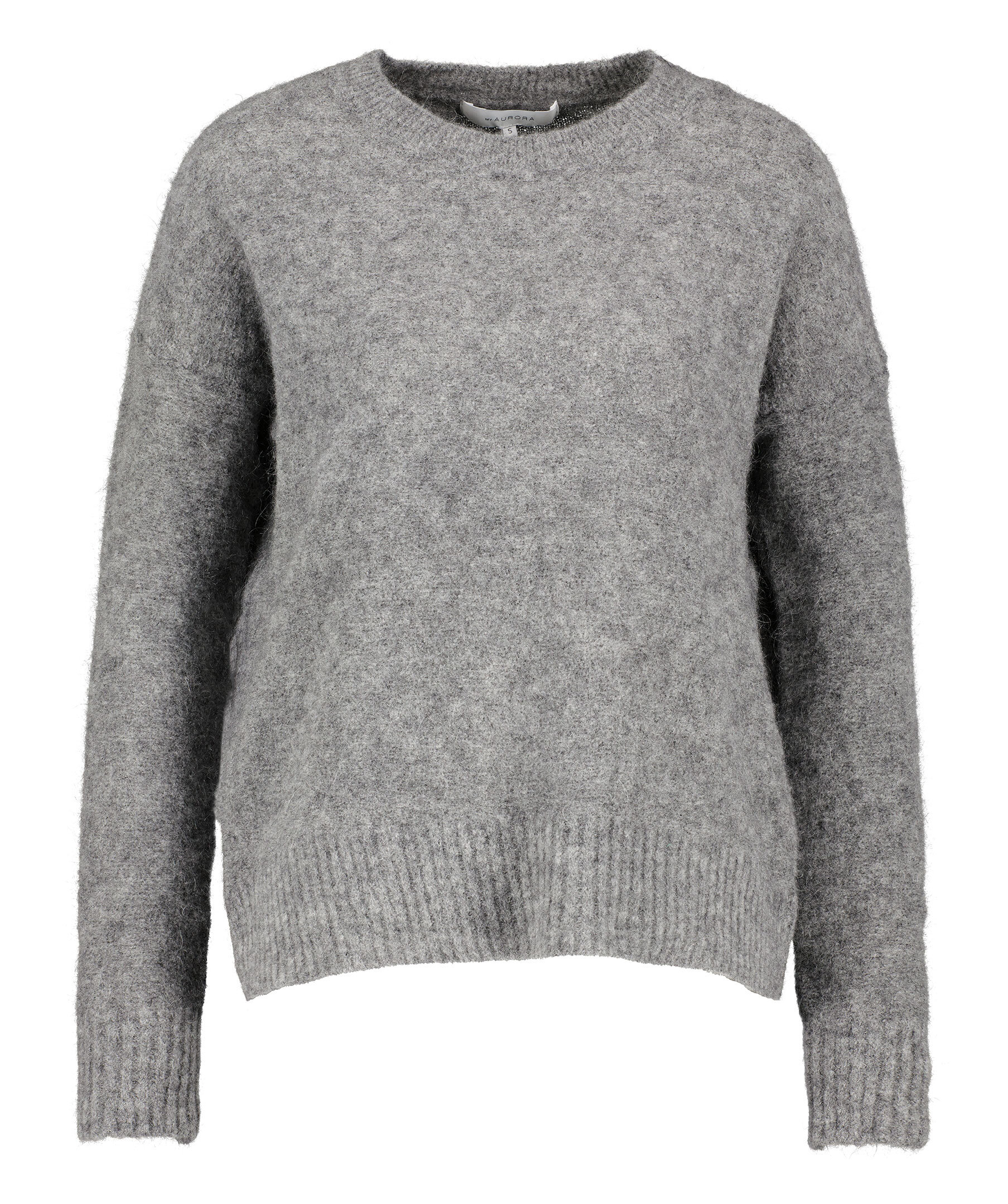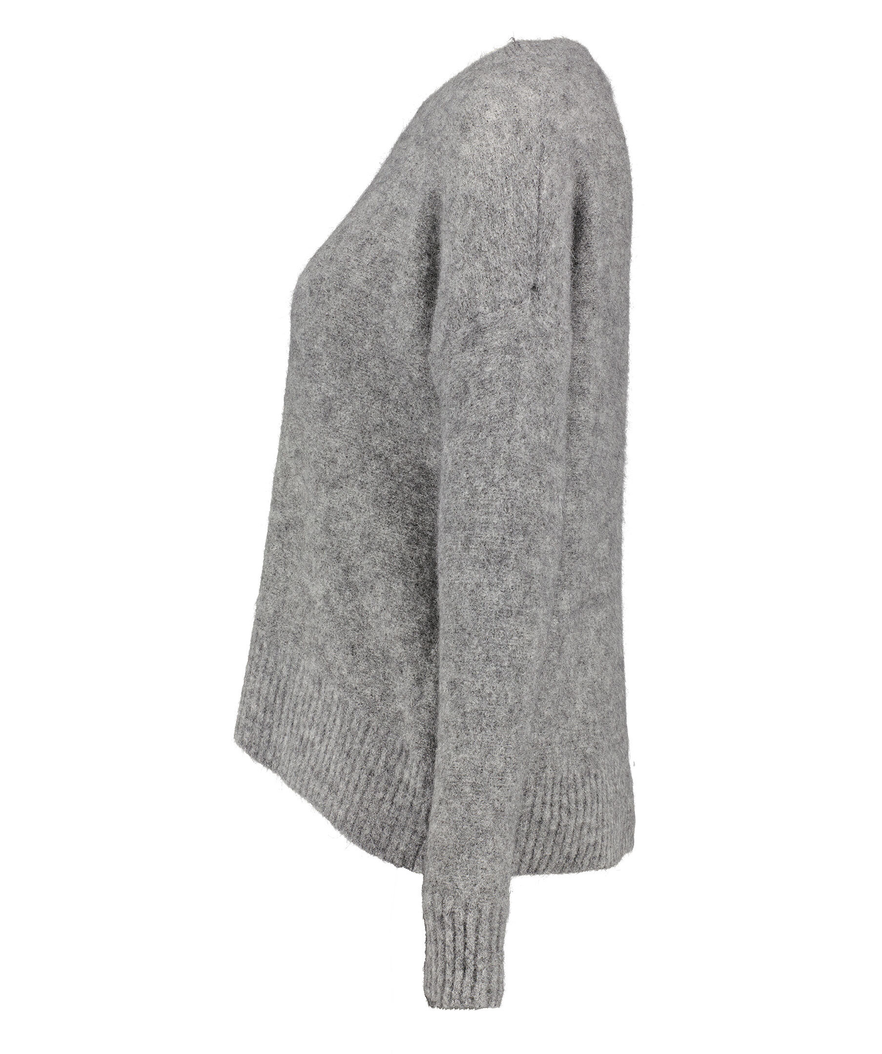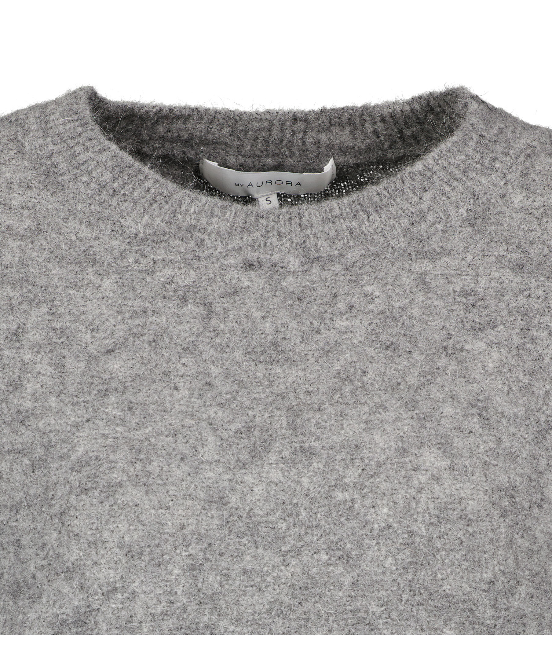Grå, stickad pullover tröja från My Aurora. Tillverkad i en ull- och mohairblandning. Ribbstickad krage samt muddar vid ärm- och plaggslut. Avslappnad passform.
