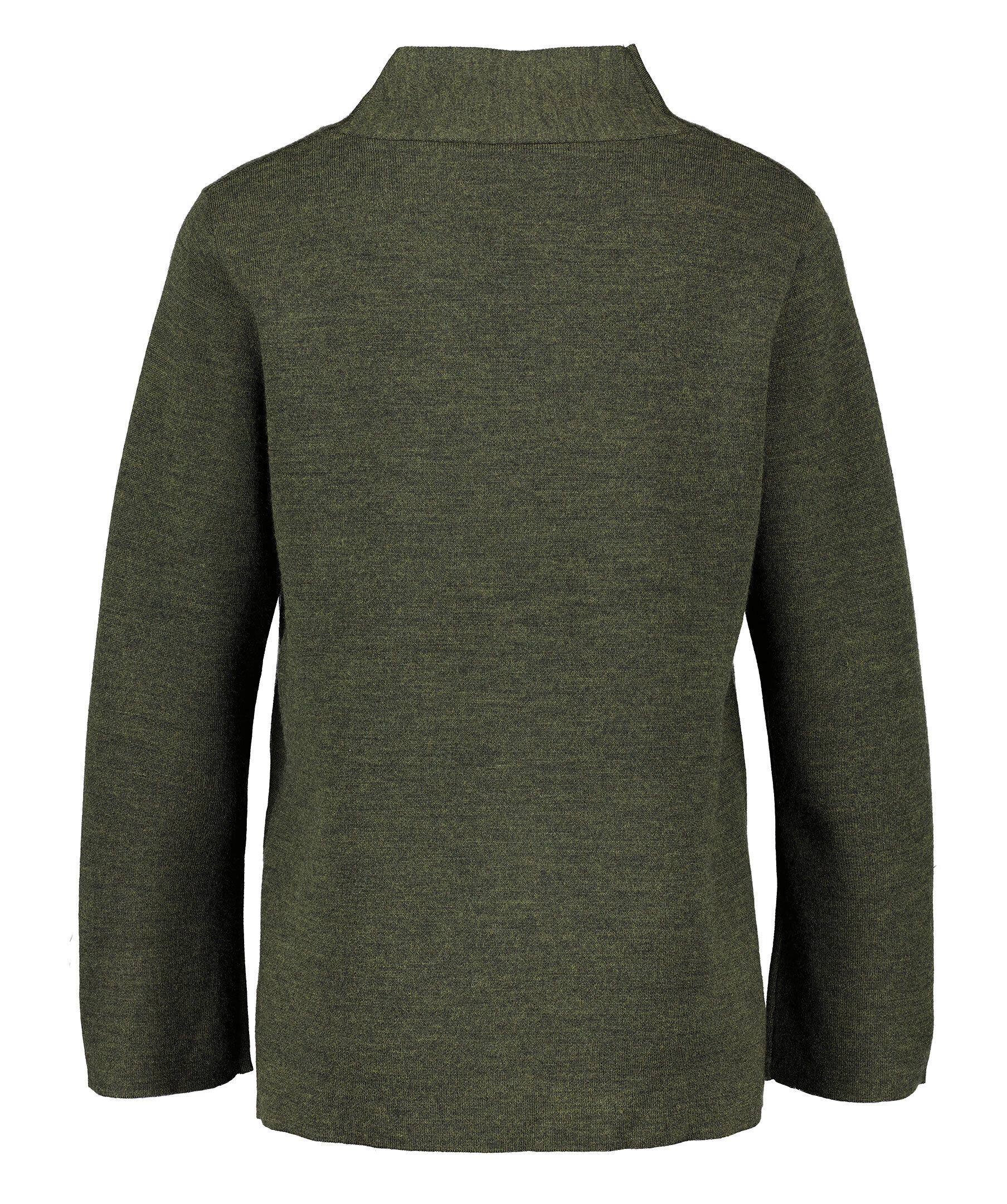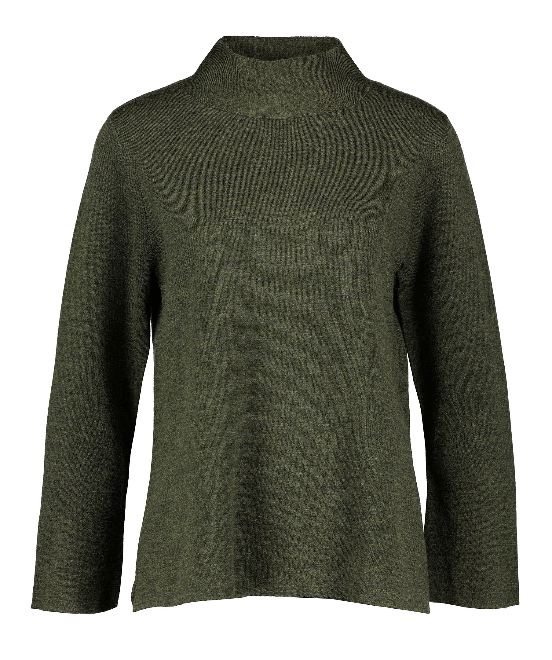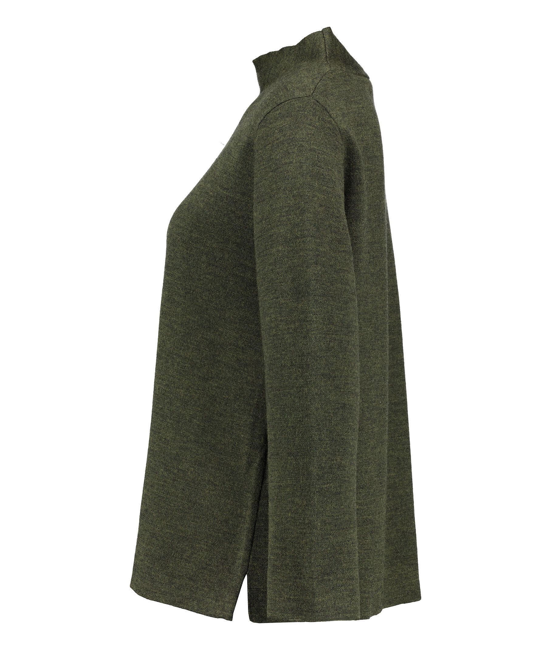Mörkgrön, finstickad pullover tröja från My Aurora. Något högre krage samt korta slitsar i sidorna. Tillverkade i 100% merinoull. Avslappnad passform.
