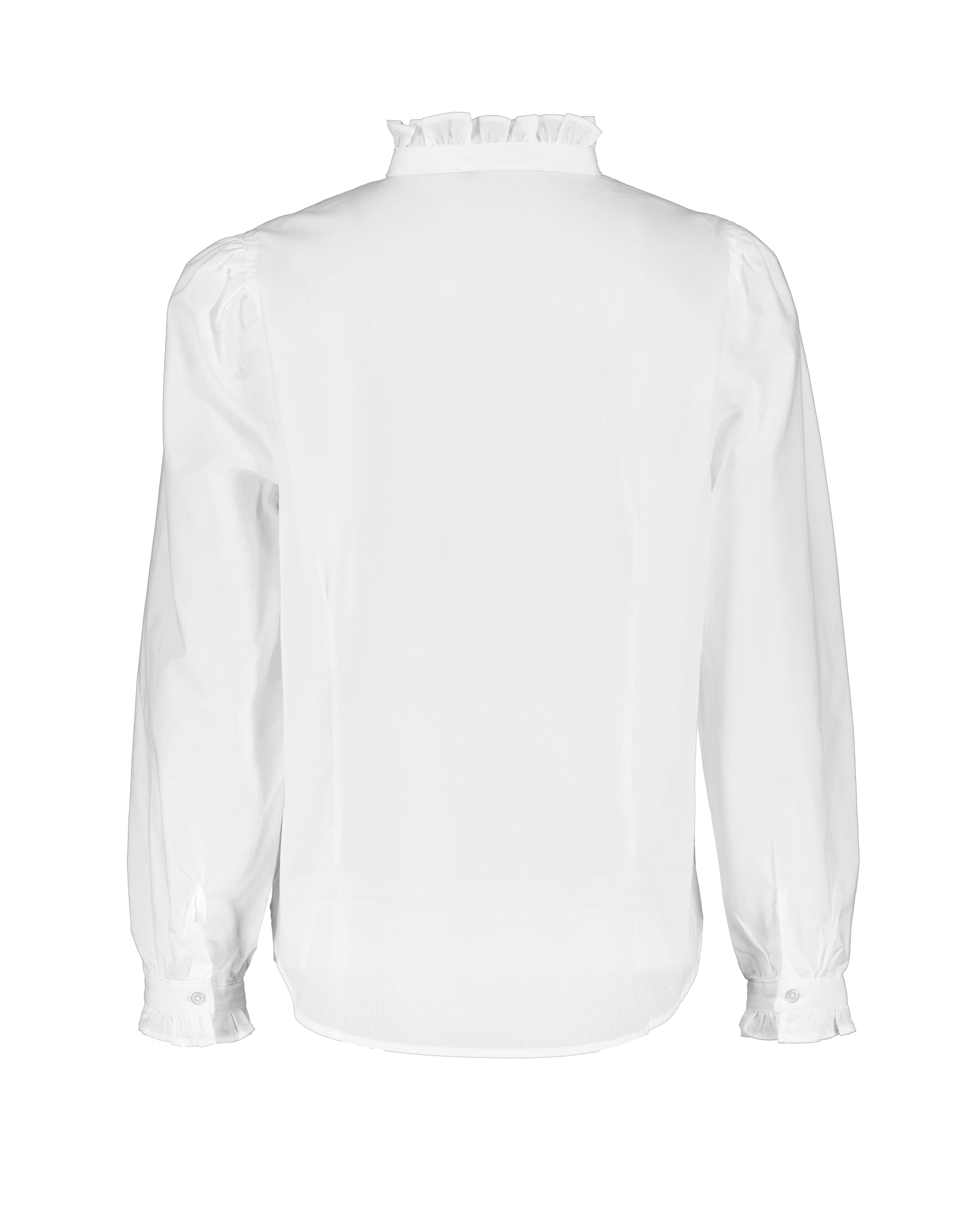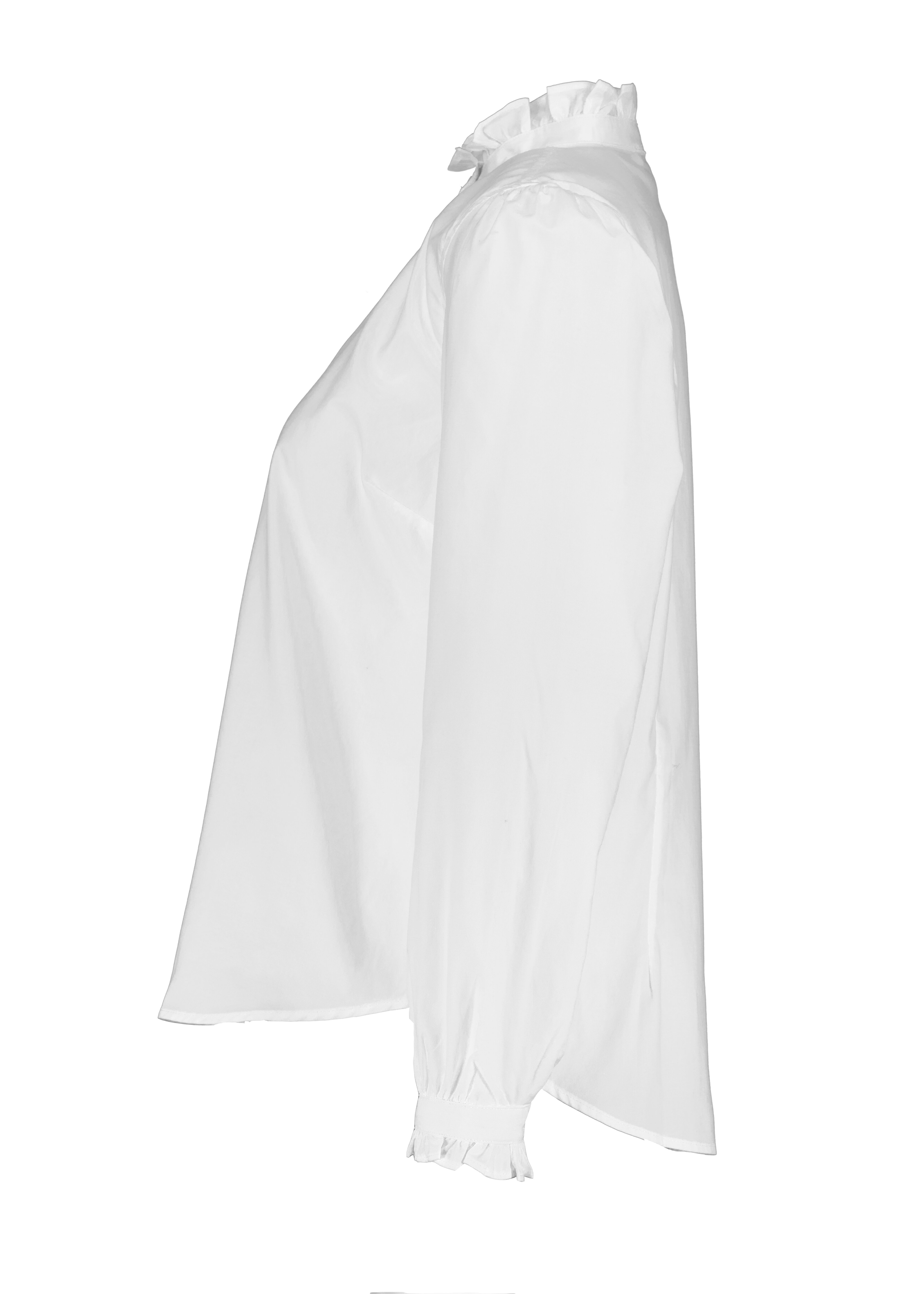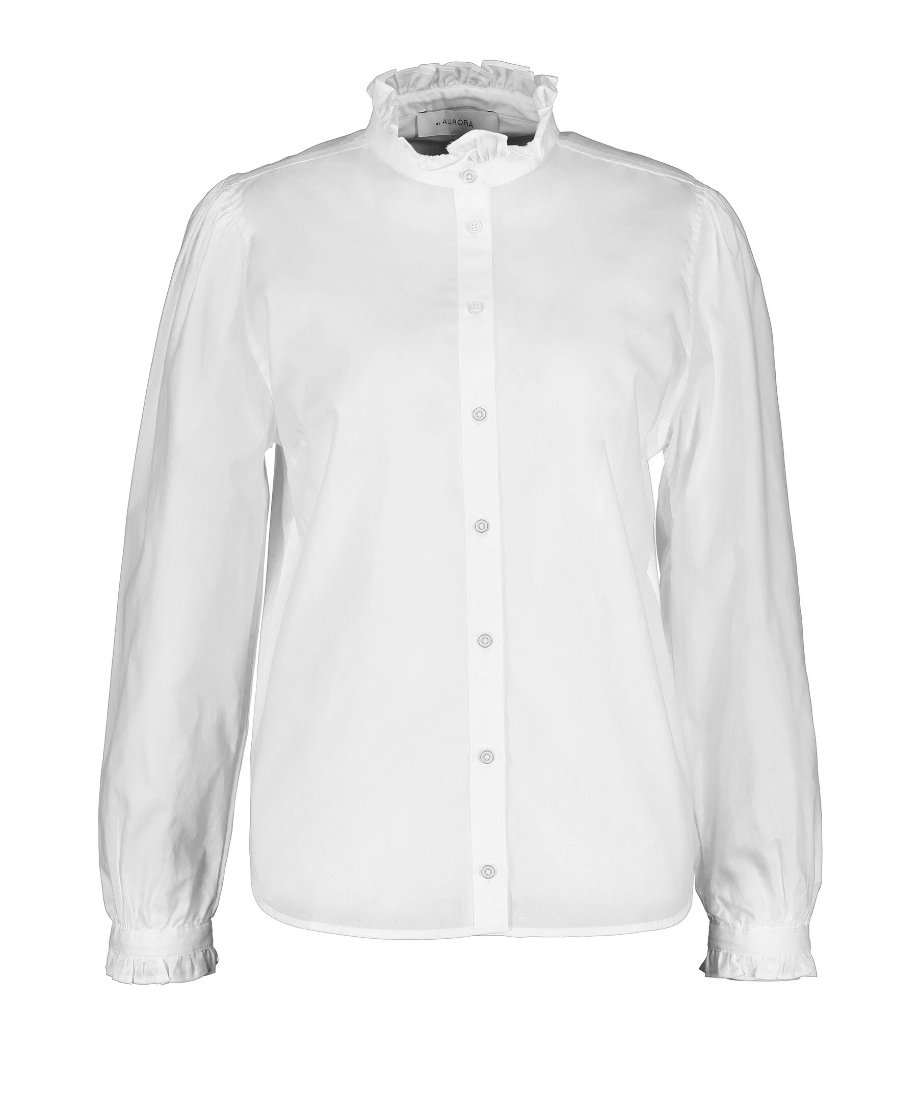 Vit blus med knappar hela vägen framtill från My Aurora. Blusen har en något högre krage med volanger samt volanger vid ärmslut. Tillverkad i bomull.