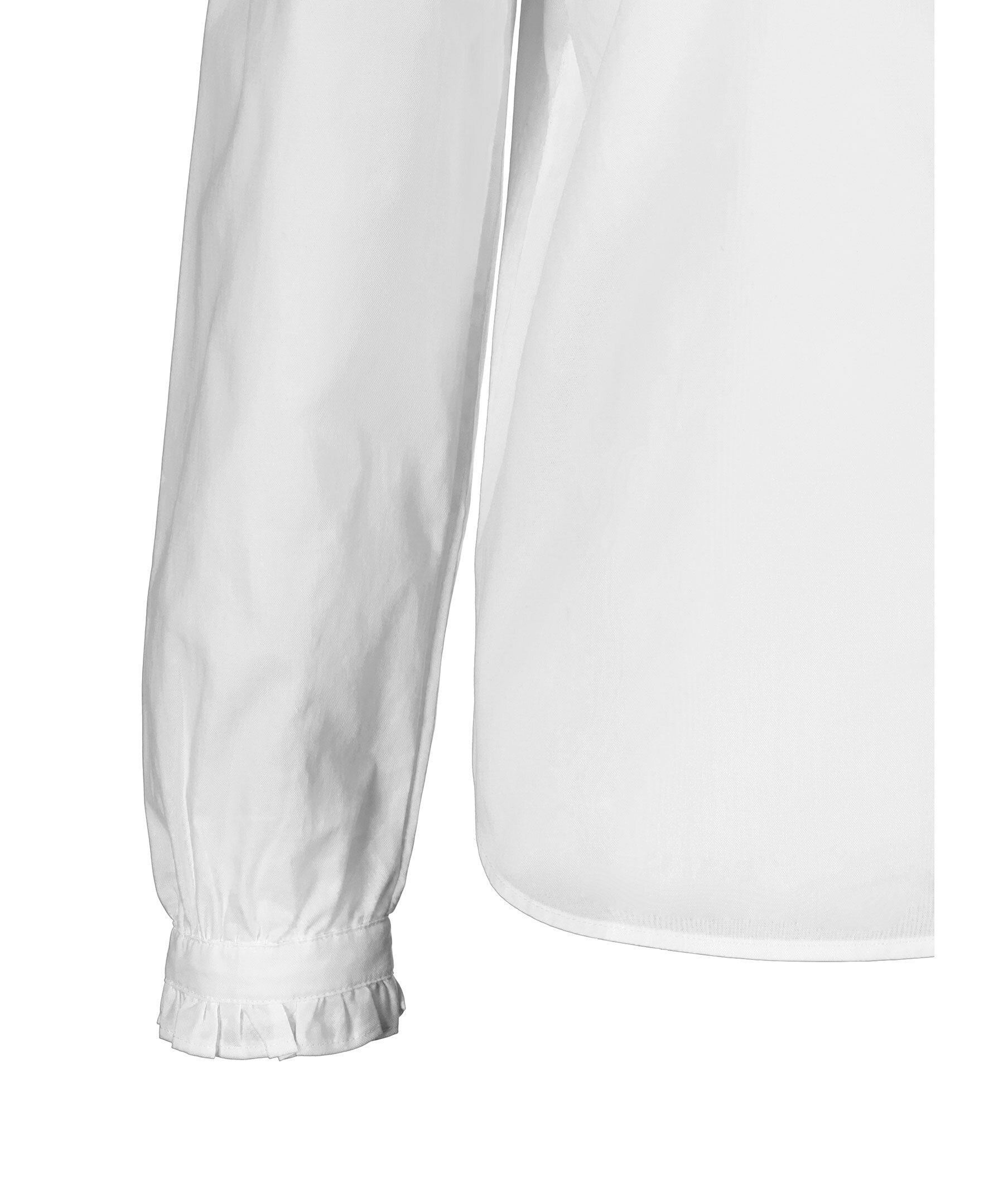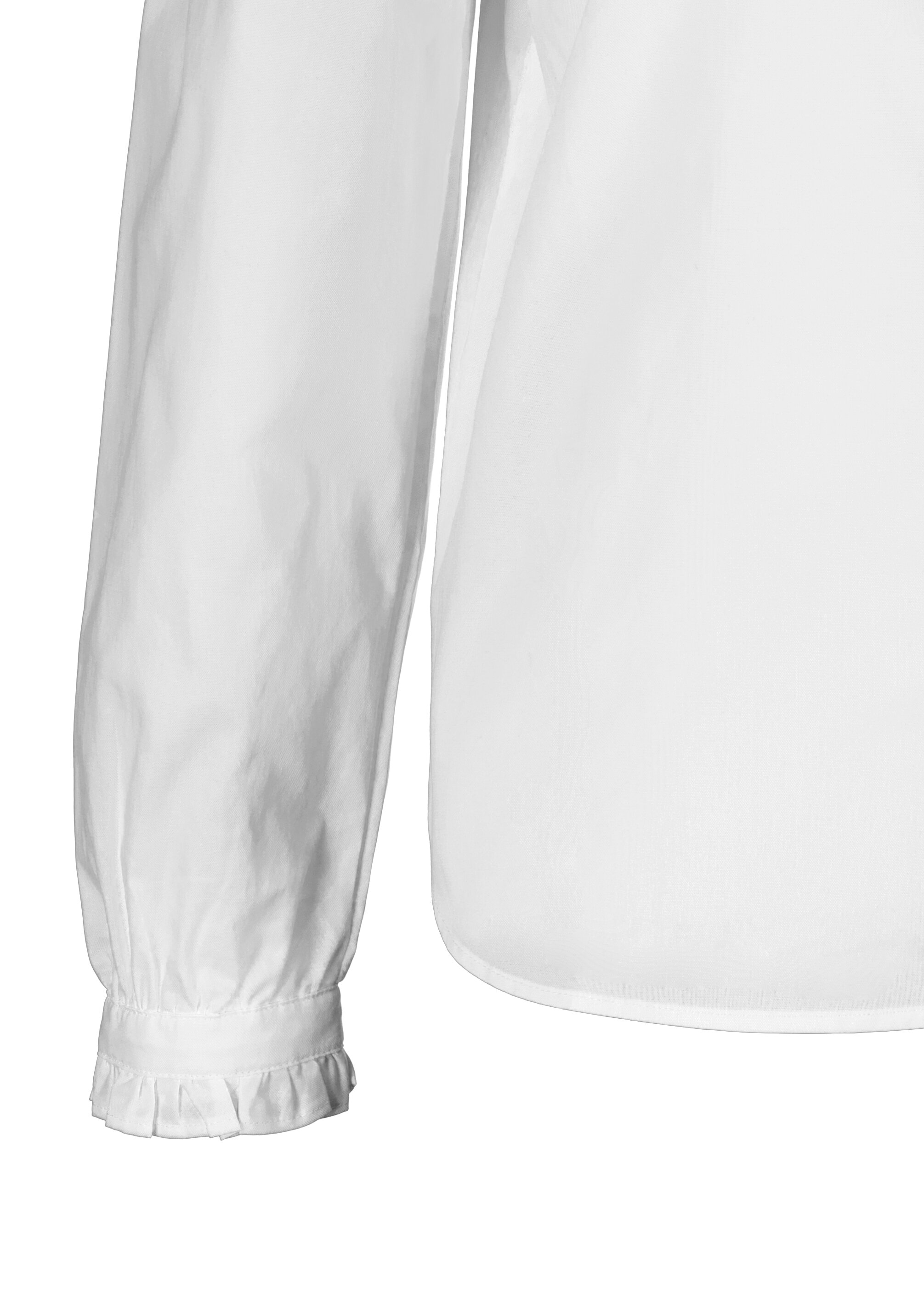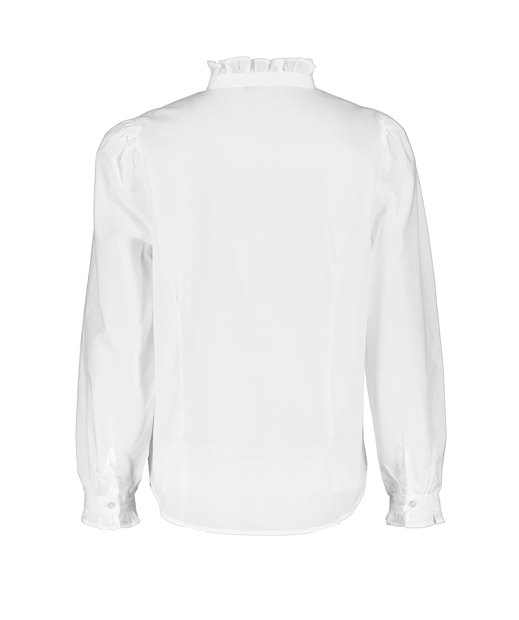 Vit blus med knappar hela vägen framtill från My Aurora. Blusen har en något högre krage med volanger samt volanger vid ärmslut. Tillverkad i bomull.