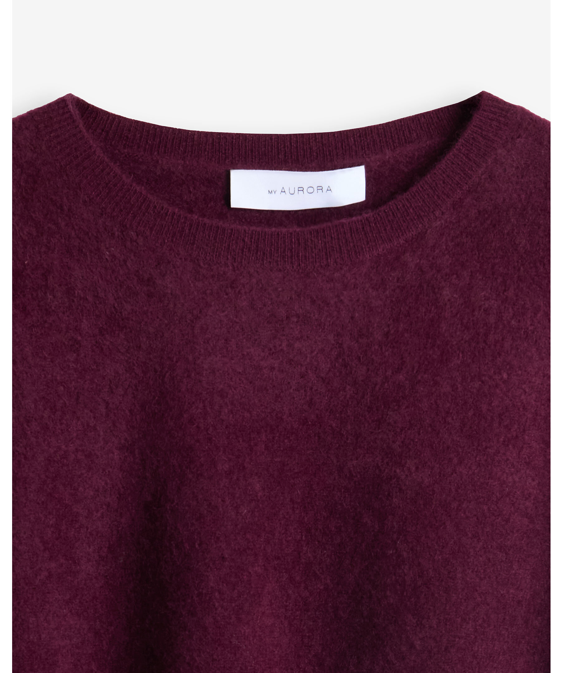 Vinröd, stickad och borstad pullover från My Aurora. Tröjan har rundad och ribbstickad halsringning samt ribbstickad muddar vid ärm- och plaggslut. Tillverkade i 100% kashmir.
