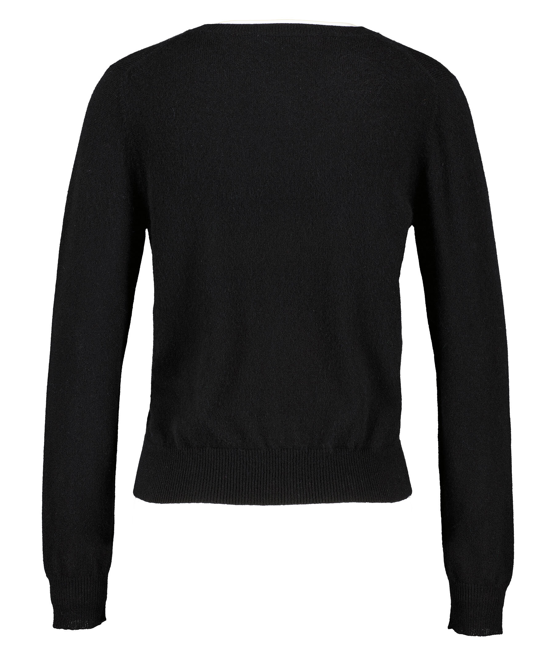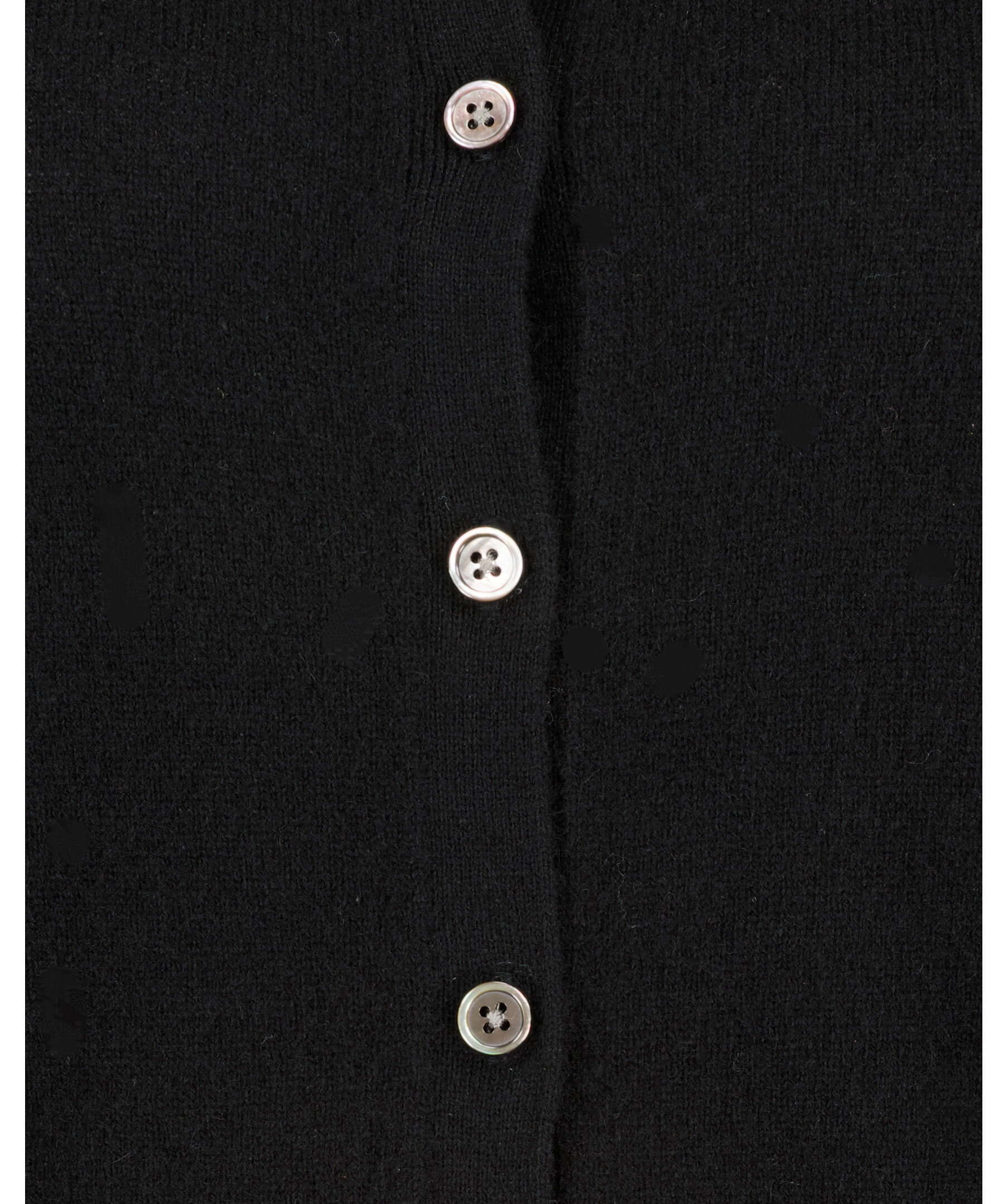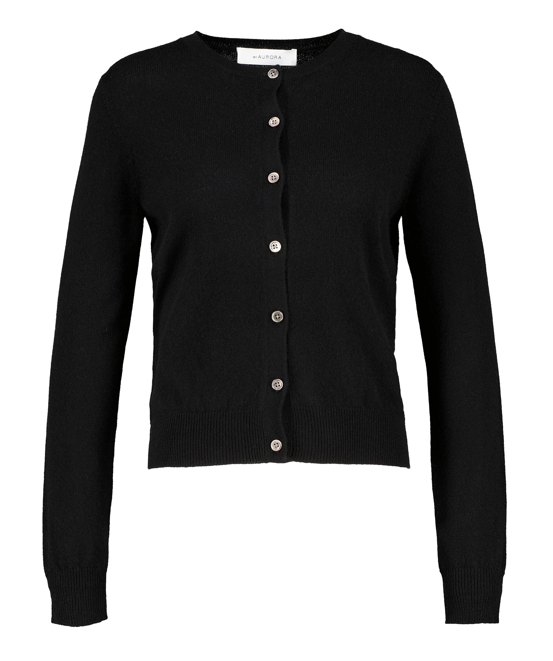 Svart finstickad kofta från My Aurora. Stängs framtill med knappar. Rund halsringning. Ribbstickade ärm- och plaggslut. Tillverkad i 100% Kashmir.
