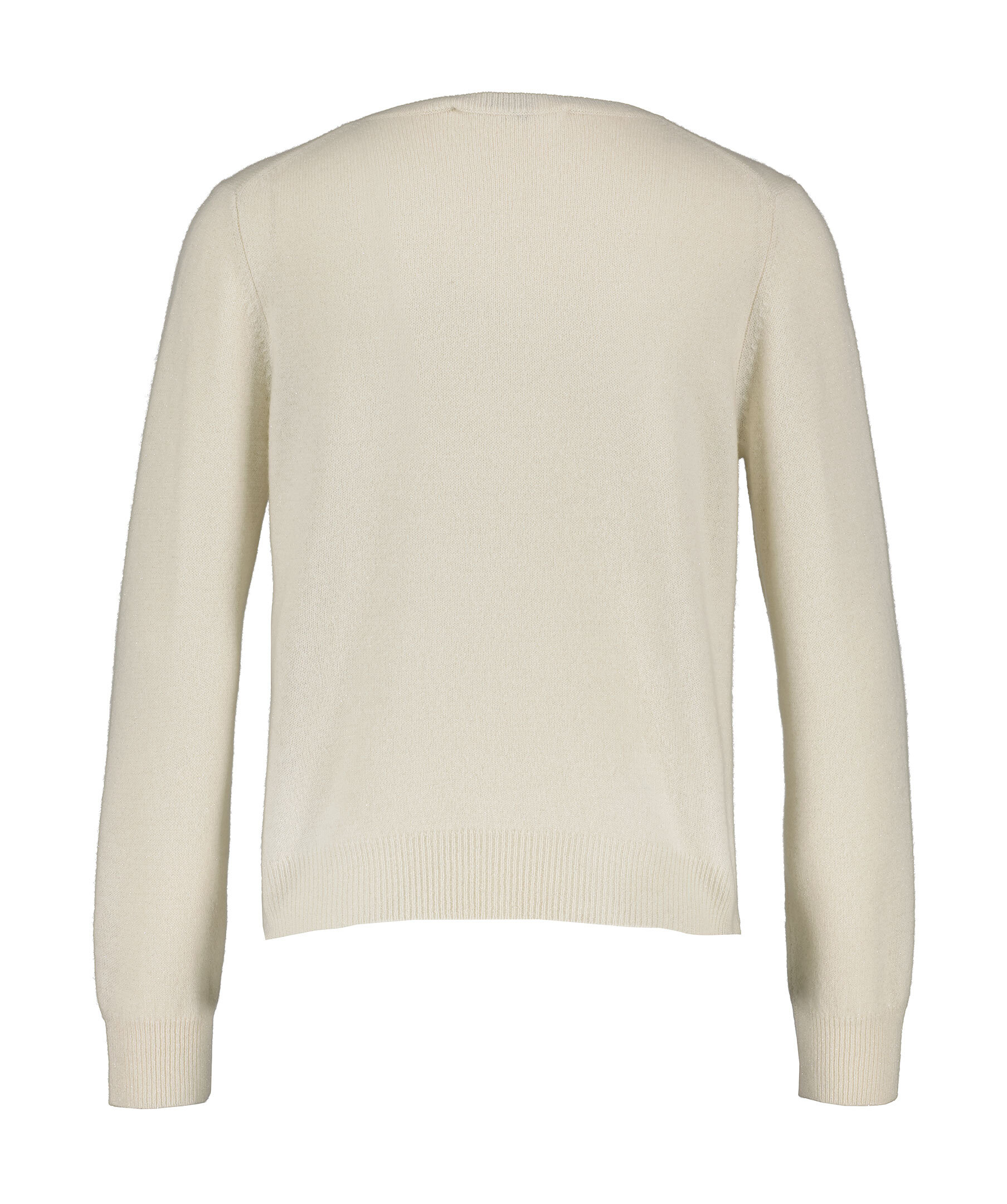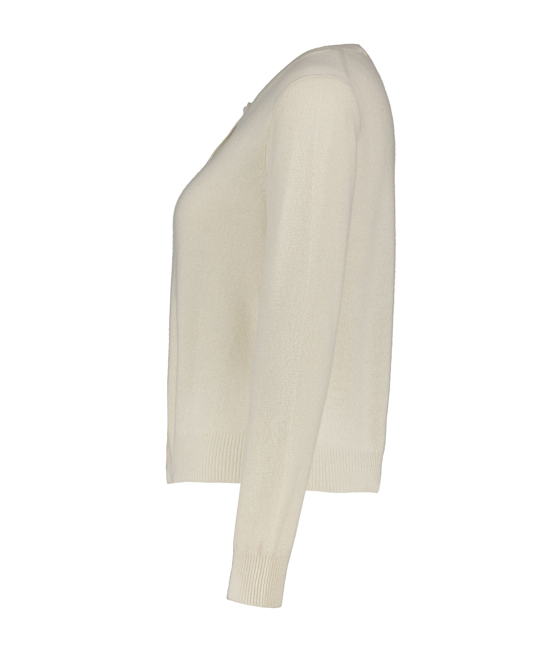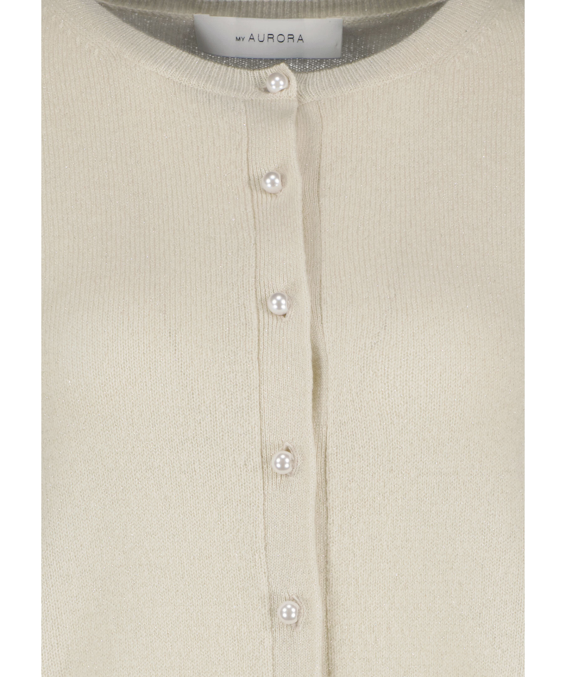 Krämvit, finstickad kofta med subtilt glitter från My Aurora. Koftan har rund och ribbstickad halsringning samt ribbstickade muddar vid ärm- och plagglsut. Stängs med pärlknappar. Tillverkad i kashmir.