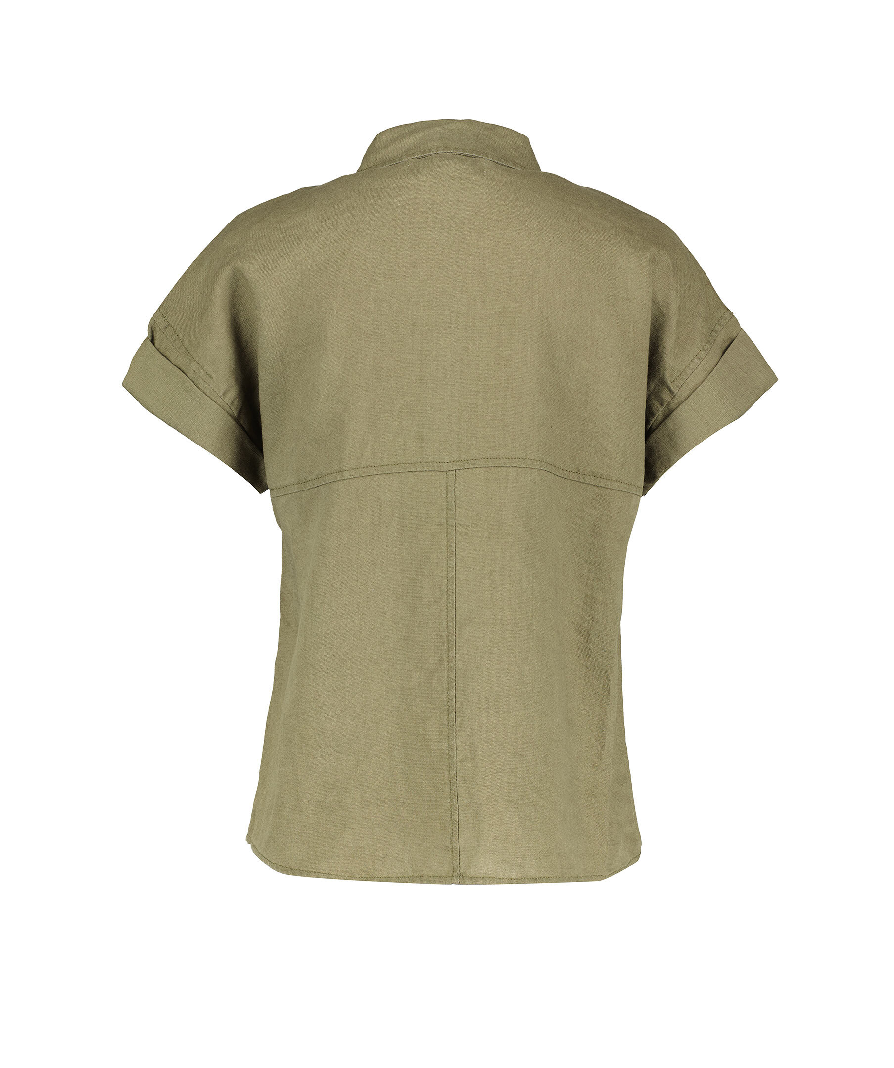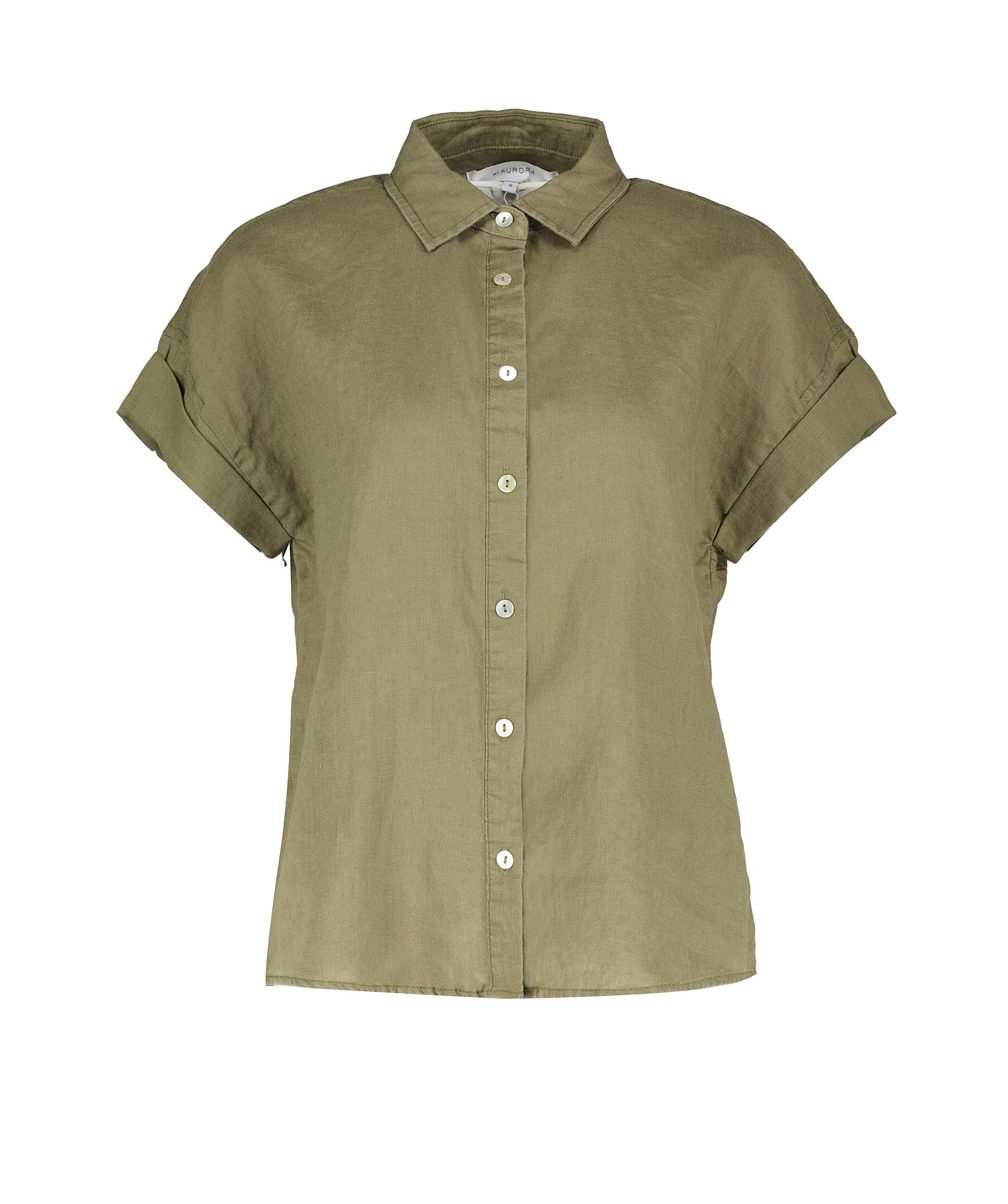 Mörkgrön kortärmad skjorta från My Aurora. Skjortan stängs med pärlemorknappar och har korta ärmar med uppvikt kant. Tillverkad i 100% lin.