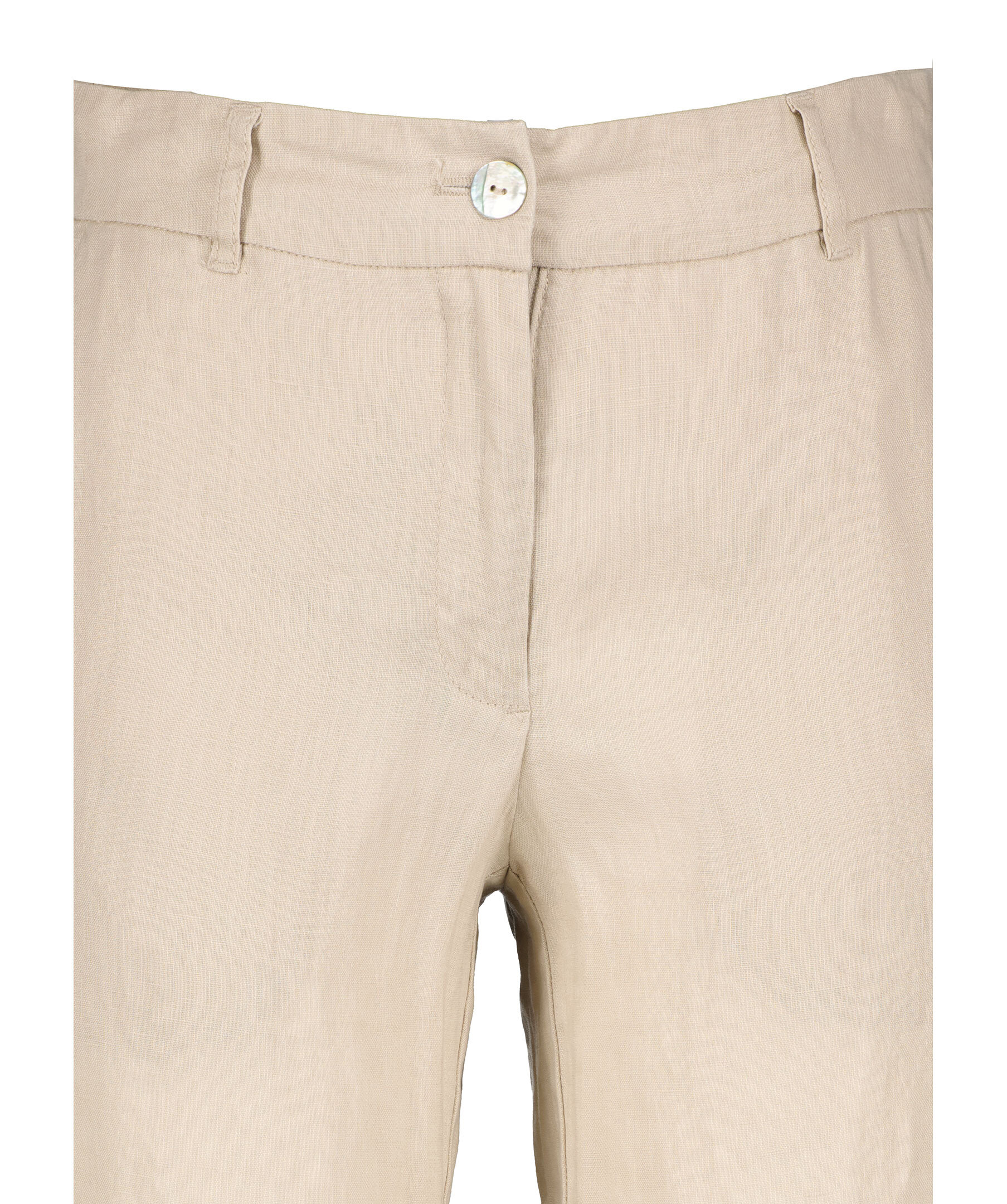 Beigea, vida linnebyxor från My Aurora. Gylf med dragkedja och knapp. Hällor för bälte. Två fickor framtill, två bakfickor. Elastisk resår i midjan. Tillverkad i 100% Linne.