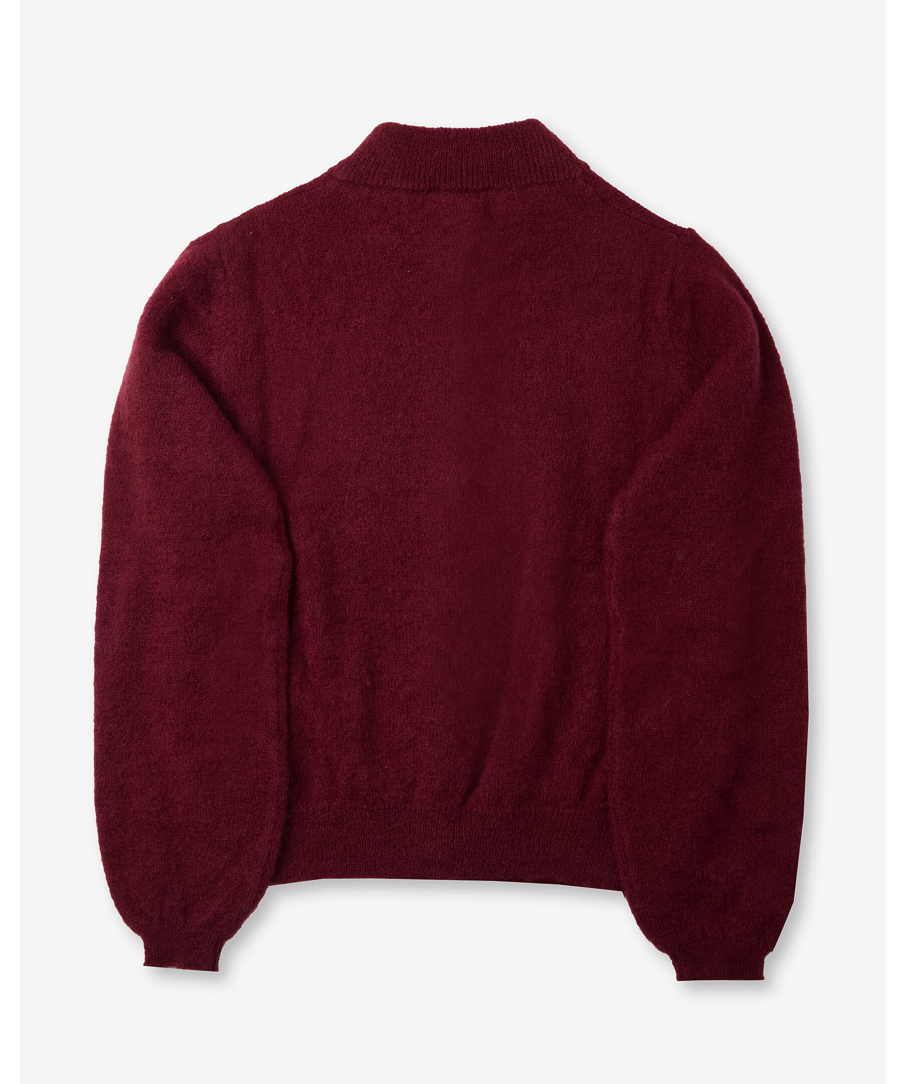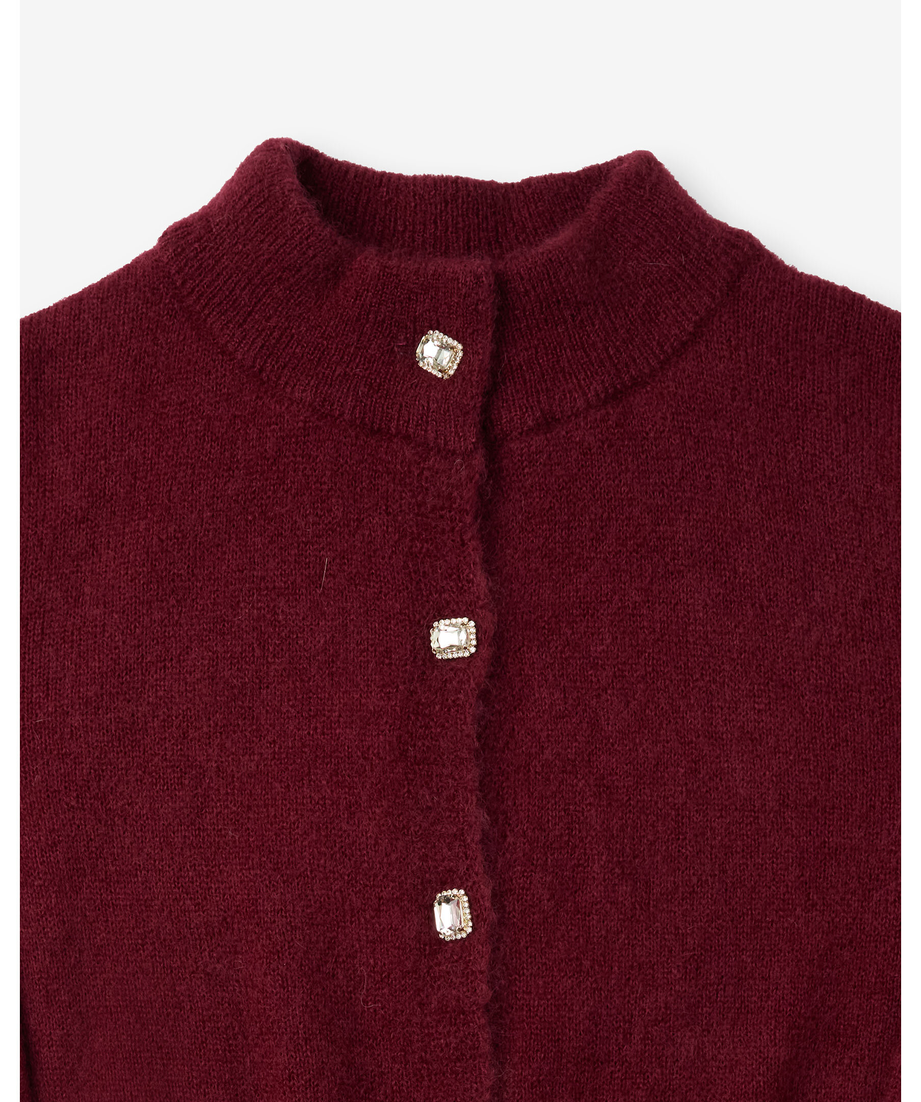 Stickad cardigan i vinrött från My Aurora. Ribbstickade muddar och dekorativa knappar liknande diamanter. Gjord i en mohairmix.