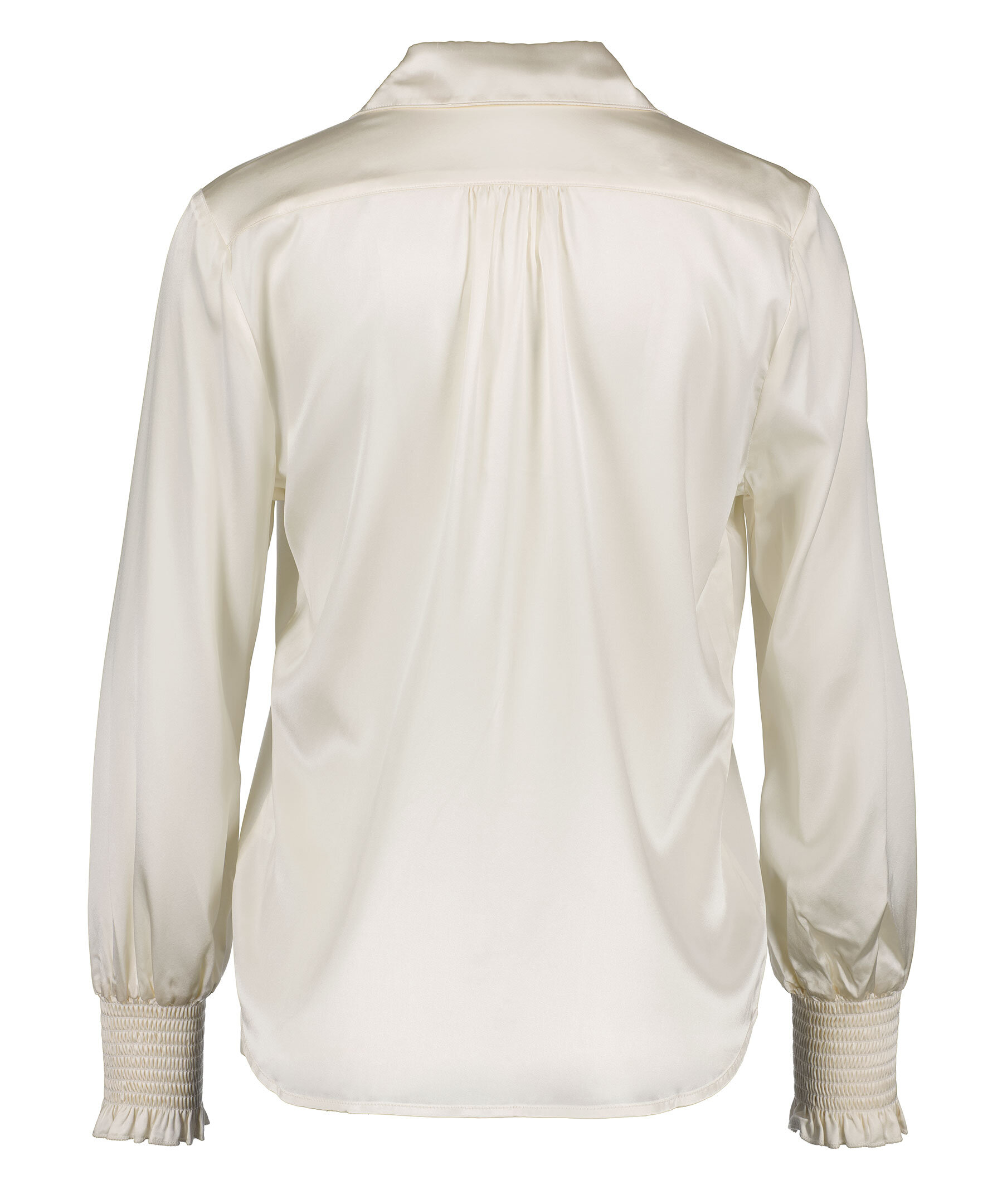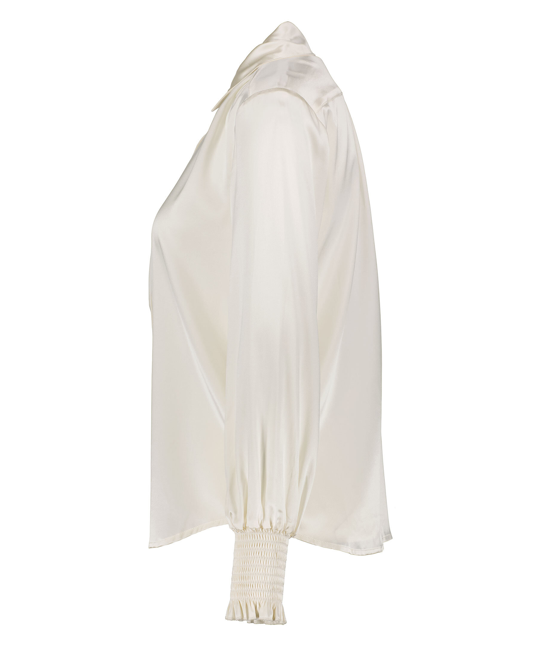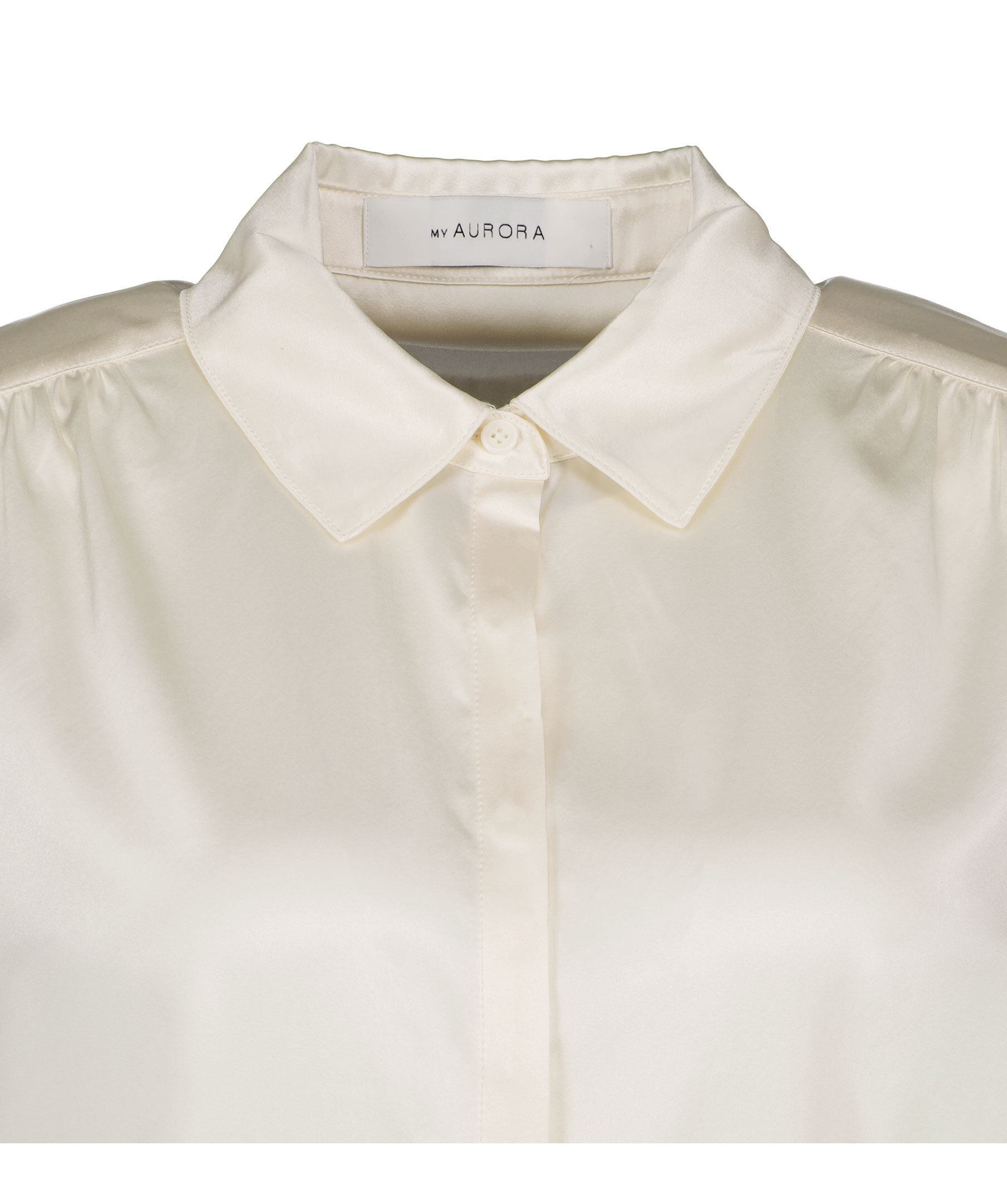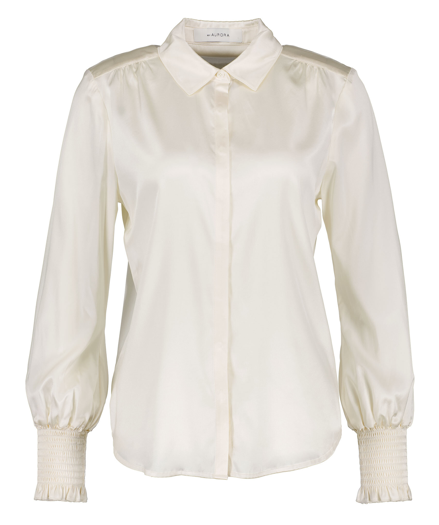 Benvit silkesblus från My Aurora. Dold knappstängning framtill samt smockdetalj vid ärmslut. Tillverkad i en silkesblandning.