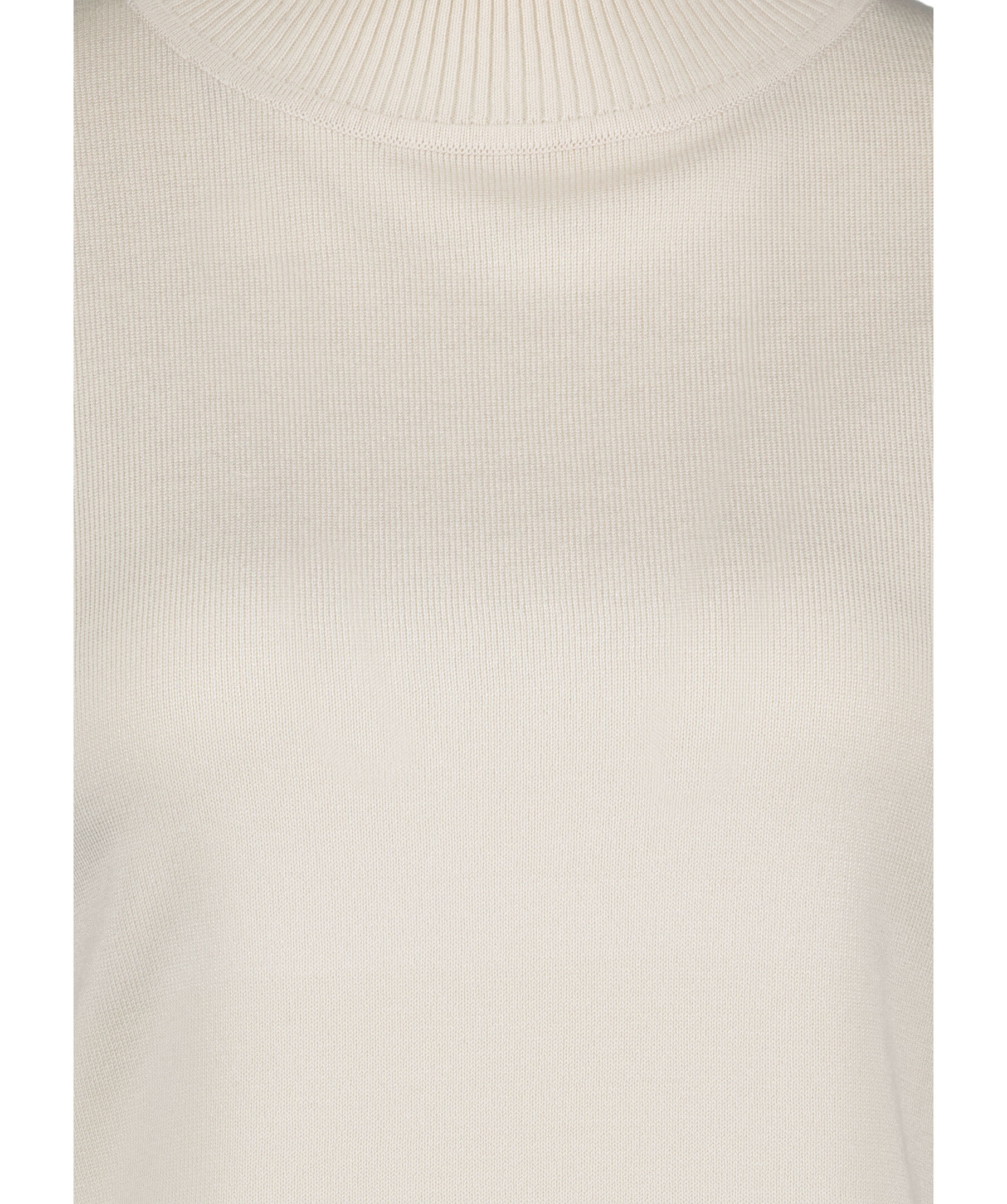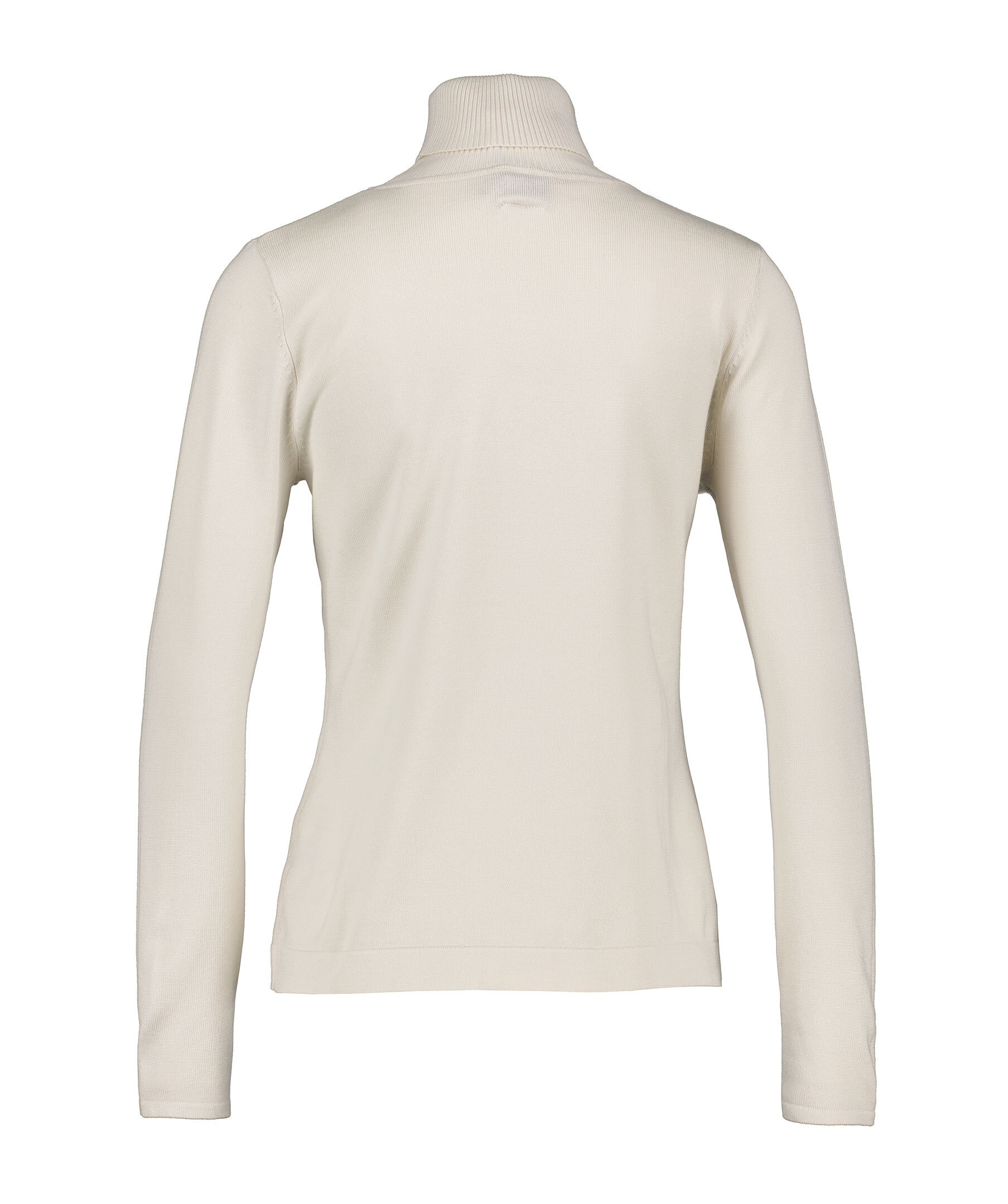Sandfärgad, finstickad polotröja från My Aurora. Tröjan har en hög, ribbstickad krage samt ribbstickade muddar vid plaggslut. Tillverkad i en viskosblandning.