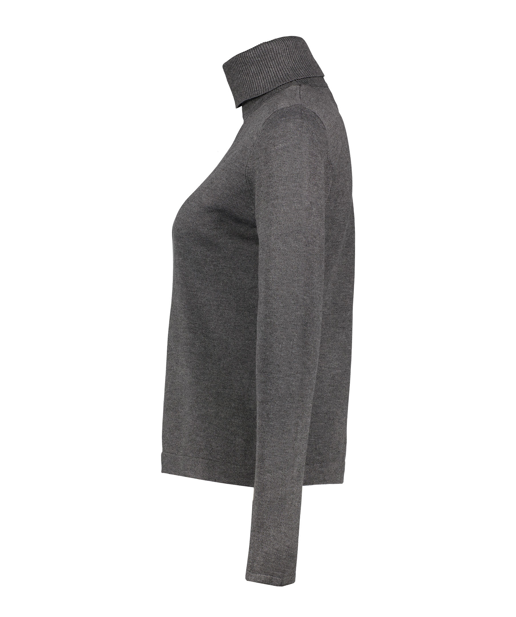Grå, finstickad polotröja från My Aurora. Tröjan har en hög, ribbstickad krage samt ribbstickade muddar vid plaggslut. Tillverkad i en viskosblandning.