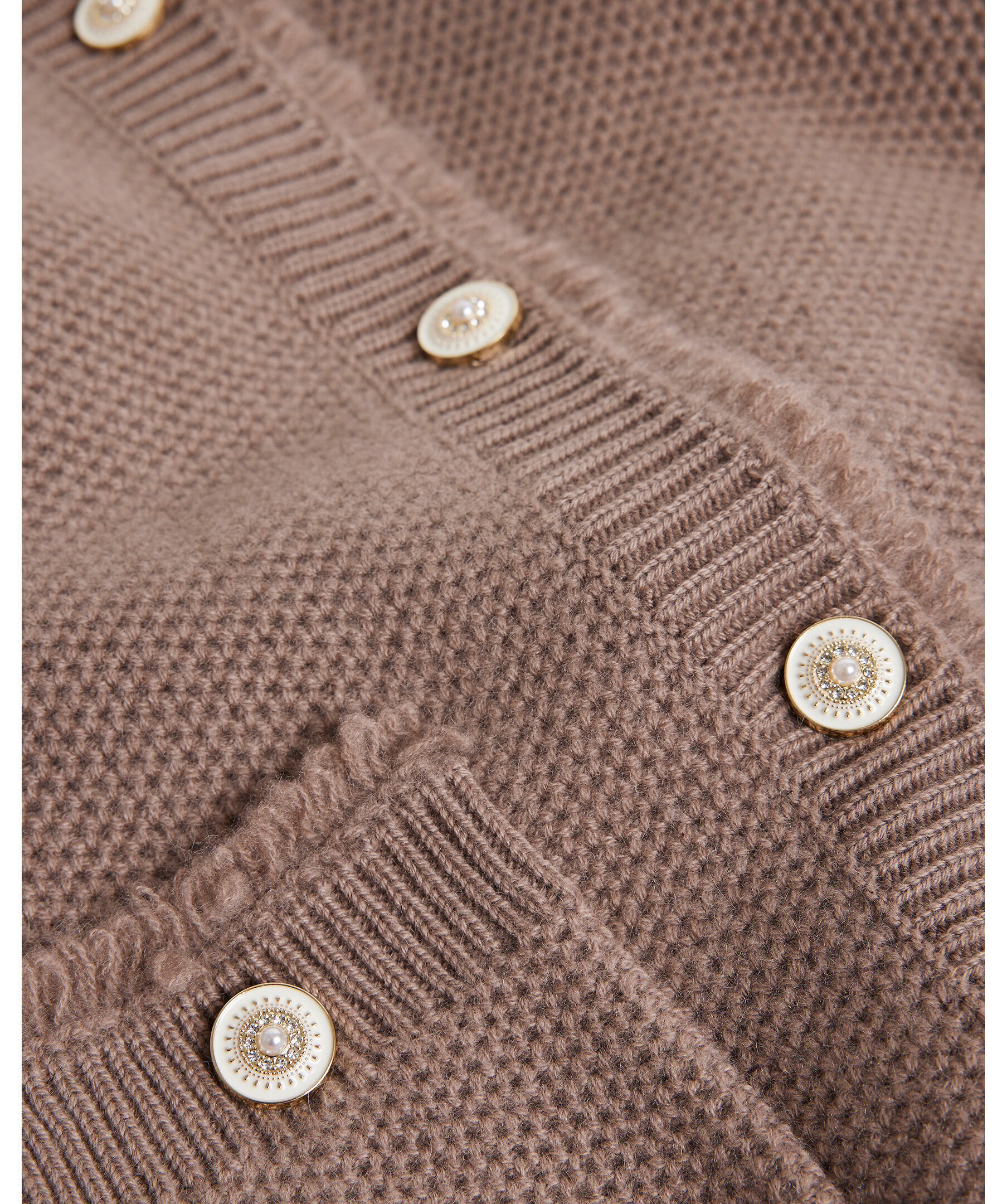 Kofta från My Aurora i 100% cashmere. Koftan är strukturstickad, har rundhals, dekorativa strassknappar och fickor framtill.