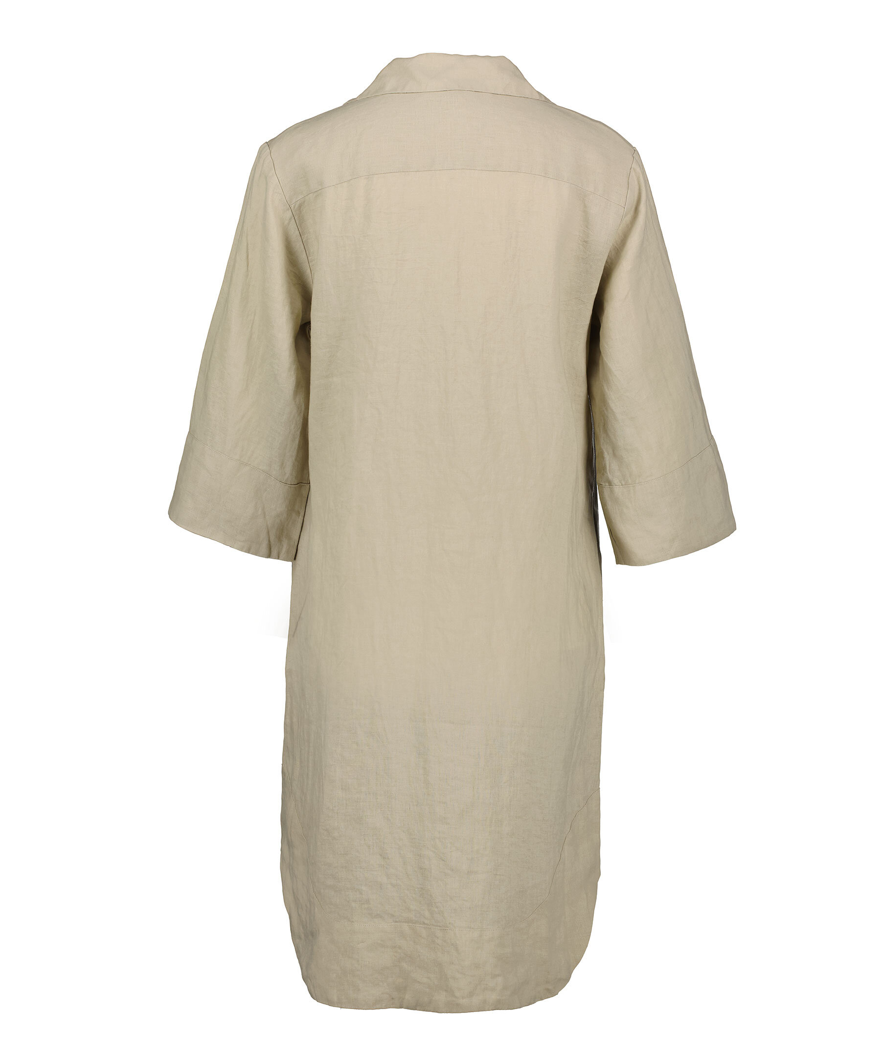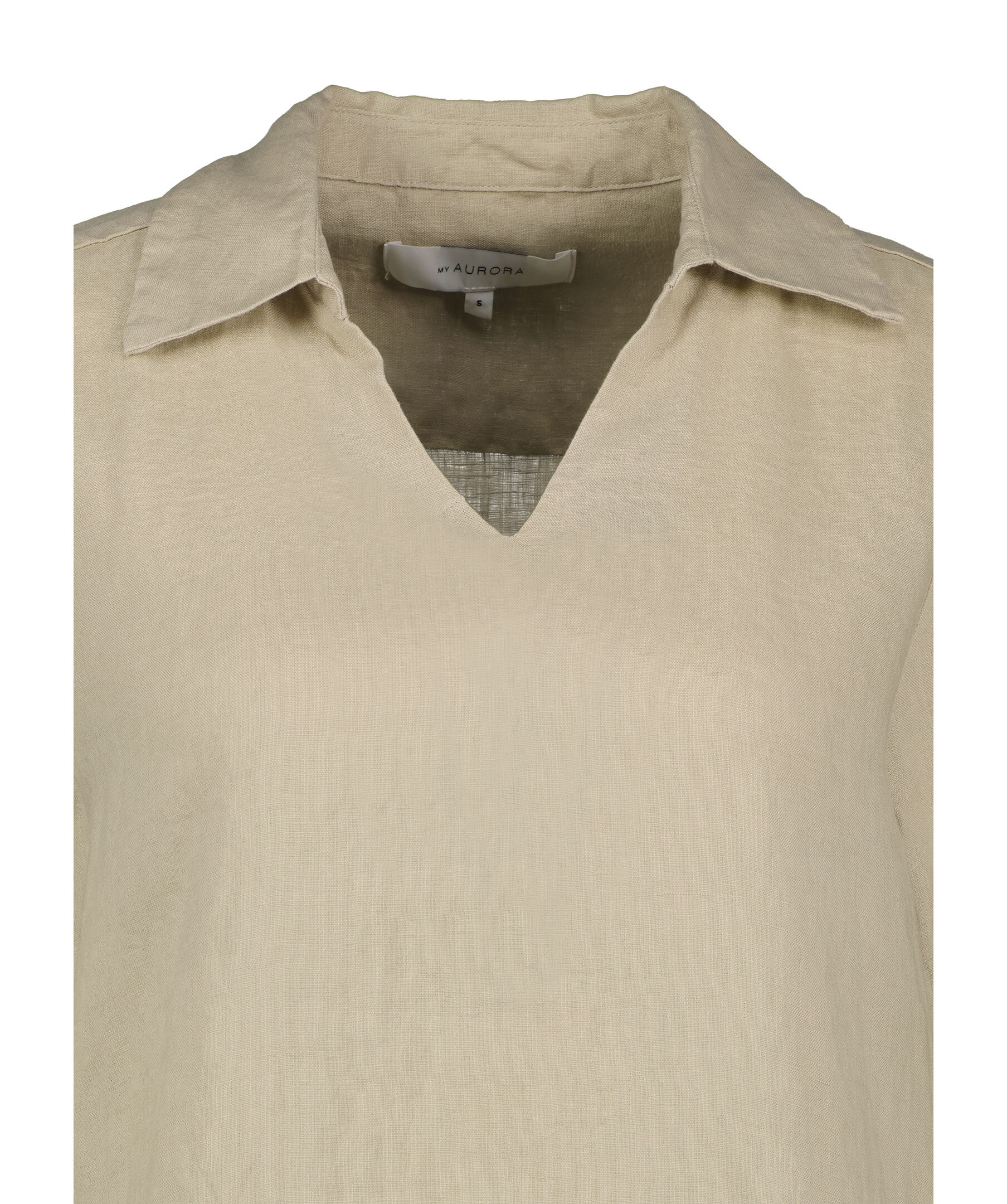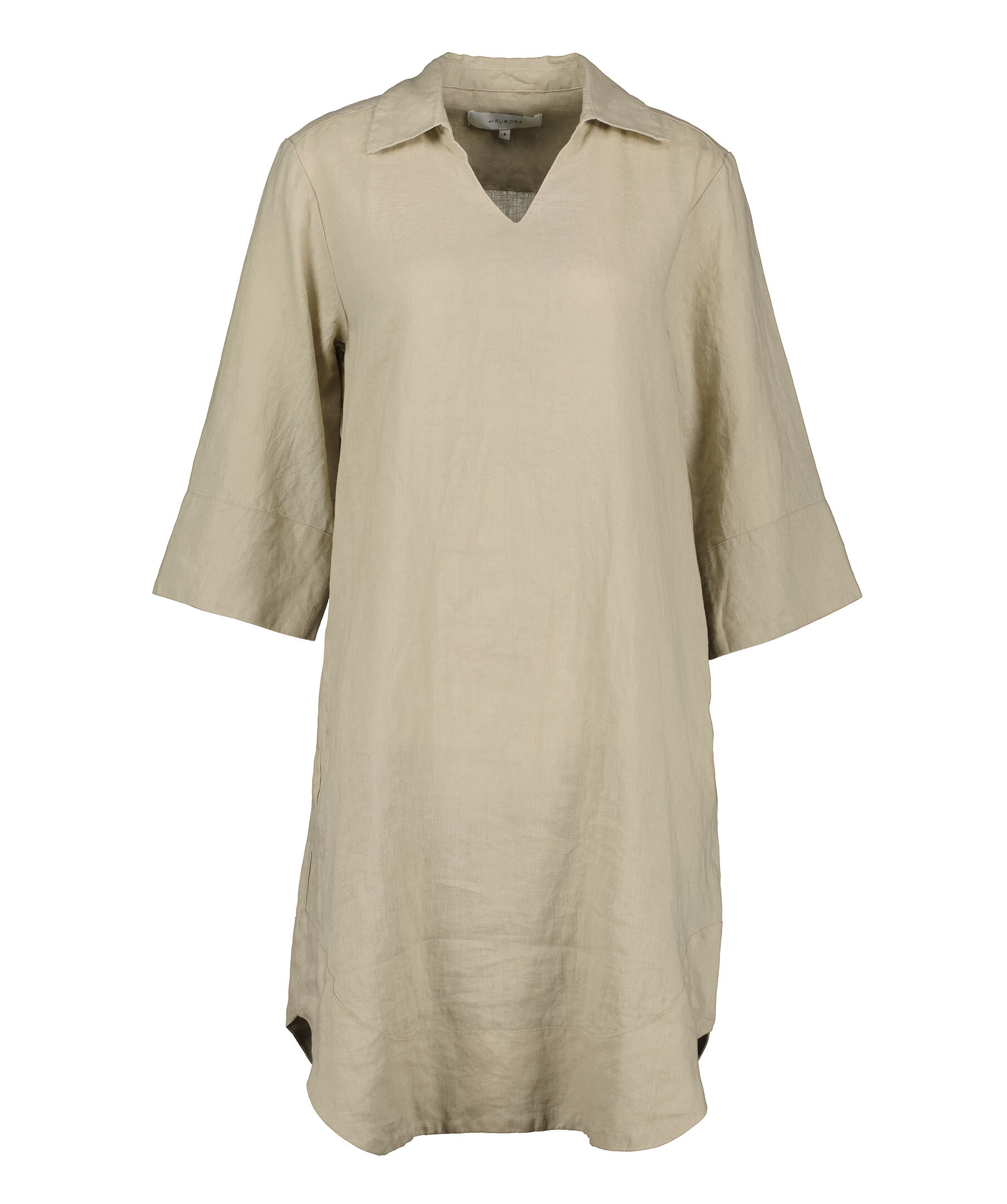 Beige klänning i linne från My Aurora. V-ringad med spetsig krage. Fickor i sidorna. Tillverkad i 100% linne. Rundat plaggslut. Trekvartsärm.