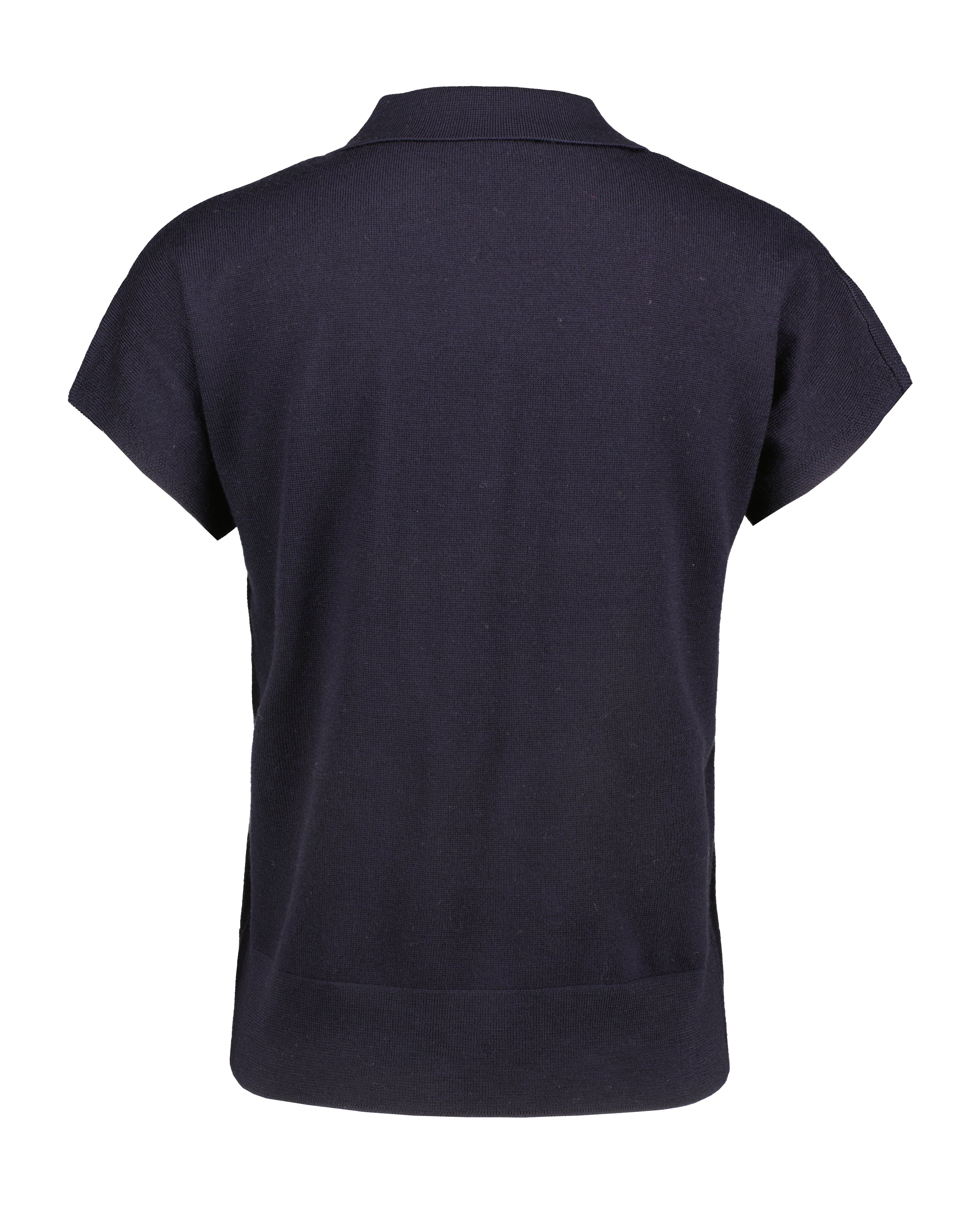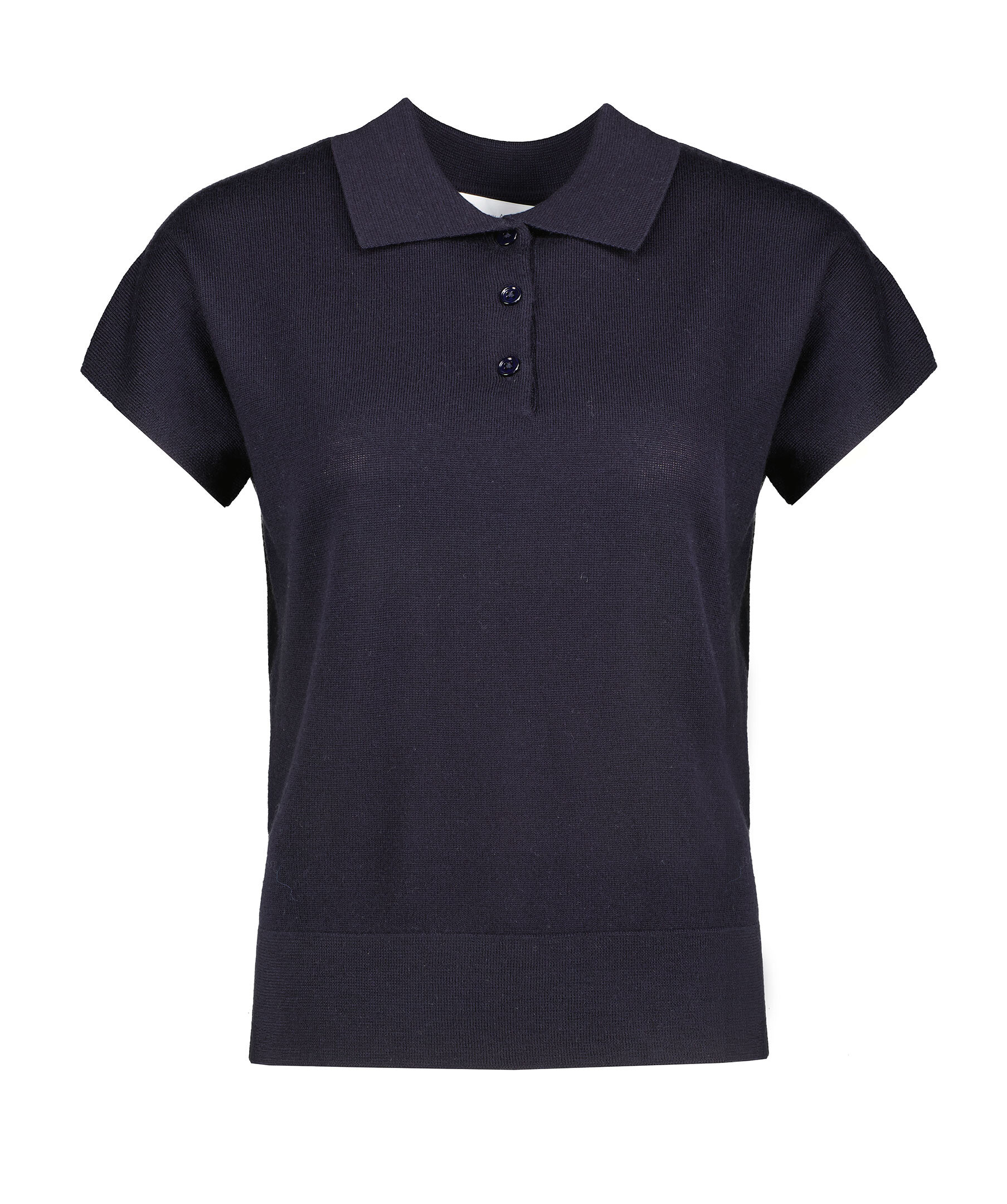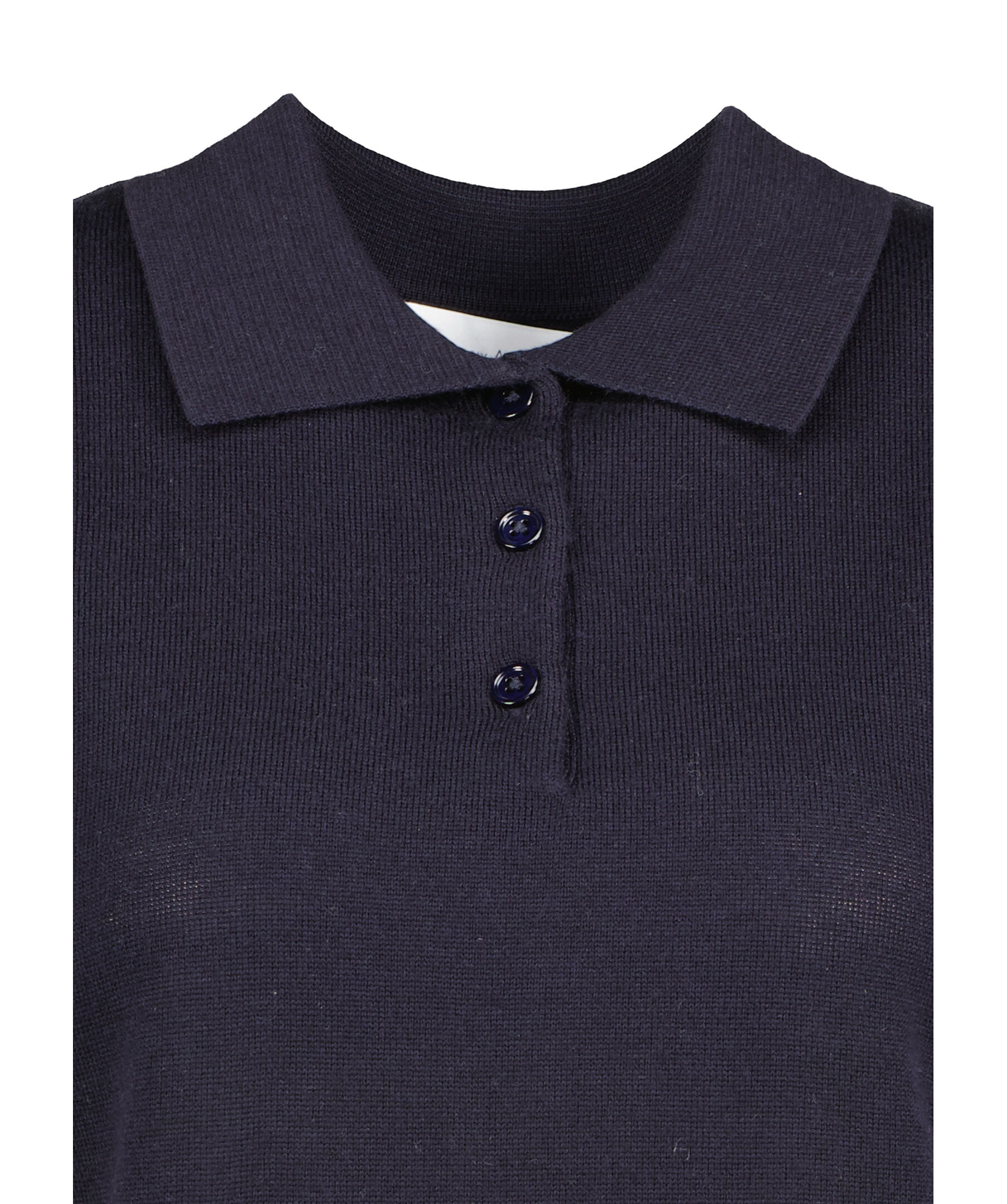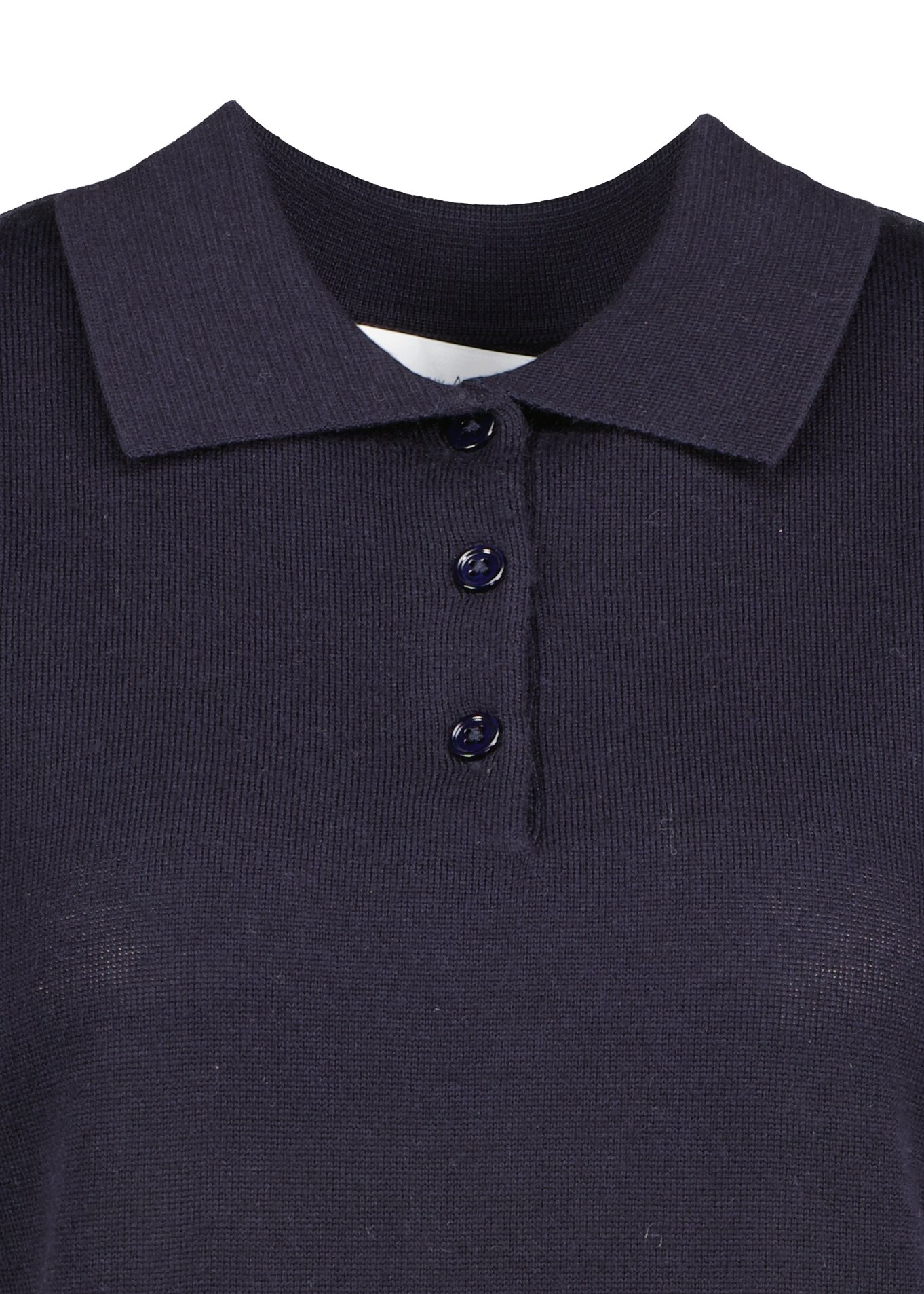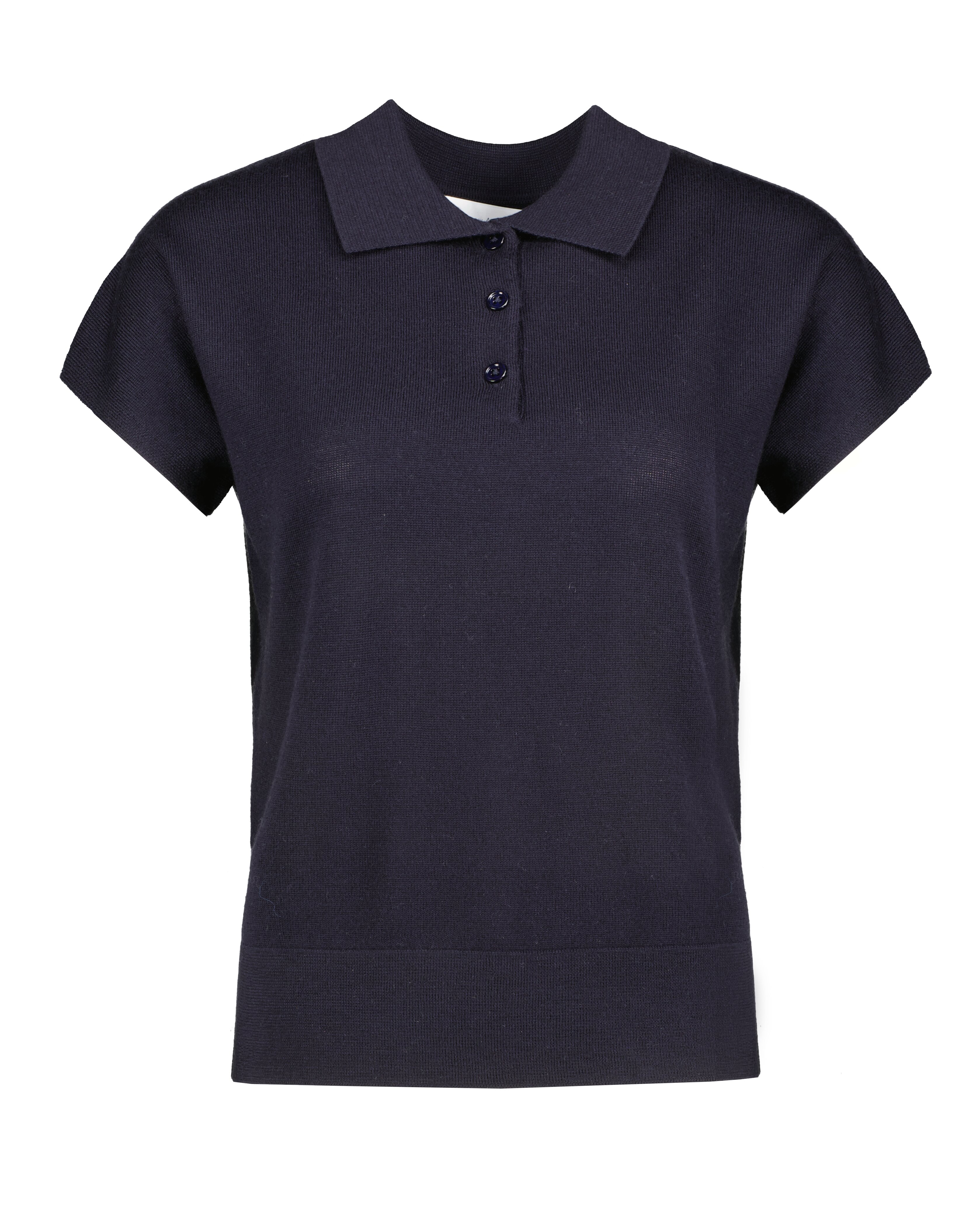 Mörkblå, finstickad piké från My Aurora. Pikén är kortärmad och har tre knappar framtill. Tillverkad i merinoull.